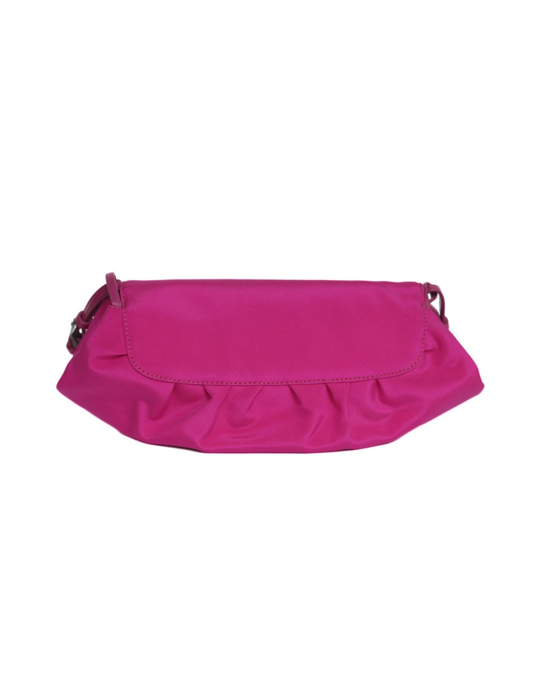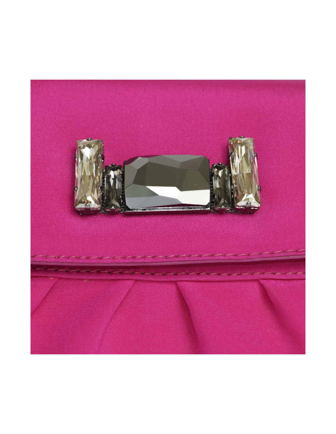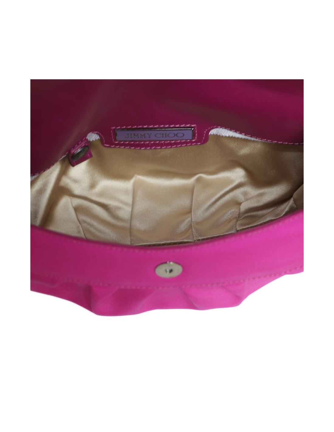 Jimmy Choo mini bag in magenta pink satin. Snap closure. The interior is in beige satin with a small patch pocket. The handle is pink leather. In very good condition.