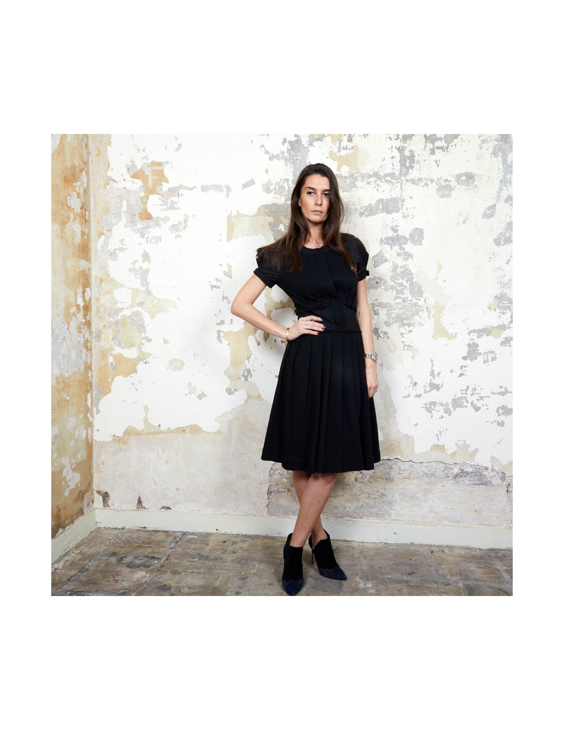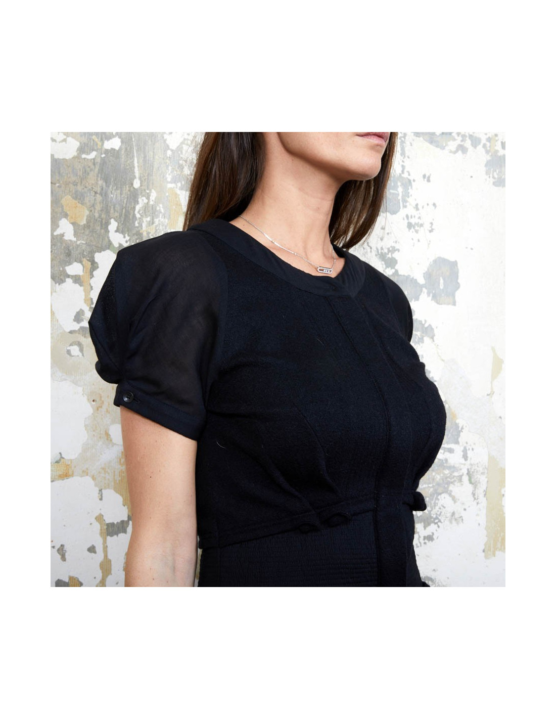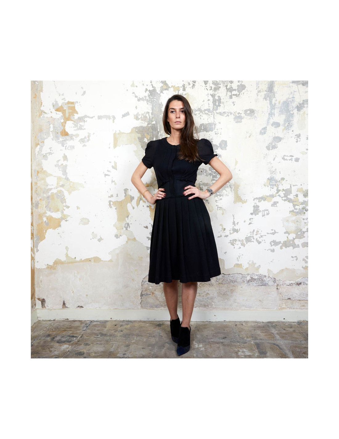 Viktor & Rolf short-sleeved dress with a button closure. It is bent at the waist and pleated and flared. 100% wool. It is lined. It has on the side a long zip of 38 cm.