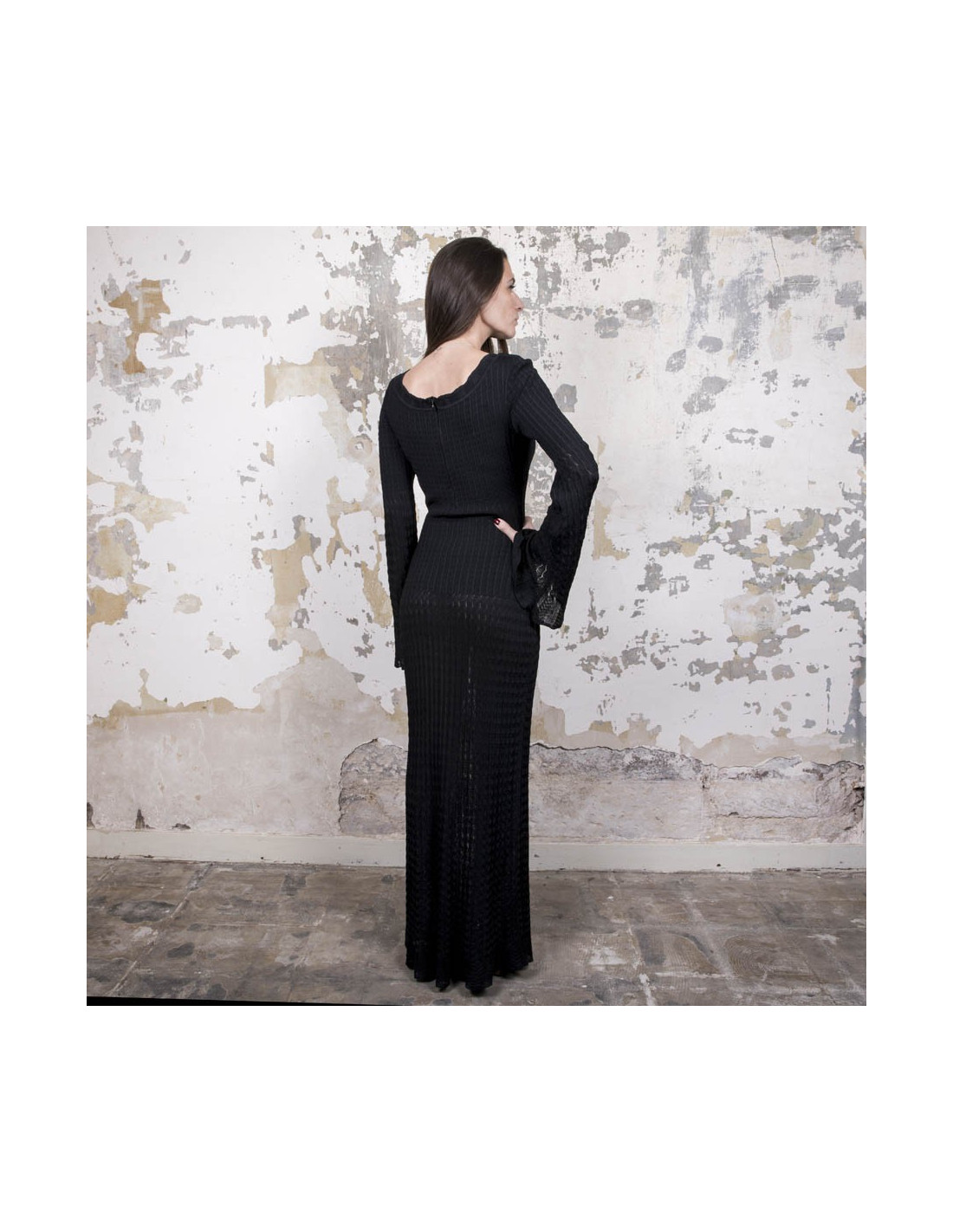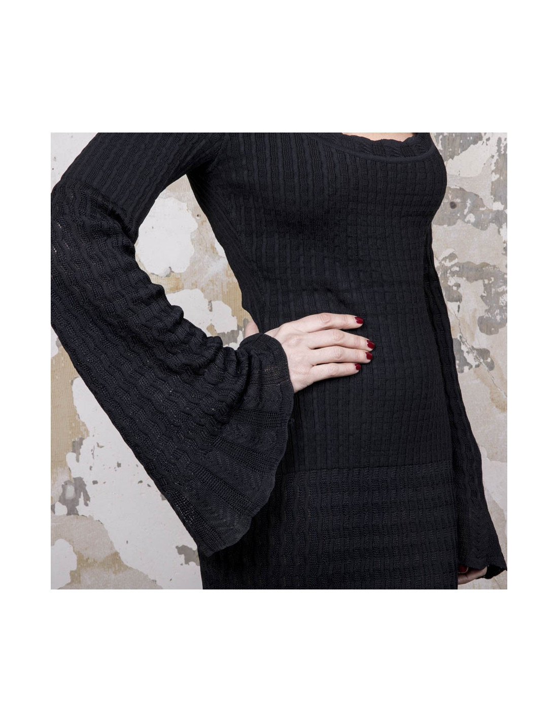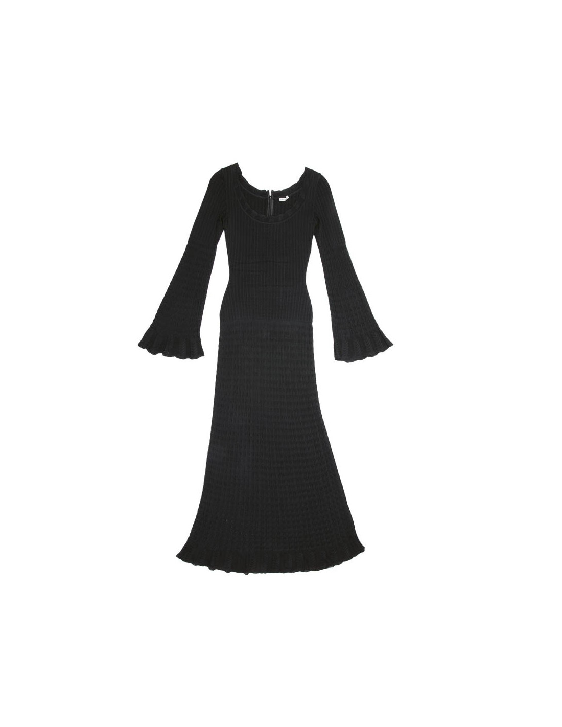 Alaia dress in black lycra, size S. It is worn close to the body and flared at the bottom. The sleeves are also flared at the wrists. Zipper in the back 26 cm.