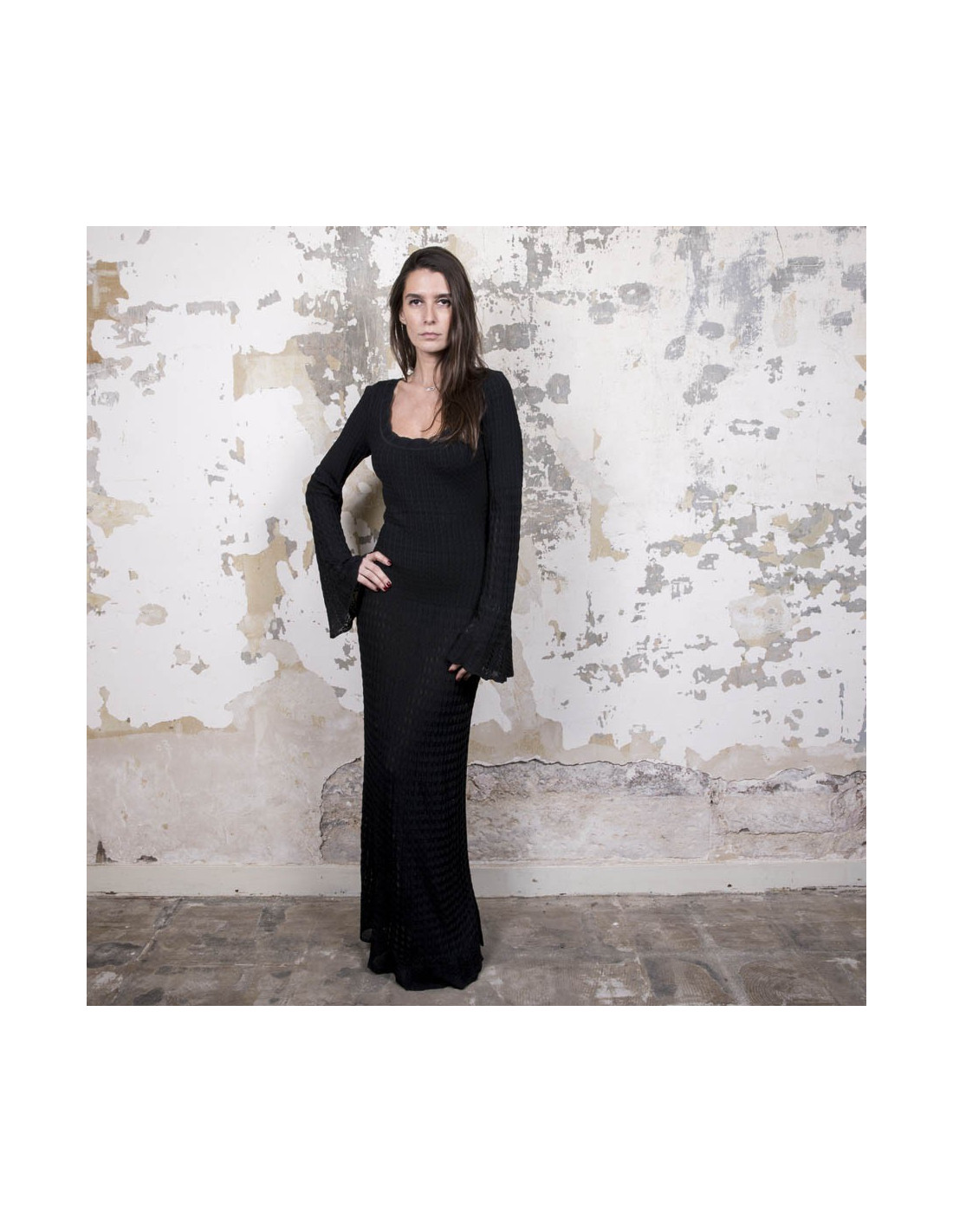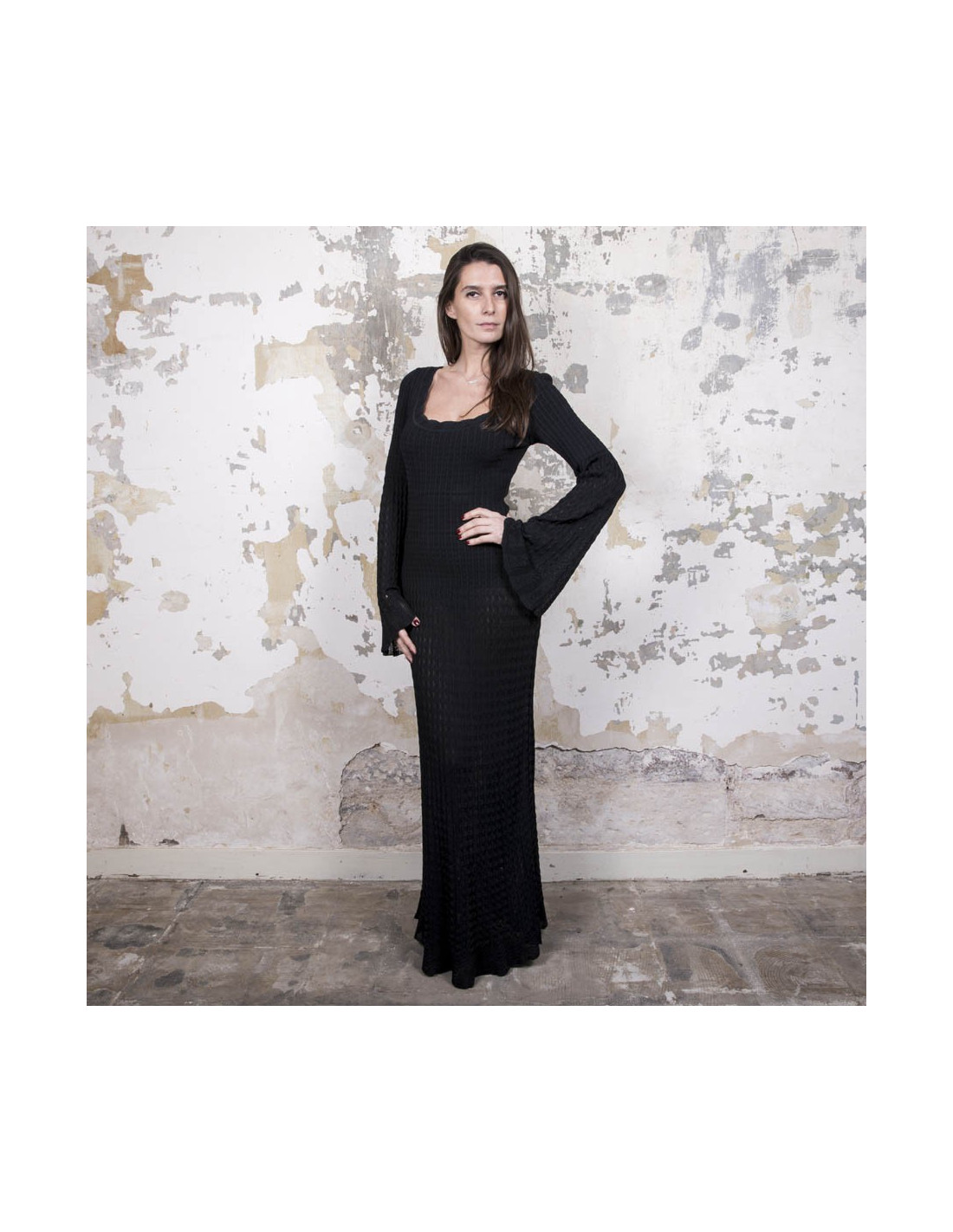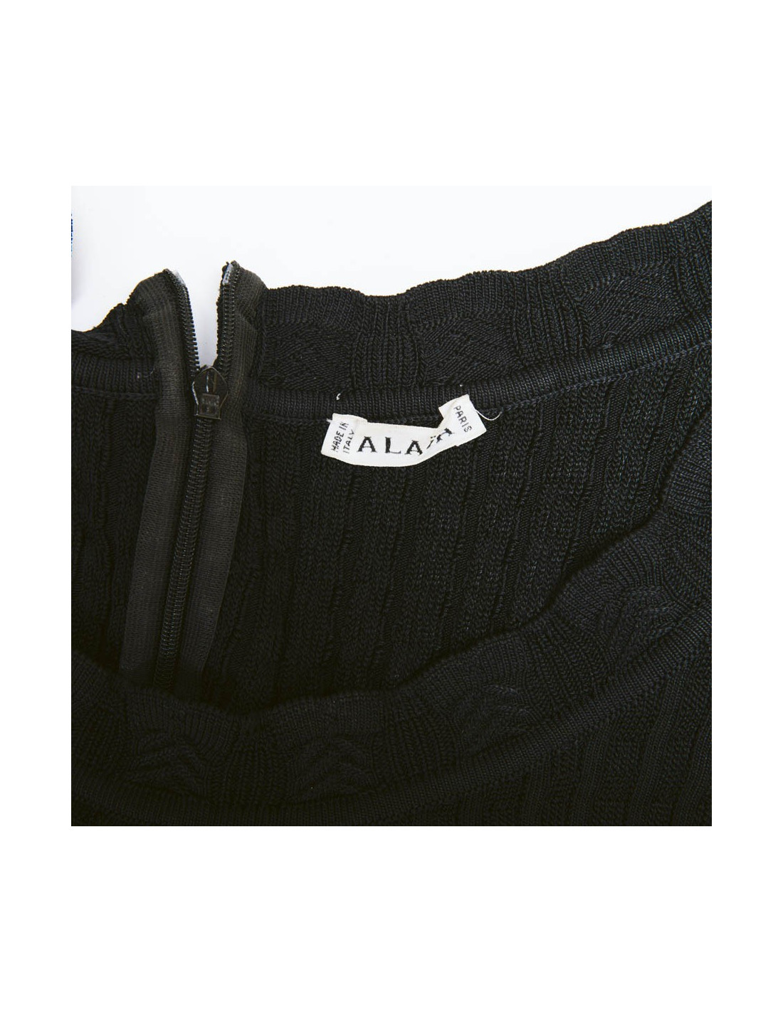 Alaia dress in black lycra, size S. It is worn close to the body and flared at the bottom. The sleeves are also flared at the wrists. Zipper in the back 26 cm.