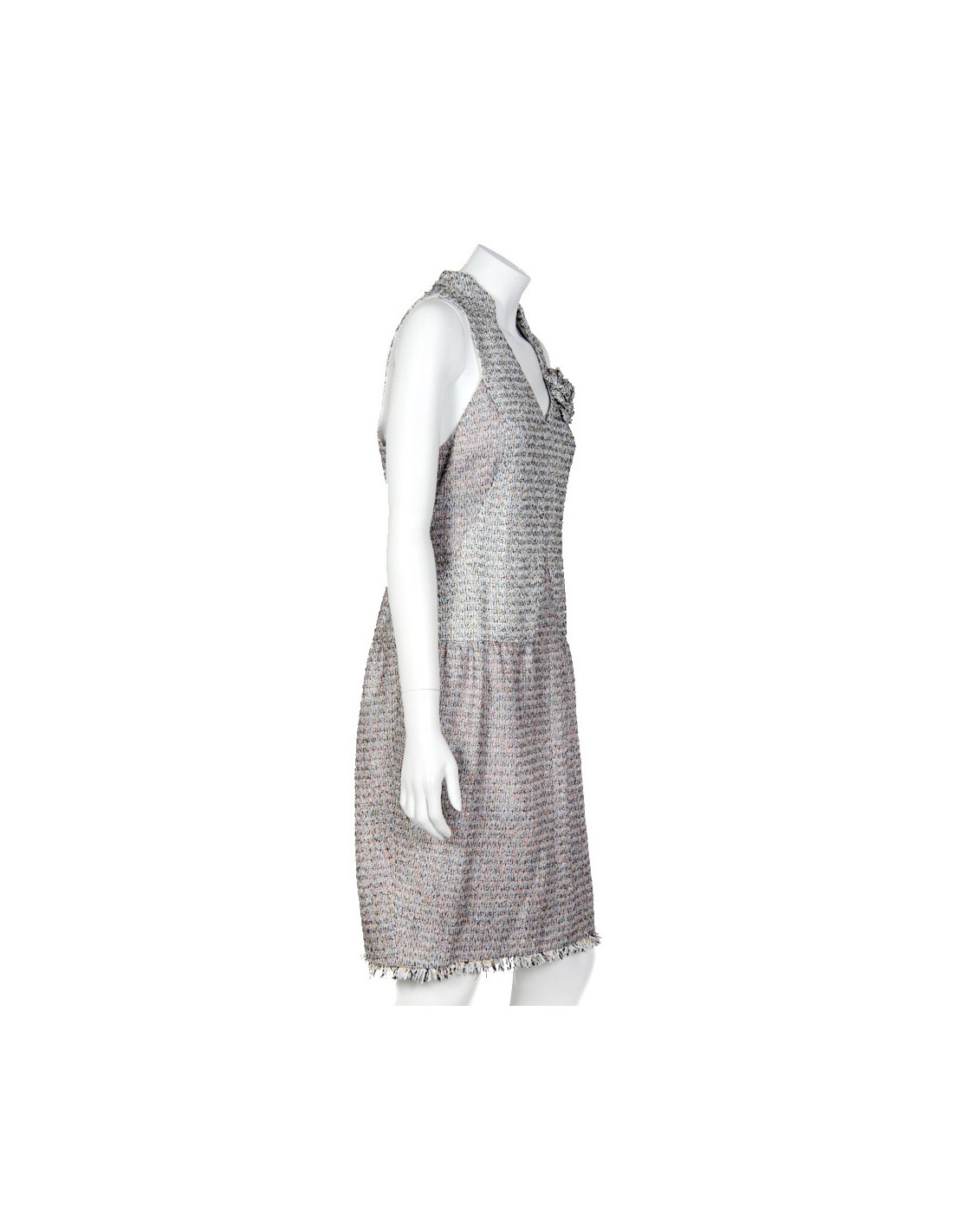 Chanel dress in pastel shades tweed. The lining is made of silk. Zip closure in the back. A camellia-shaped brooch is attached at the level of the heart which dresses and distinguishes the dress.