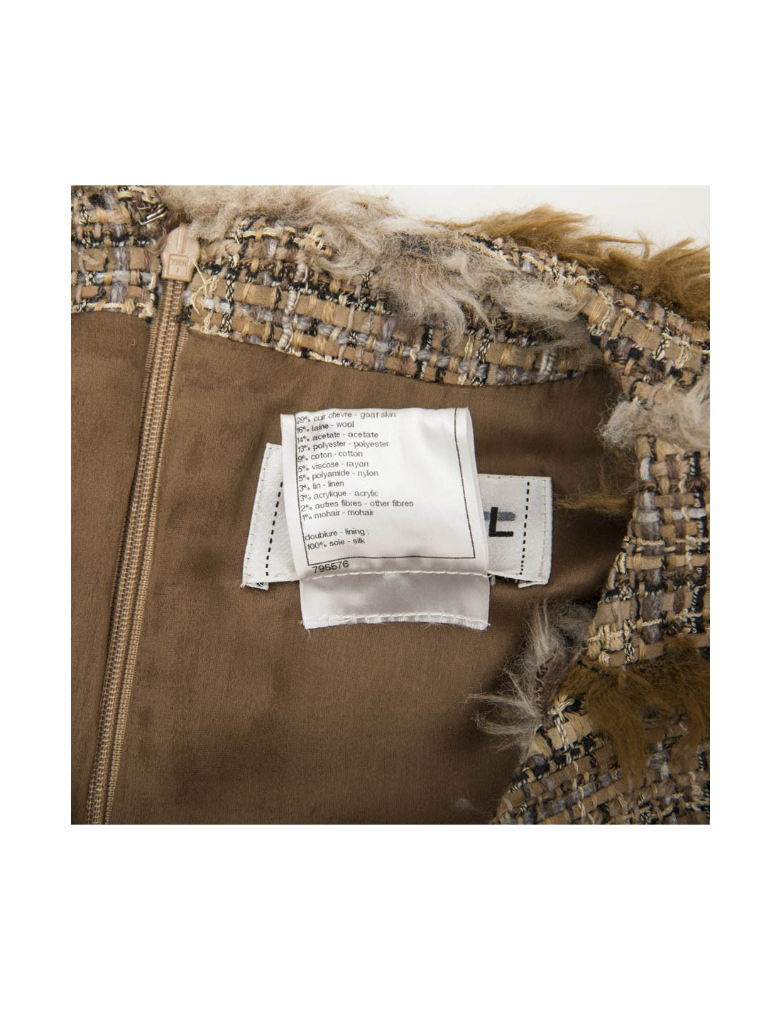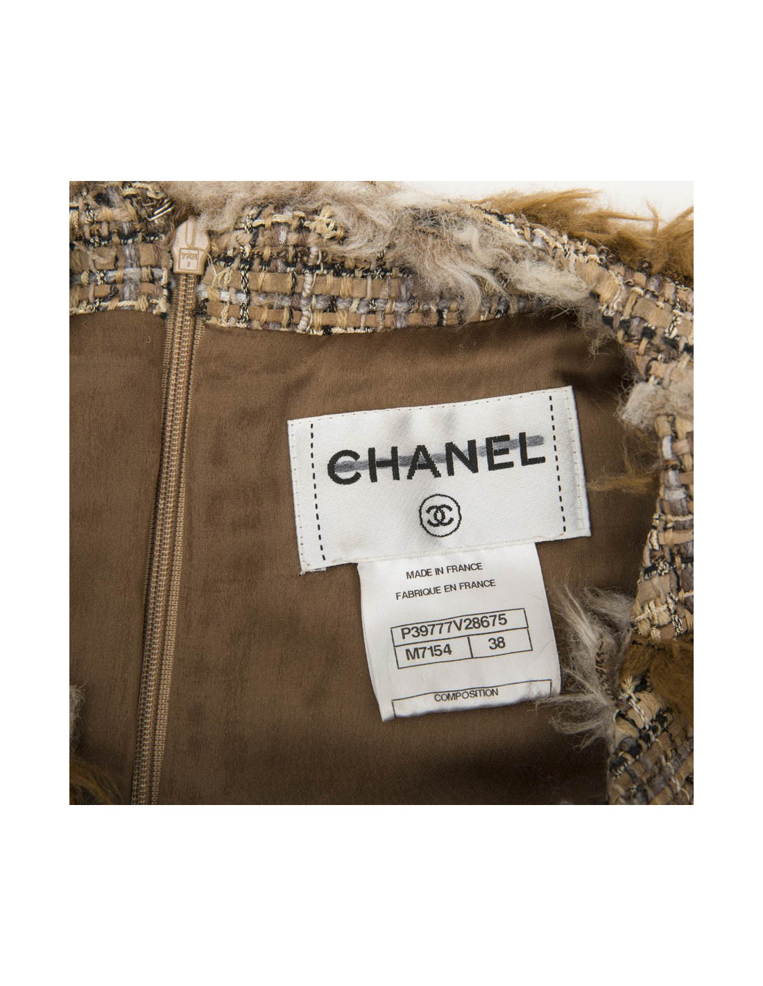 Chanel dress in tweed intertwined leather and wool threads with rows of imitation fur fringes in shades of beige and ecru. 100% copper silk lining. The collar is round and closes at the back with a 60 cm zipper. Size 38FR