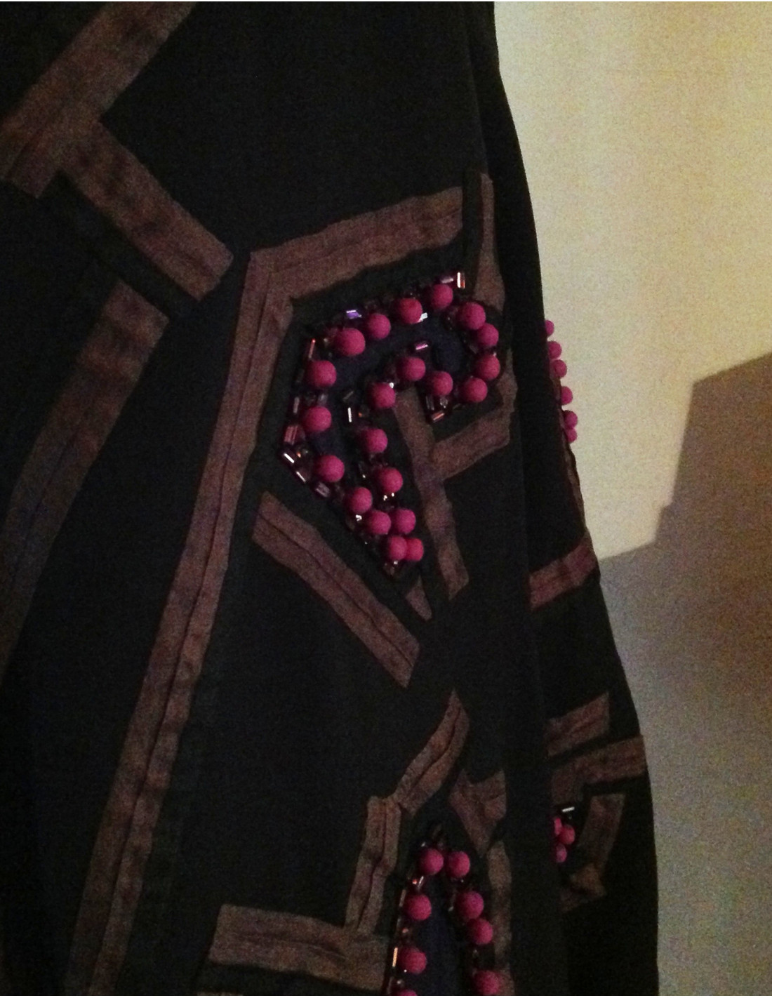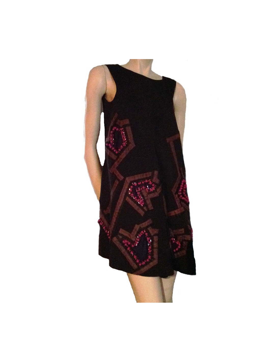 Original dress CHLOE black silk and multicolored patterns of brown color, glossy purple and khaki. They are set with fabric and rhinestone beads. The lining is black silk. This outfit was brought very little. In very good condition. Size: 34 en