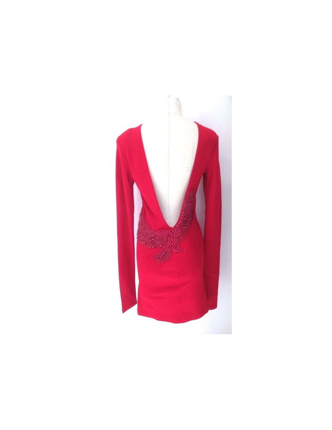 Collector! dress jersey cotton red and set with pearls and Red rhinestones T40 BALMAIN in the back drawing an eagle. This sophisticated dress is open in the back. It is ideally the evening. Manufactured in France, 100% cotton. (price public 4500euros).