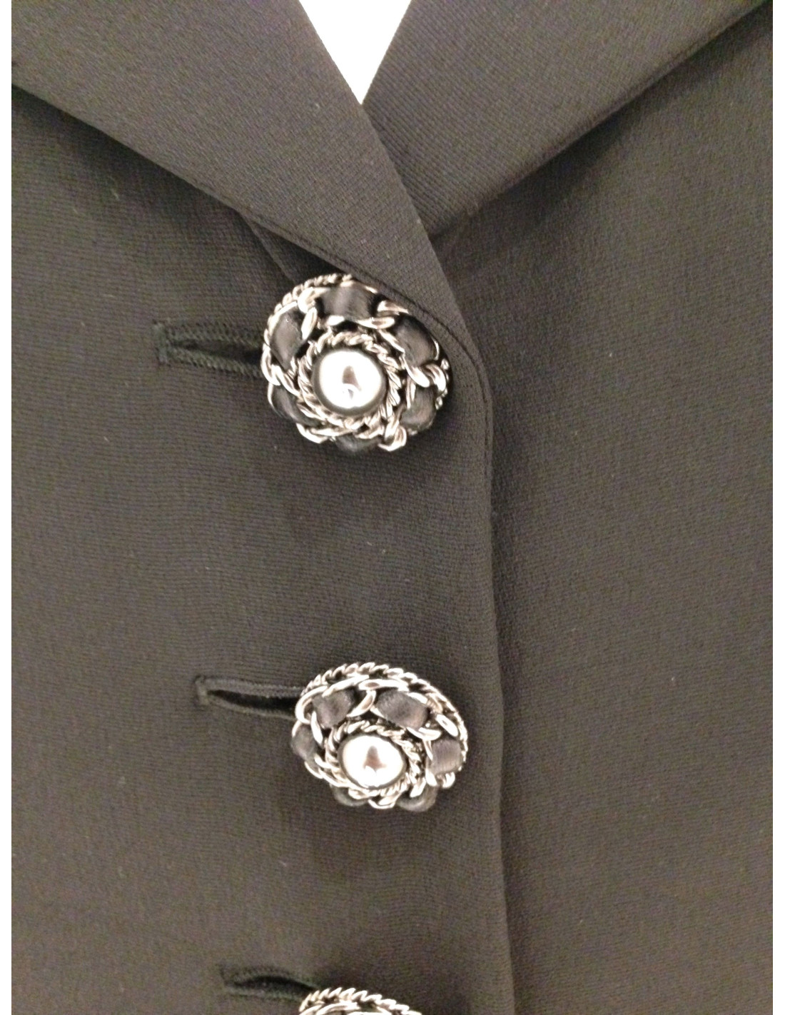 Black CHANEL dress-coat, waist 42, 100% silk. Collection Paris-Versailles 2013. Small short balloon sleeves measure 21 cm. Five beautiful buttons in silver and mother-of-Pearl black are abbreviations CC and agrementes of the mythical chain interwoven with black leather. The dress has two vertical pockets invisible to the hips. At the back of the dress, two slots provide volume and fluidity in this sumptuous room. This sublime dress is sold in a beautiful fabric cover Chanel. Retail price: € 4000.