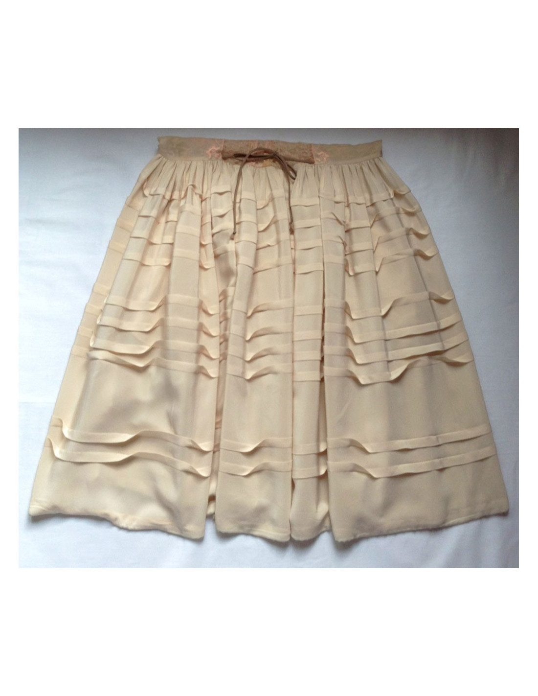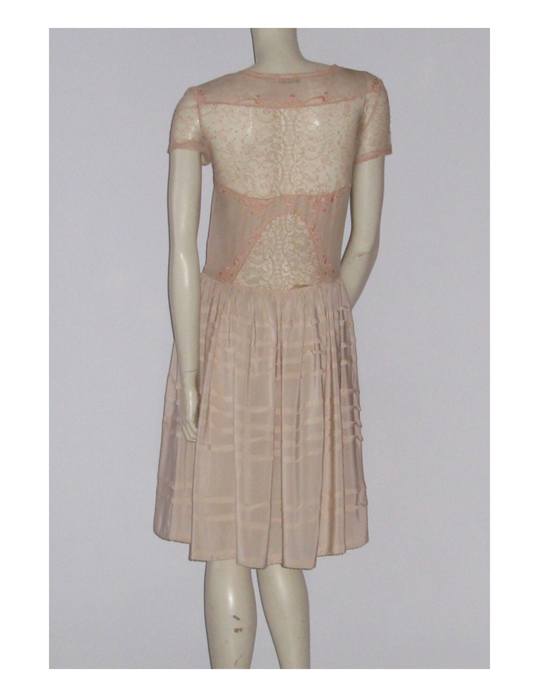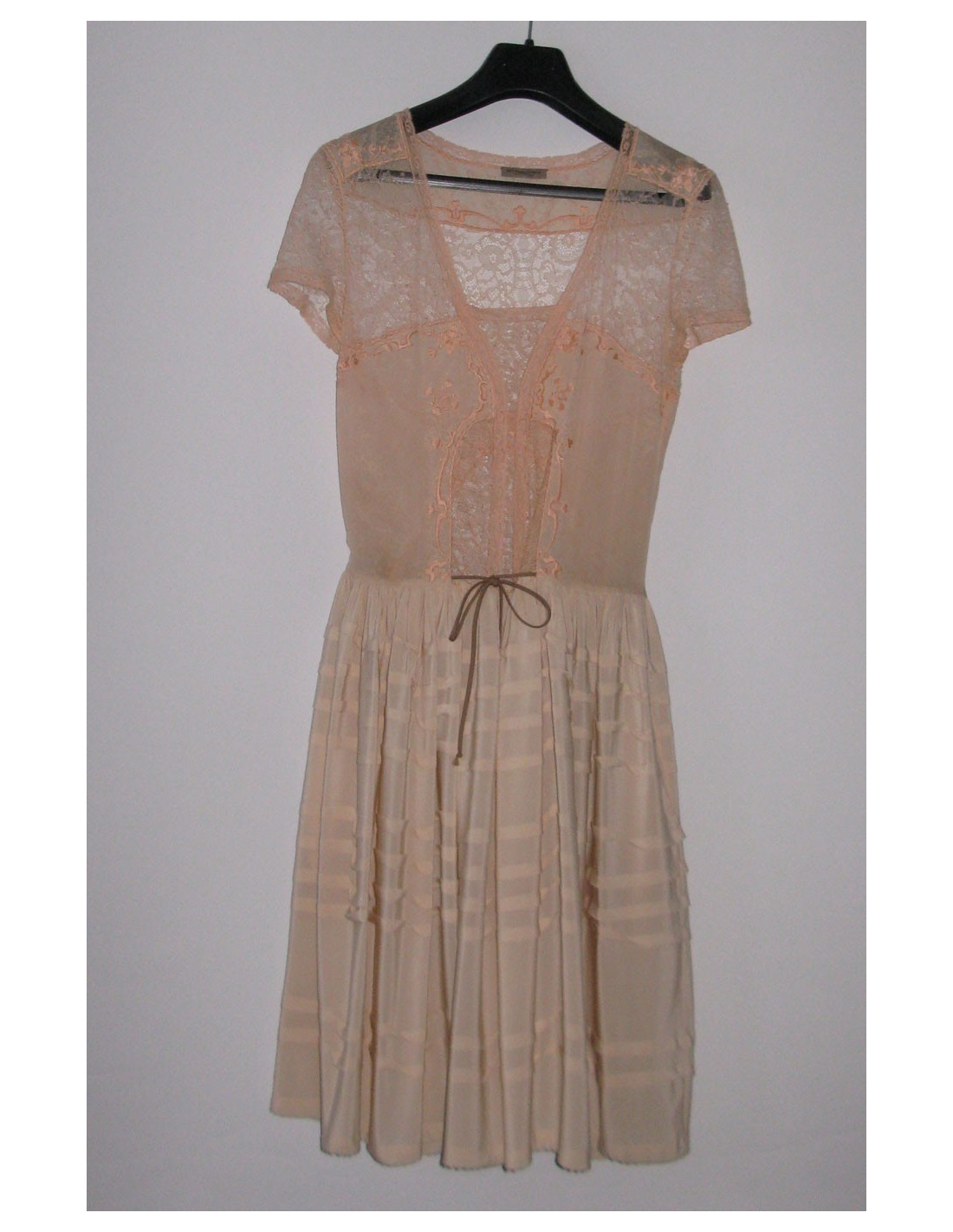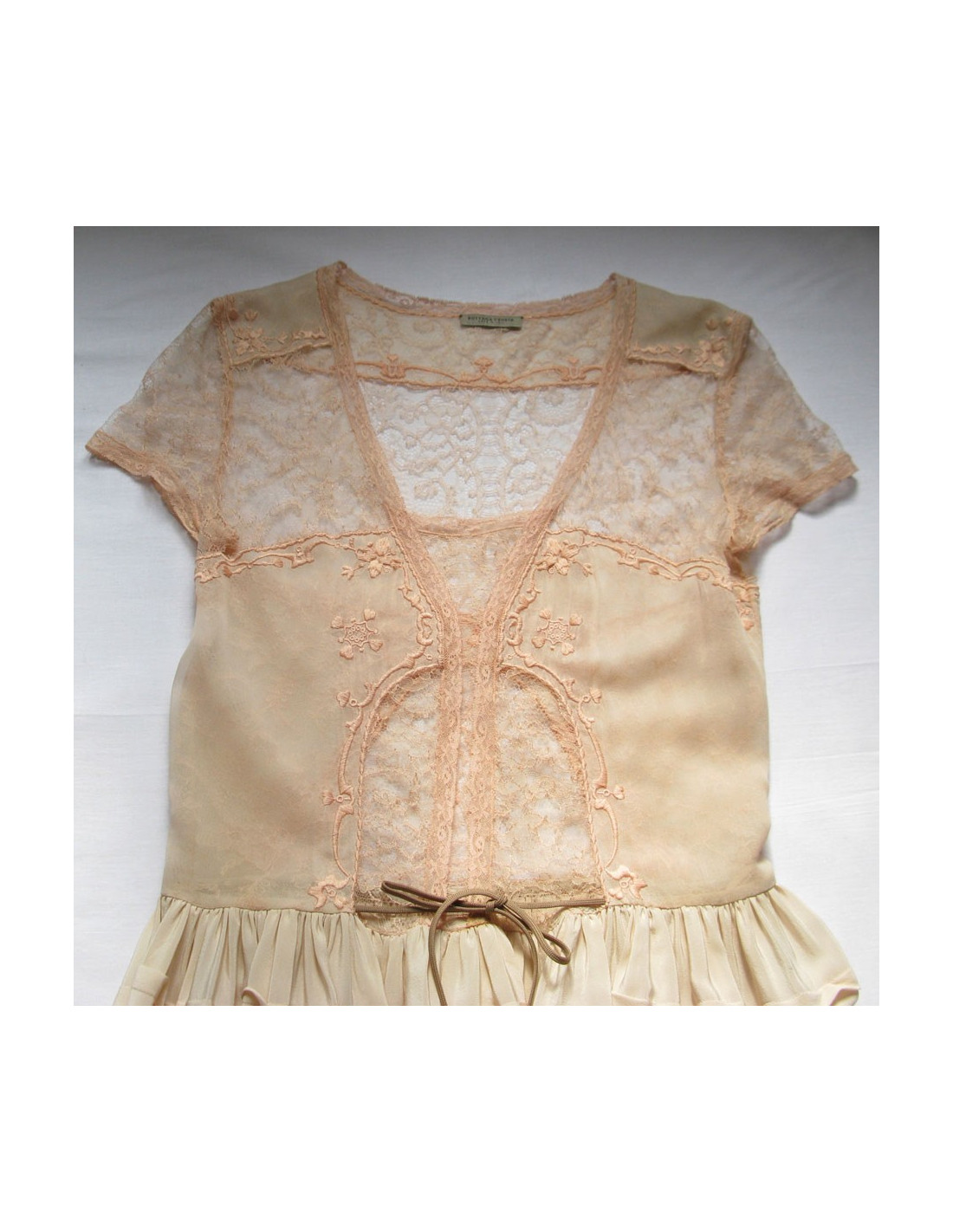 Dress, BOTTEGA VENETA, in 100% natural silk, pale pink, size 40. This dress, in excellent condition, is an exceptional piece. Indeed, lace embroidered and lace on silk is very refined and delicate. It has a small light brown cord adjustment at the level of the hips. The folds of silk bring volume to the skirt. From small lace sleeves cover the shoulders. at the level of the left shoulder, one can see a slight hitch easily fixable. Length: 105 cm, Sleeve length: 15 cm,Shoulder width: 40 cm, Chest width: 42 cm