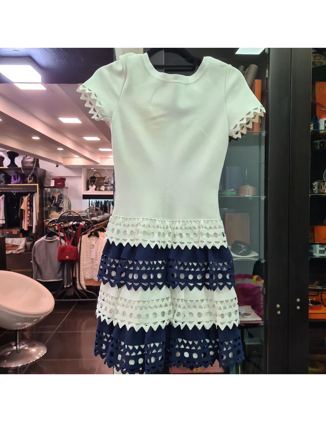 Last items in stock DRESSES CHANEL blue cotton officer dress CHANEL 31654 7,700.00 € CHANEL blue cotton officer dress Condition : very goodMade in France Materials : cotton Lining: silkColors : blue, mother-of-pearlSize : 38FRMeasurements : shoulders: 36 cm, underarms: 48 cm, hips : 30 cm, sleeves length : 30 cm, sleeves width: 30 cm, total height : 94 cm, bottom width : 42 cmYear : Spring 2009 Details: Blue cotton dress with a stand up... Add to cart