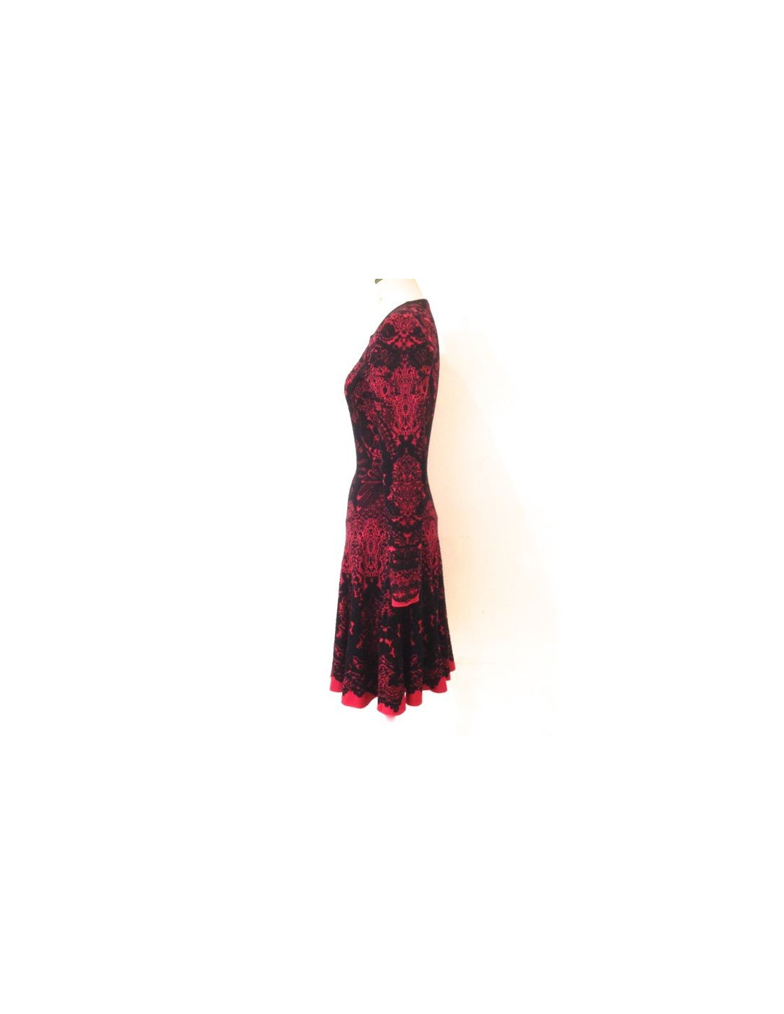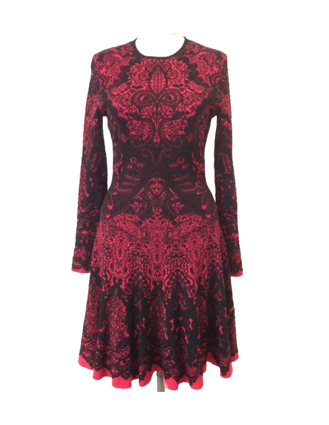 Alexander McQueen red and black jacquard dress with black lace inserts.