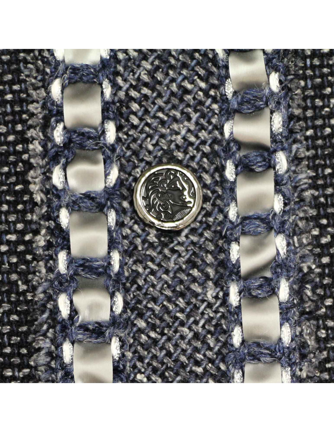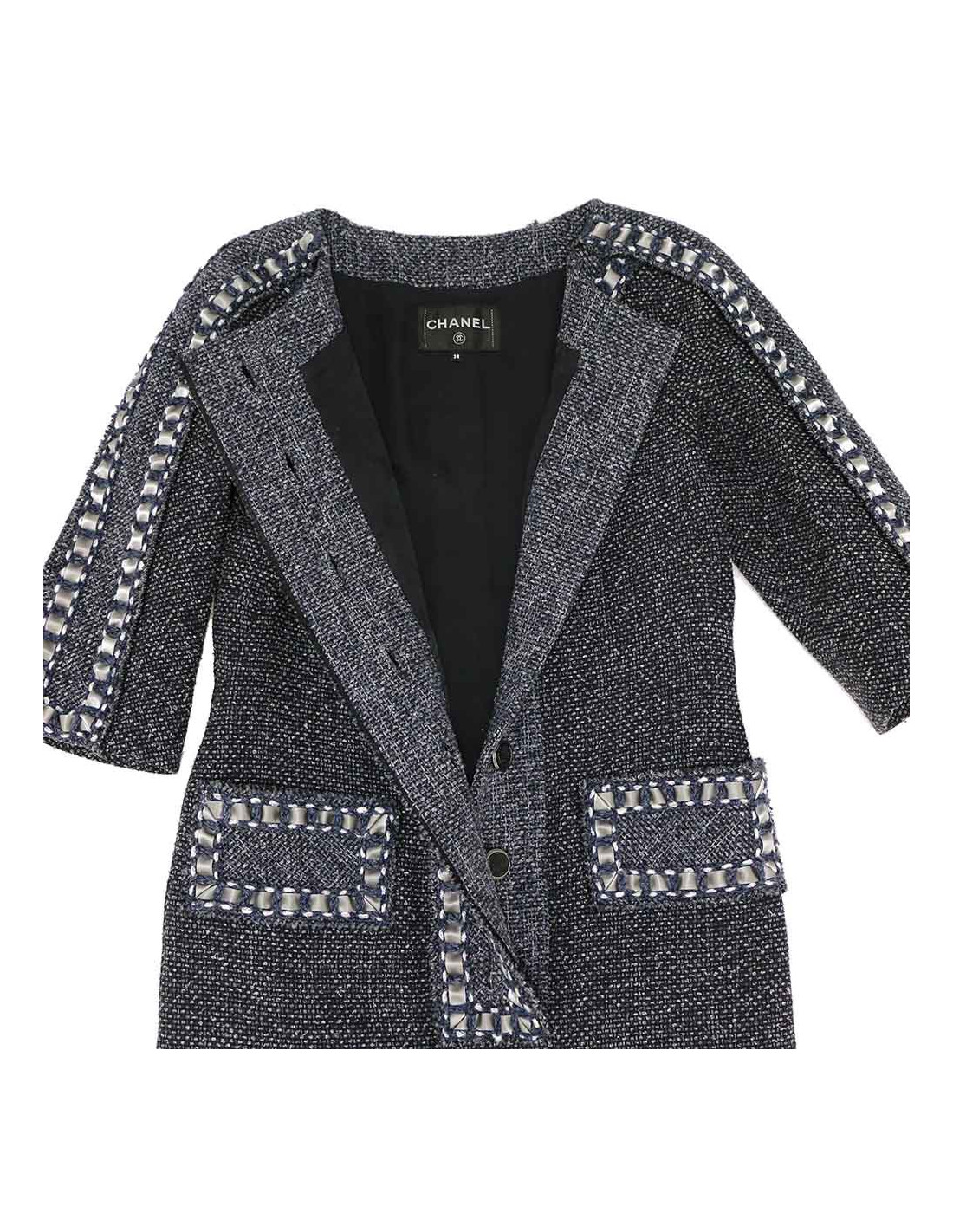 Details: Tweed dress with silver ribbons woven along the sleeves and the button placket. With seven black and aged silver buttons embossed with Coco Chanel's profile.