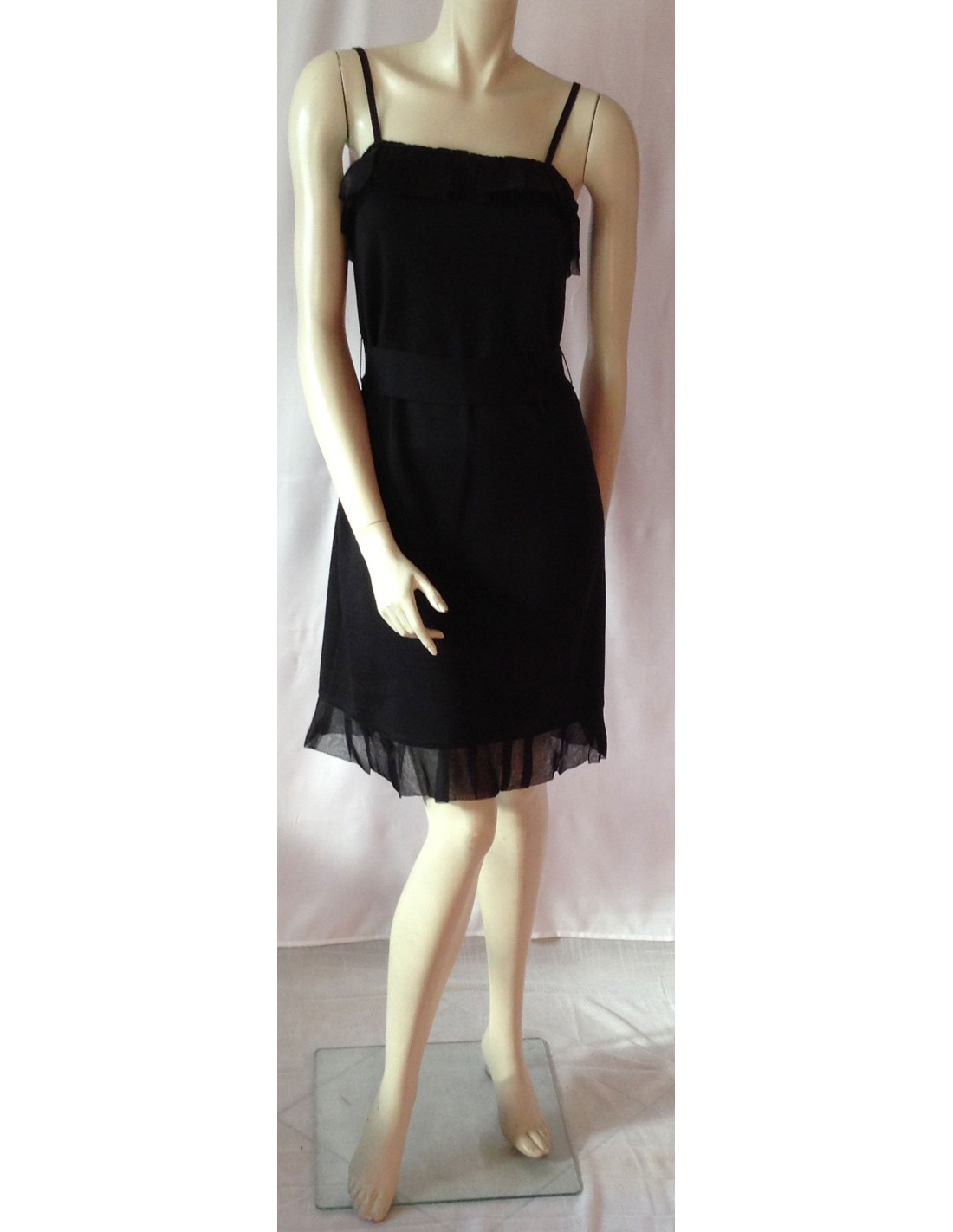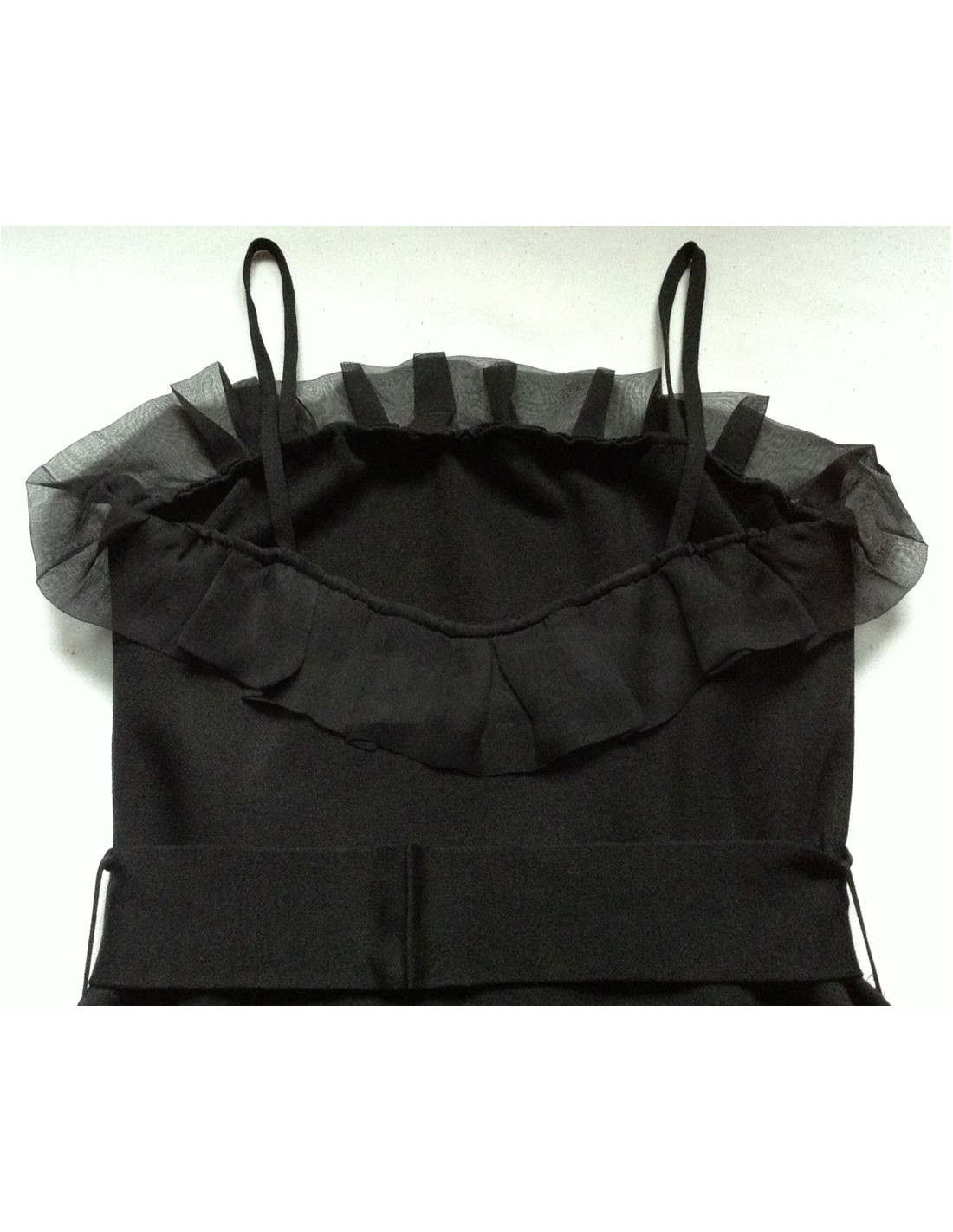 Robe Christian DIOR à fines bretelles noire T40FR, agrémenté d'un large volant en soie noir tout autour du décolleté ainsi qu'à l'ourlet . Découpe soulignante, cintrée par une jolie ceinture assortie au tissu de la robe. Taille 40FR. Composition: 59% soie et 41% coton. Un élément essentiel de votre garde robe!