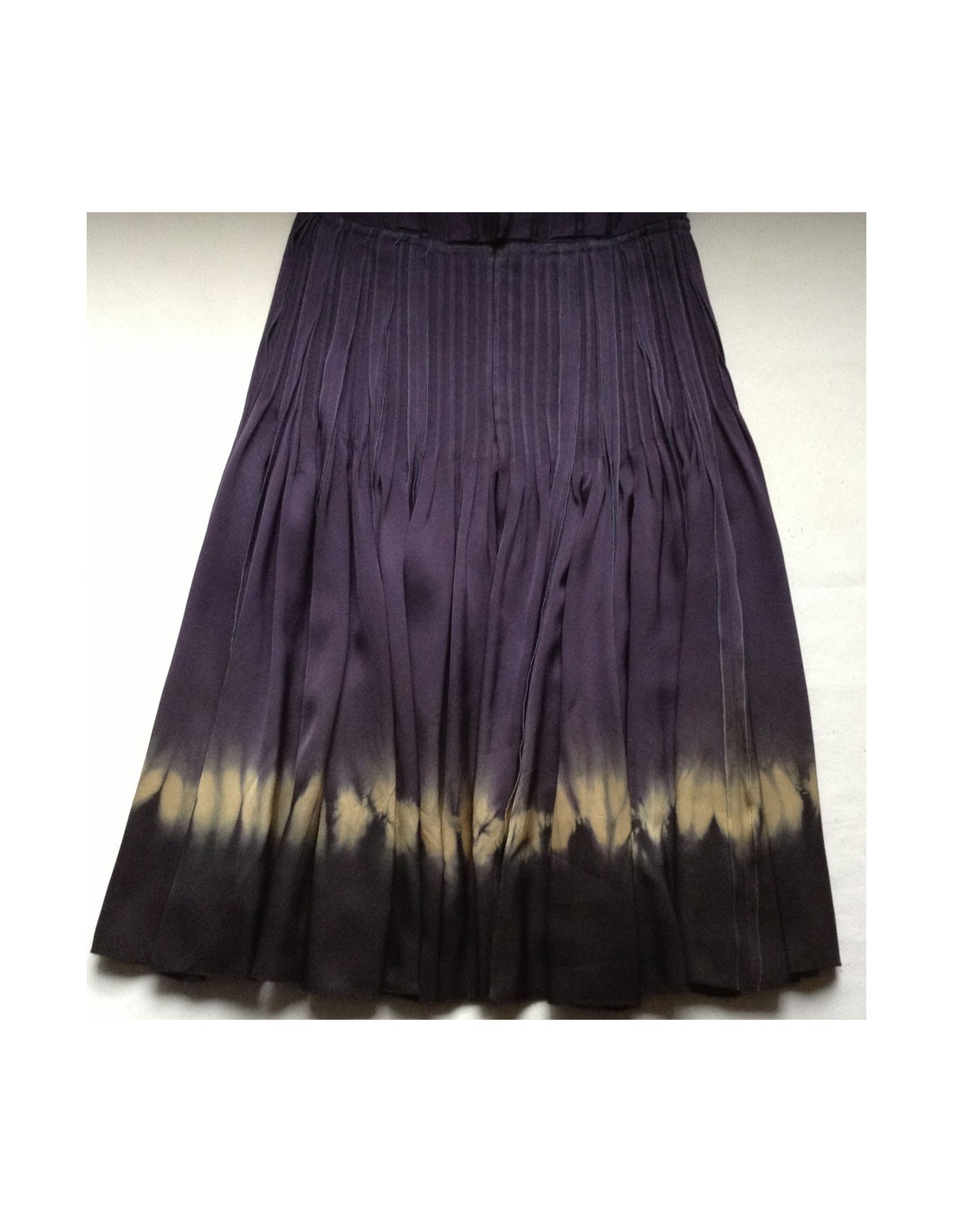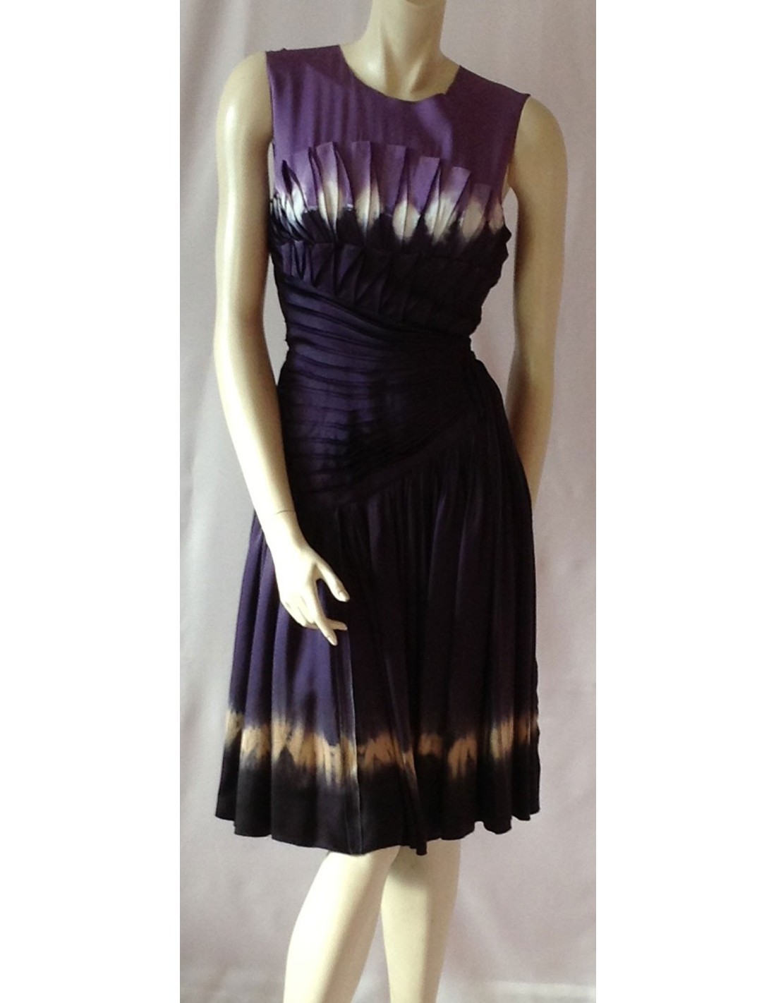 A piece of collection! Sublime PRADA silk dress 100%, the gradient of color: violet, violet, white and at the level of the hem a little touch of Navy Blue, camel and violet, any Tie & dye. Dress size, short sleeve, round neck, curved yokes silk ruffles on the chest and waist, and then folded up to below the knee. Long zip back closure. Size 42 Italian (equivalent to a 38FR). EVERYTHING SIMPLY DIVINE!