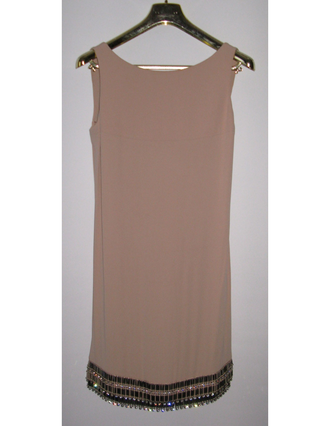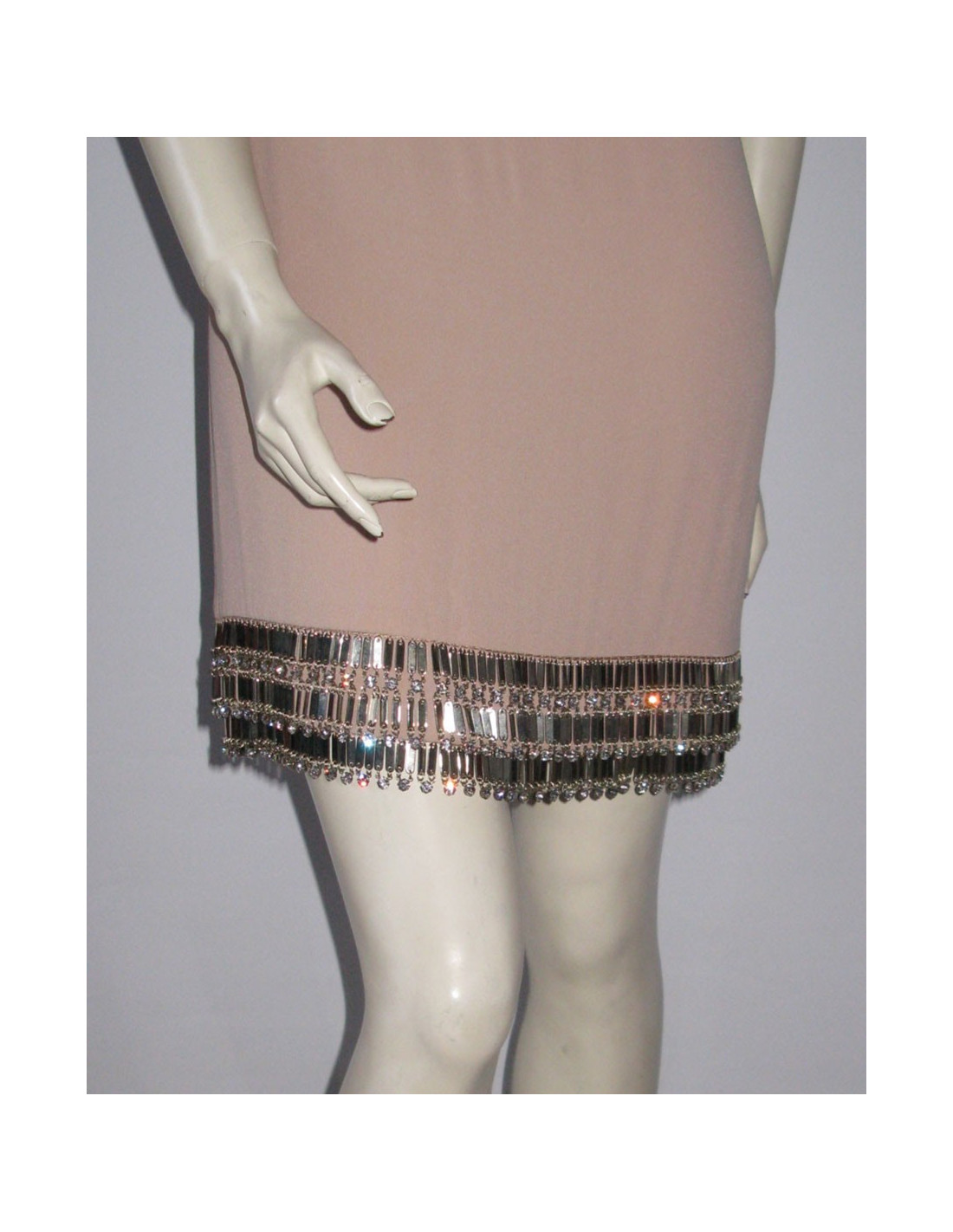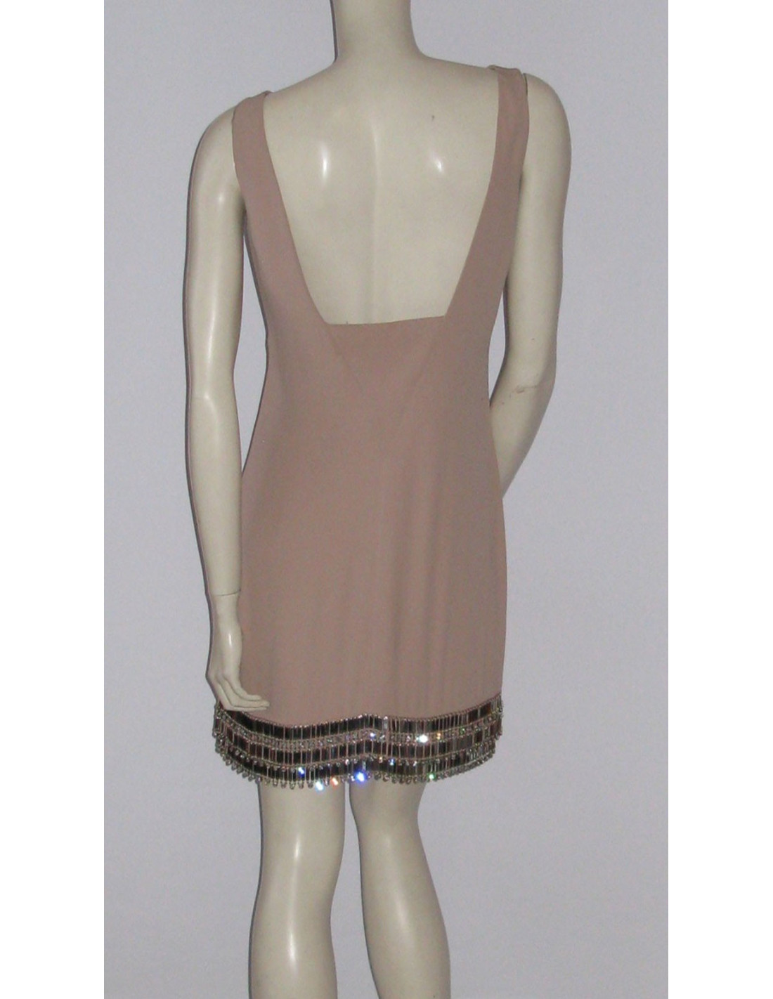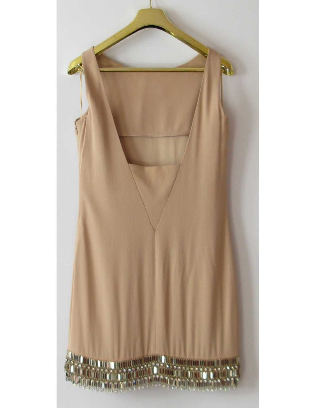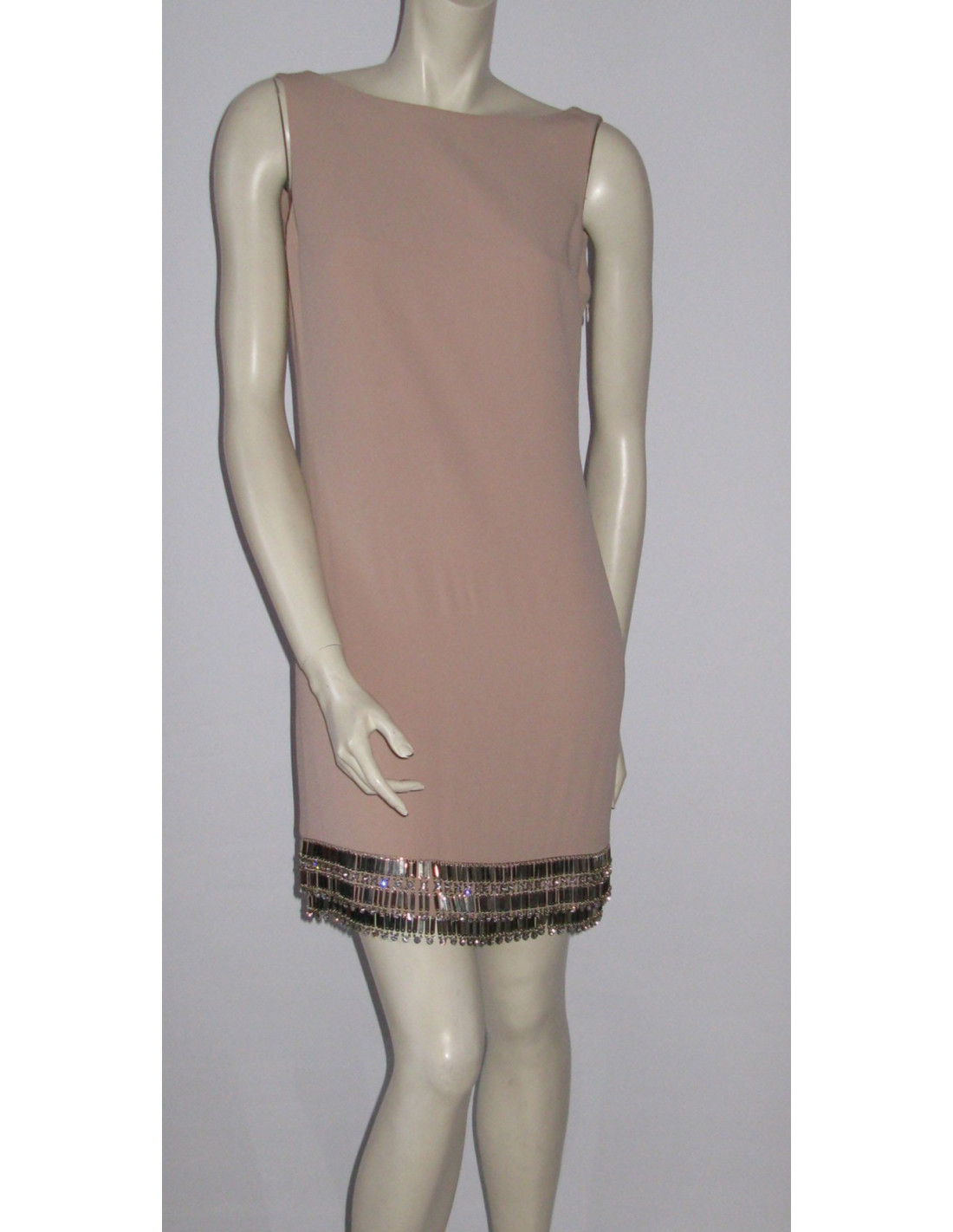 Stunning! Little short dress color AZZARO pink. Straight cut, collar, sleeveless. Wide cleavage square on the back. The bottom of the dress is decorated with crystals and beaded embroidery. Invisible zipper on the right side and a small hook. Size 38FR 73% acetate. Colour: Pink - retail price: 2900 EUR Length: 81cm, Build: 38 cm Bustier: 44 cm, Waist: 80 cm Hip: 43 cm, the bottom of the dress: 48 cm