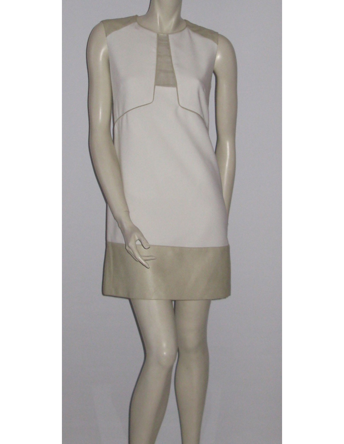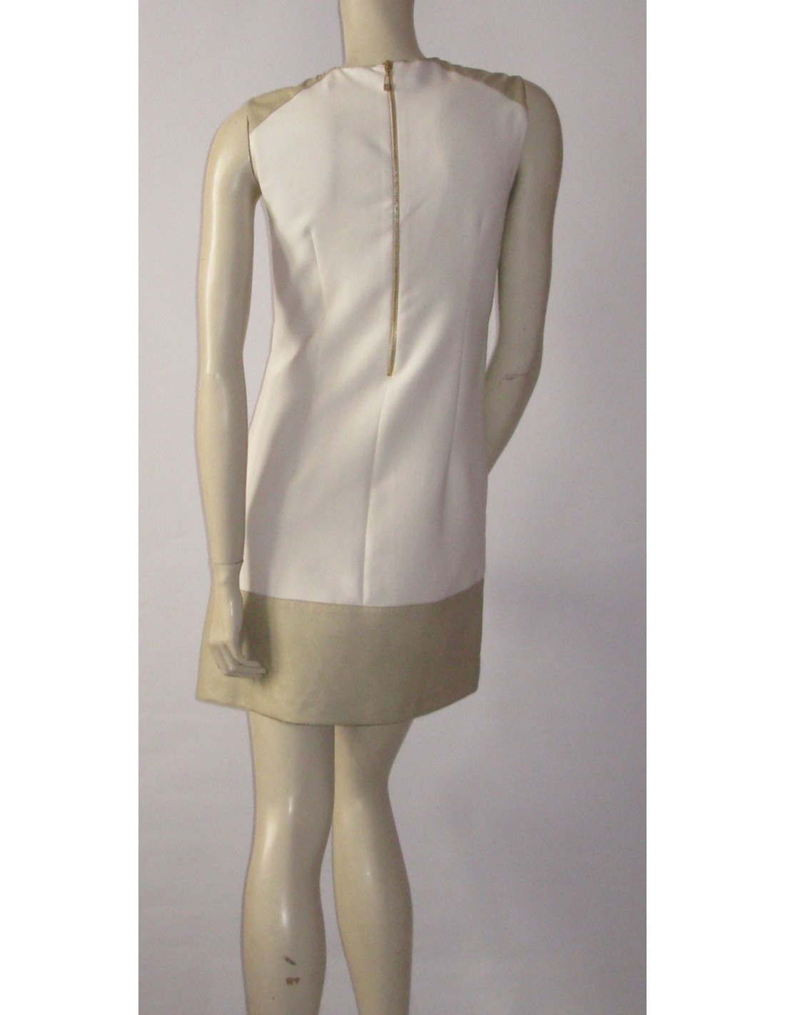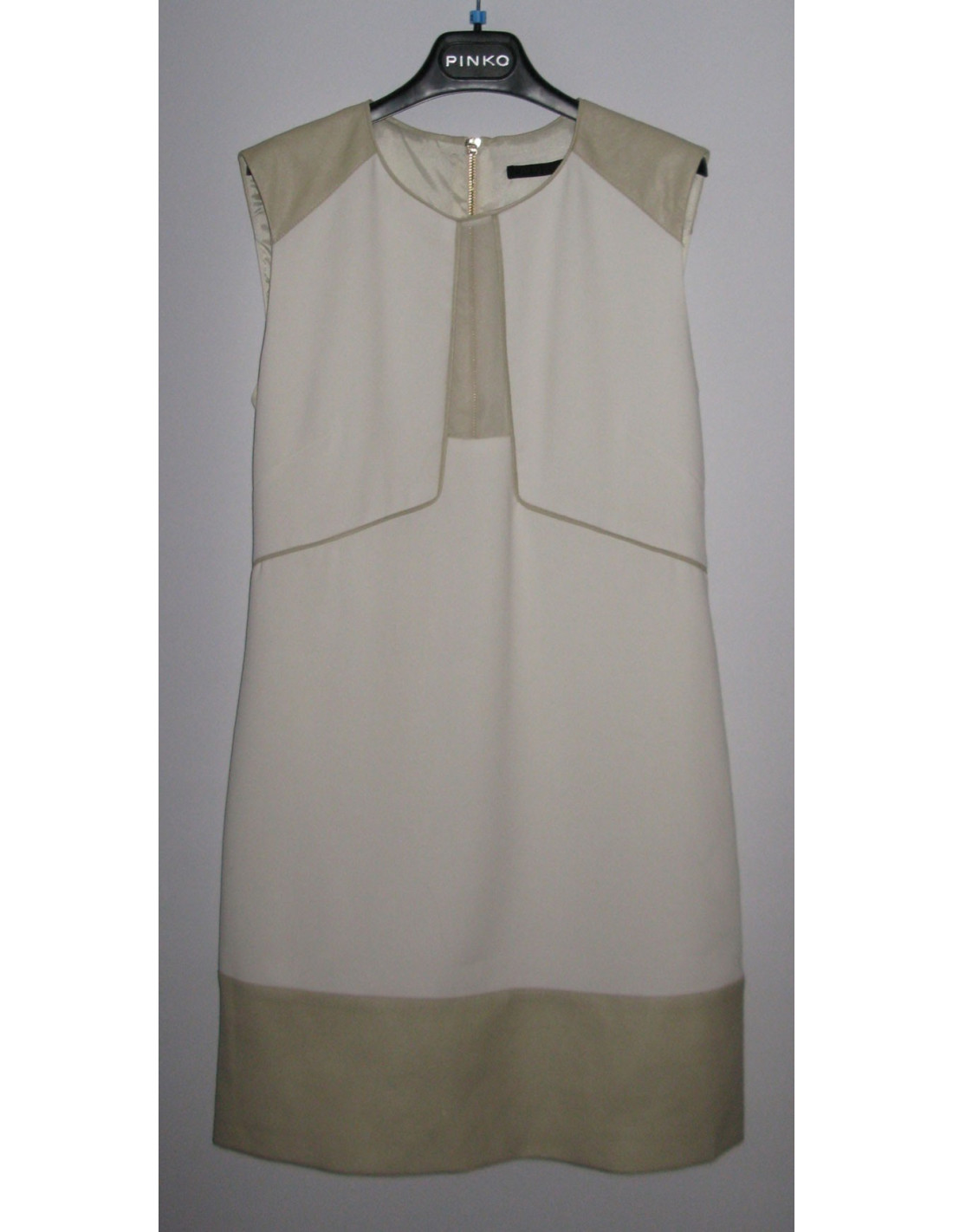 Ravishing two-tone PINKO dress white and white Platinum T38FR. Length below the knee, flared shape, bending above the waist clips. Dress sleeveless, round-neck, fabric Platinum white blade shoulder and wide-band border. Centrally from the chest to the part, if is a vertical band in transparent tulle. Zip opening on the back metal gilt with padlock with a small solitary brilliant. Composition: 67% acetate. Collection: Spring/summer Color: White/Platinum Length: 83 cm, Build: 36 cm Bustier: 40 cm, Waist: 39 cm Hip: 43 cm, The bottom of the dress: 50 cm