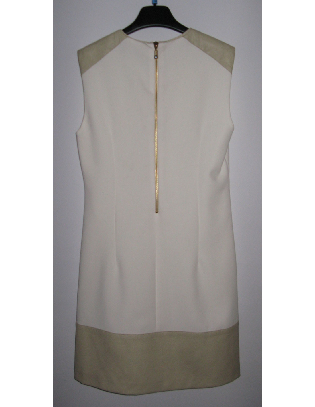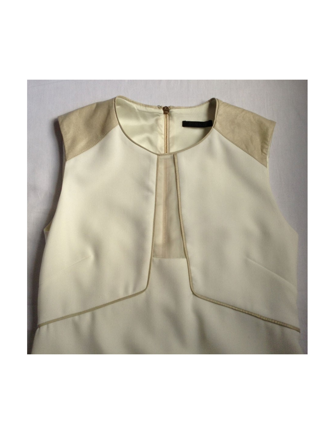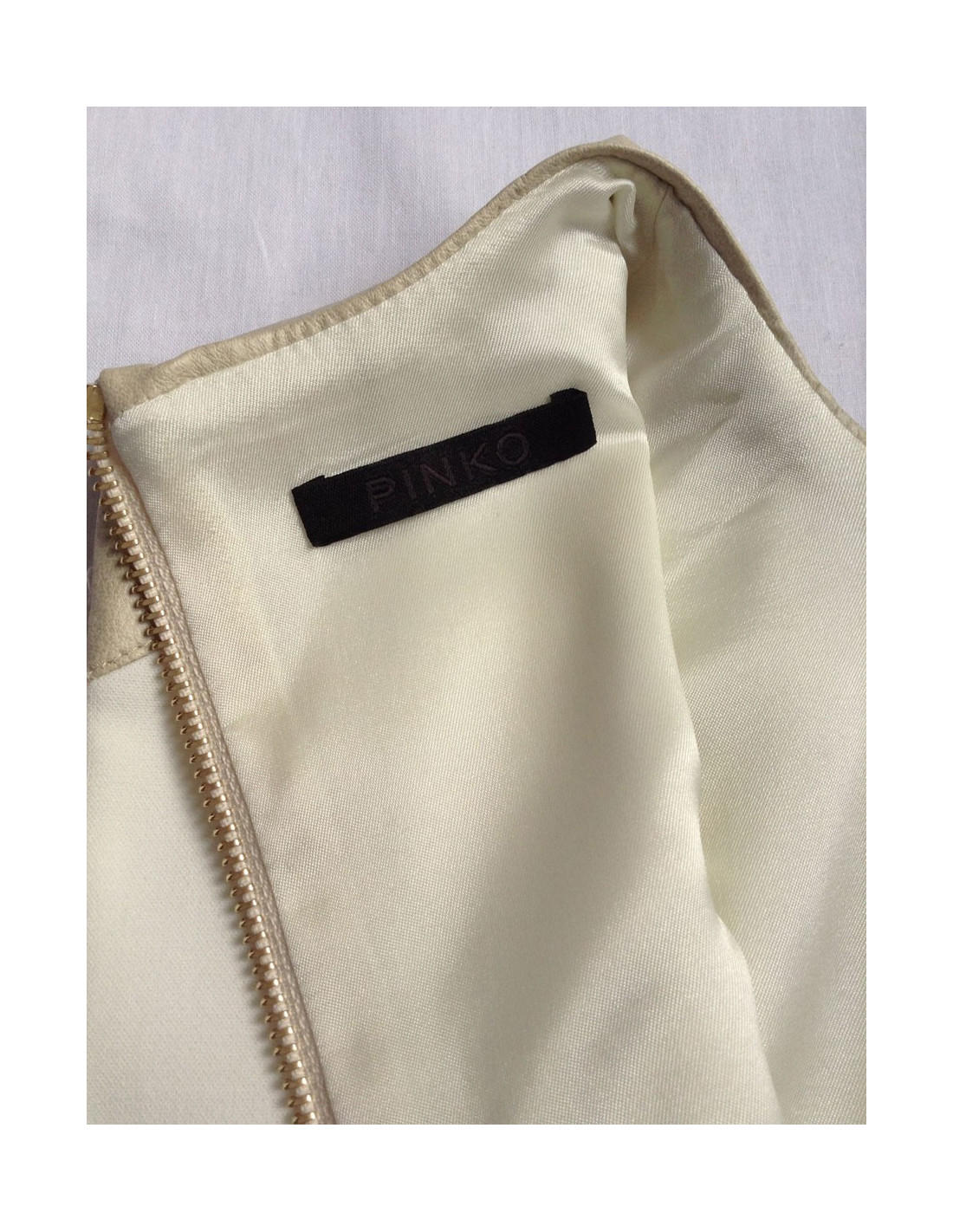 Ravishing two-tone PINKO dress white and white Platinum T38FR. Length below the knee, flared shape, bending above the waist clips. Dress sleeveless, round-neck, fabric Platinum white blade shoulder and wide-band border. Centrally from the chest to the part, if is a vertical band in transparent tulle. Zip opening on the back metal gilt with padlock with a small solitary brilliant. Composition: 67% acetate. Collection: Spring/summer Color: White/Platinum Length: 83 cm, Build: 36 cm Bustier: 40 cm, Waist: 39 cm Hip: 43 cm, The bottom of the dress: 50 cm
