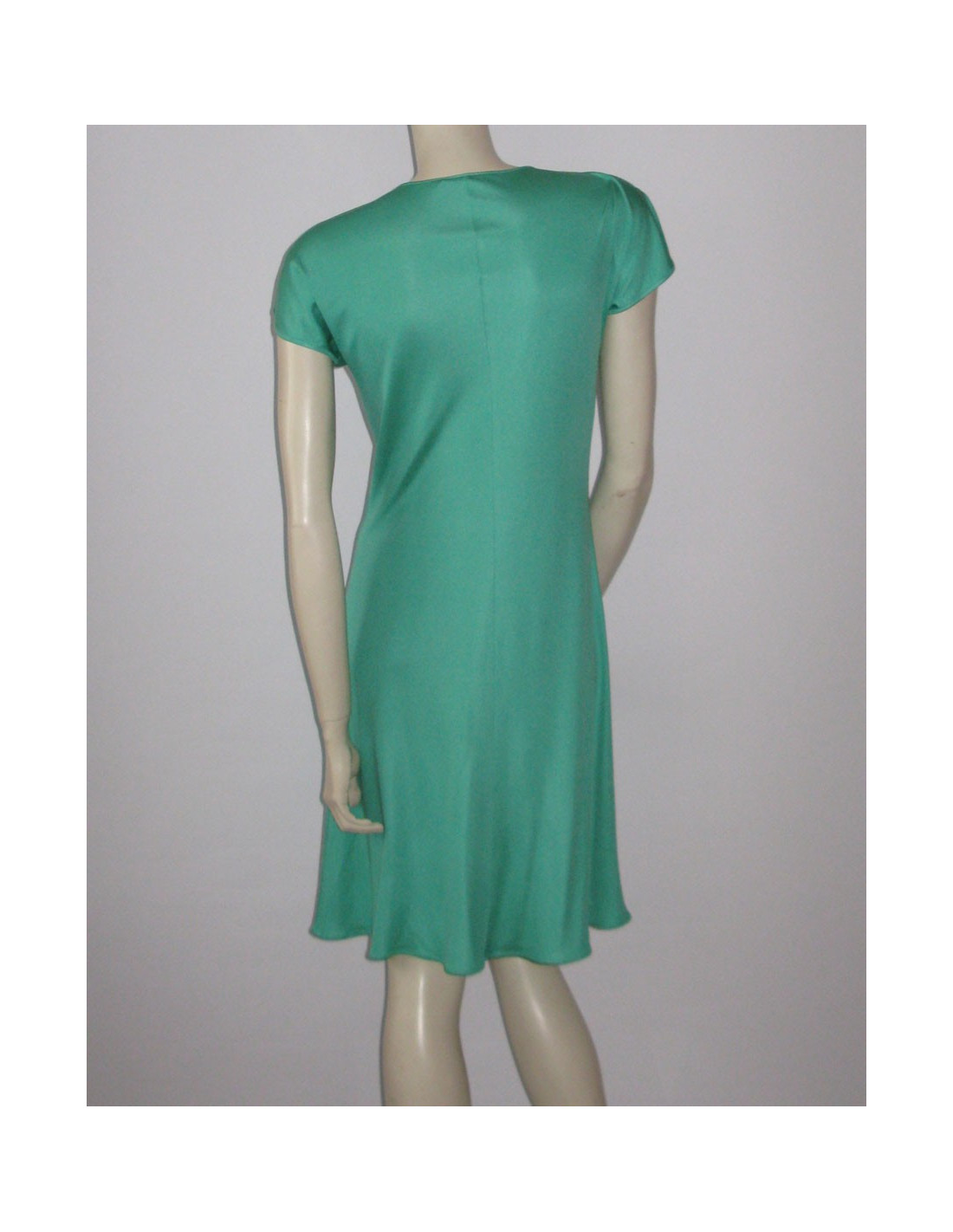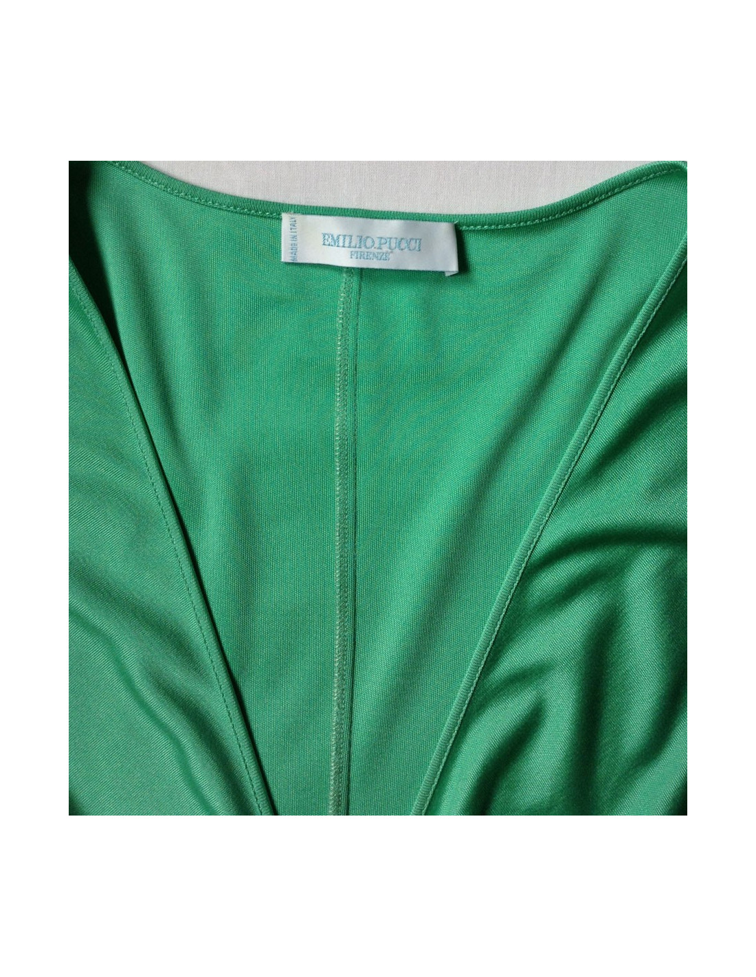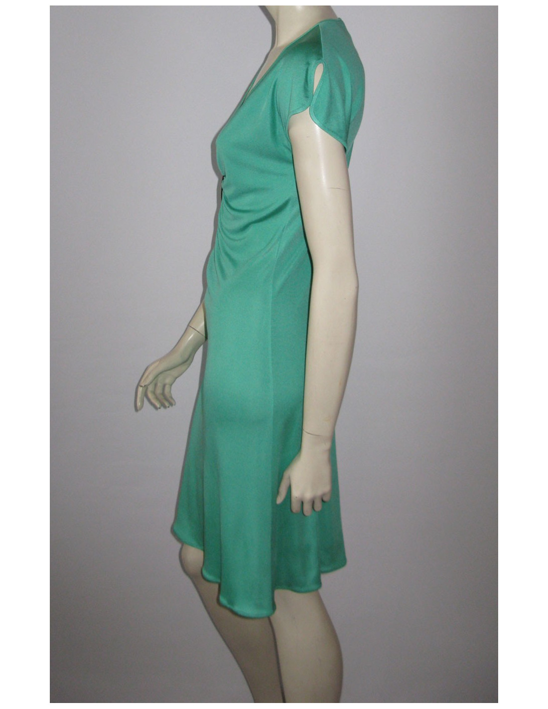 Seductive by its fluidity! Dress EMILIO PUCCI T38Fr turquoise silk short sleeve split on the sides, V neckline with detachable geometric yoke by push-buttons. Line adjusted up and fluid silk bas.100%. Collection: Spring/summer Color: Turquoise MEASURES FLAT Length: 92 cm, Chest width: 44 cm, Sleeve length: 9 cm Build: 38 cm, Size: 34 cm Hip: 40 cm, Bottom of dress: 65 cm