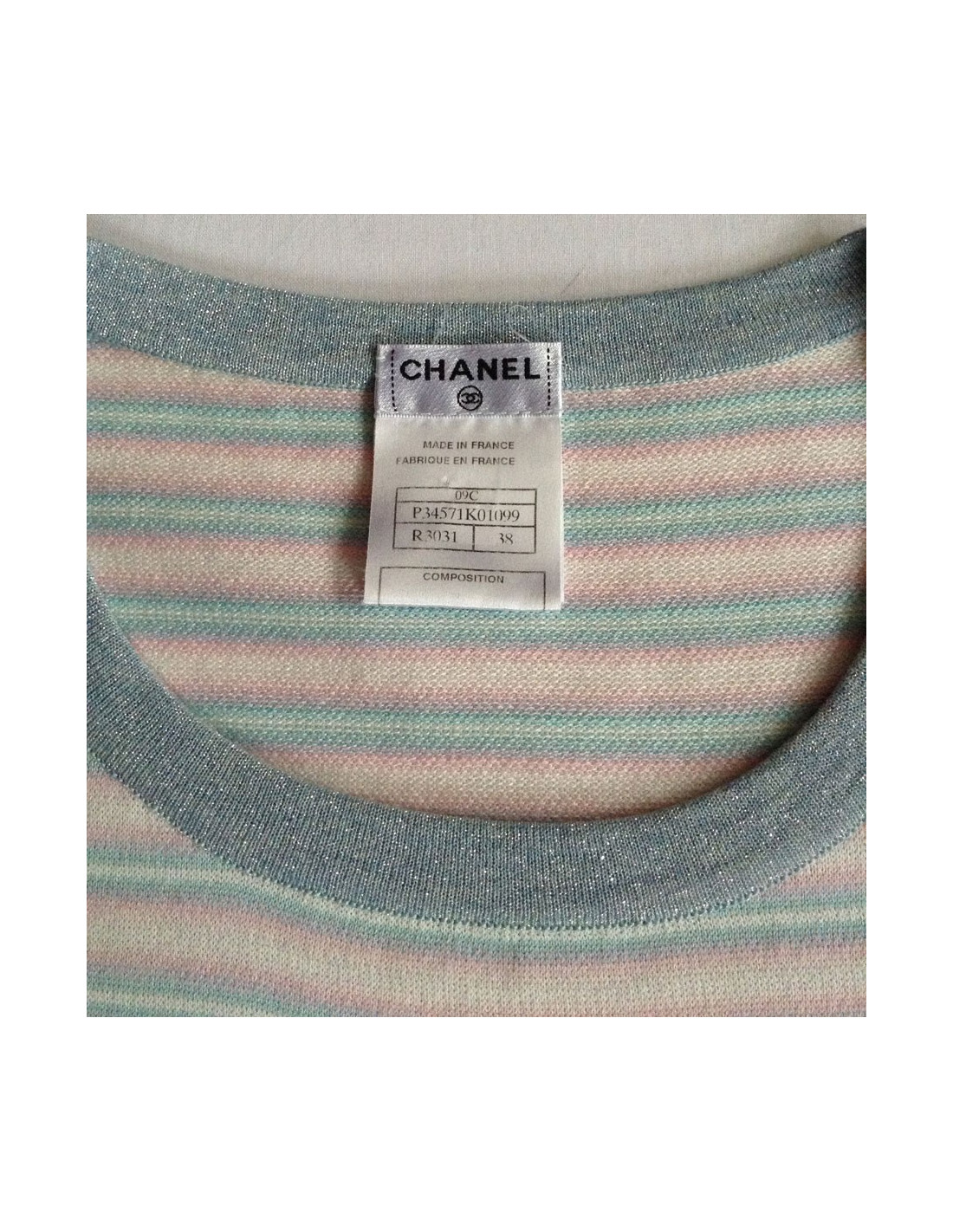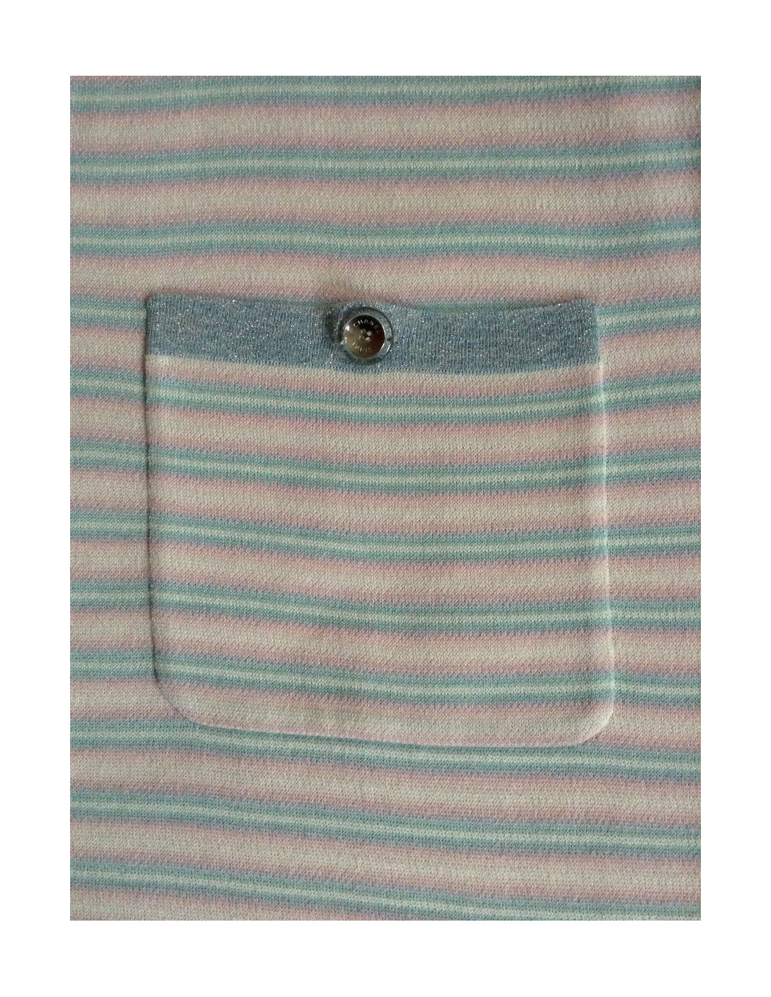 A fresh look for this summer! Dress CHANEL short T38Fr, with horizontal stripes in pastels. Short sleeves with CC embroidered on the left sleeve, collar round lurex grey/bluish as well as on the edge of the 2 front patch pockets, decorated with beautiful buttons transparent acronyms "Chanel Paris". 88% cotton, 9% cashmere.