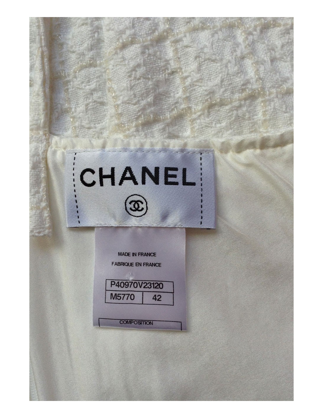 We Love! Dress Chanel unbleached, knee, straight cut. Thin straps at the back and braces in triangular shape at the front. The fabric of this dress is gorgeous! Fabric "quilted" effect raised by son Pearly geometric decoration. V drawing in the center of the dress adorned with a small plate oval sealed CC. Zipper on the back with engraved zipper CC. Size 42. 94% cotton. Collection: Spring/summer Measures flat Length: 92 cm, Chest width: 40 cm Build: 42 cm, Size: 43 cm Hips: 45 cm, Bottom of the dress: 47 cm