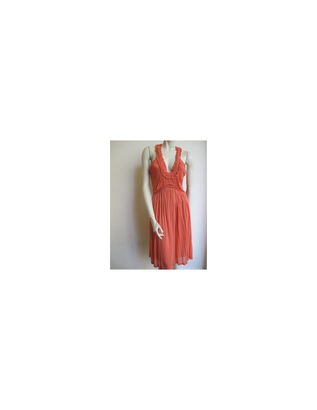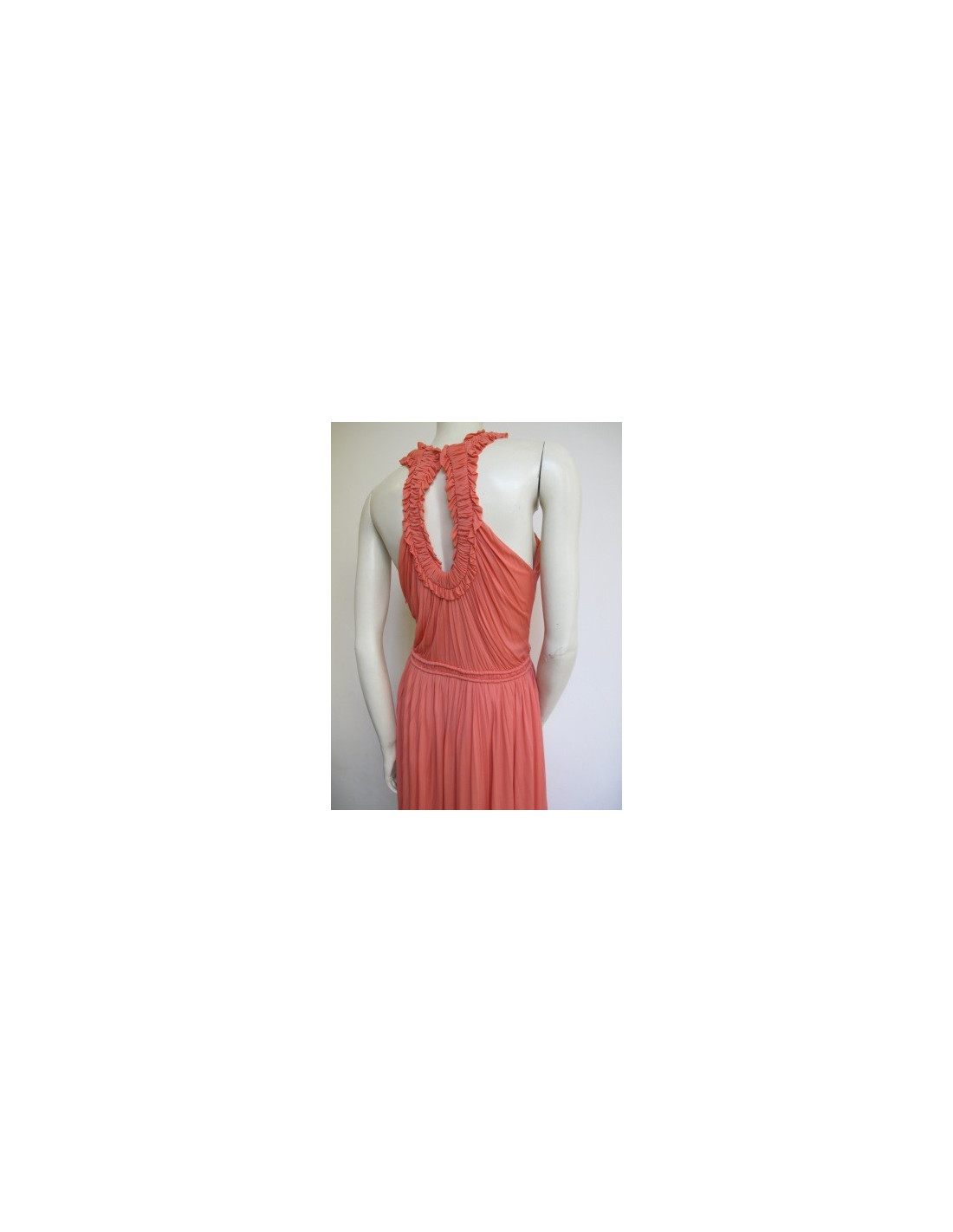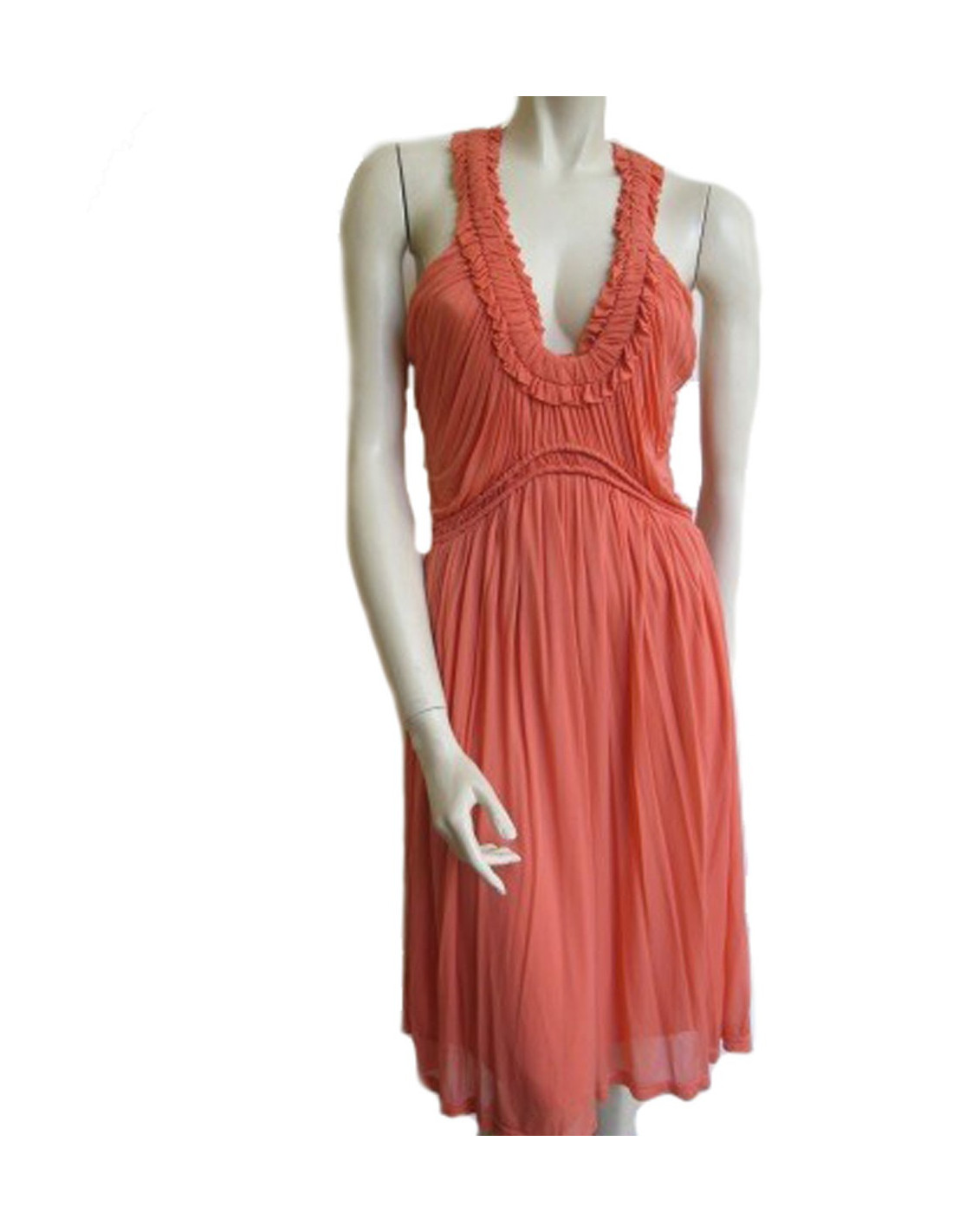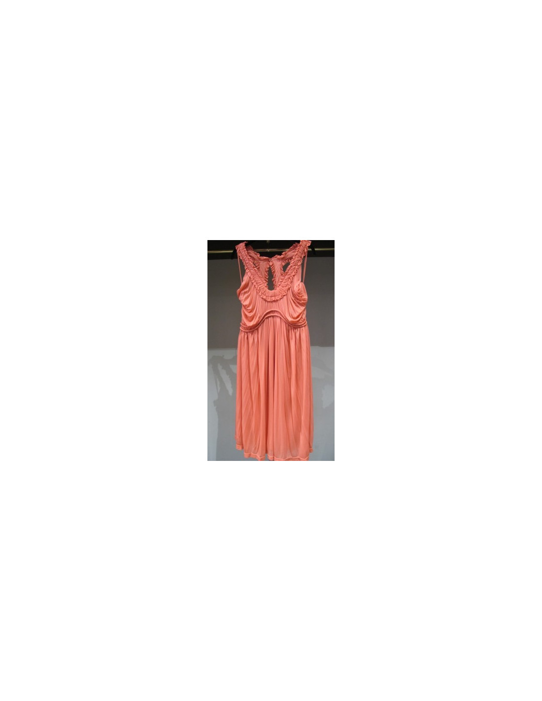 So Glamour! Dress Alexander McQueen coral, ruched, fluid, rounded neckline gathered with clips on the sides of the neck, possibility to group together them (see photo). Dress at the knees, shoulders uncovered. Double closure: invisible zipper on the left side and buttonhole at the top of the back. Size 42it is 38fr. 100% crupo.