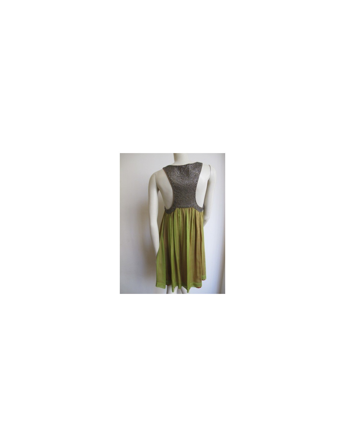 Ravishing! Dress bicolor Zakir sleeveless, rounded front neckline, back swimmer. The knees, fluid, line trapeze dress. Her top is embroidered with sequins adorned with bronze-colored beads and her bottom is in green silk. Lining fushia. Size 38. 100% silk.