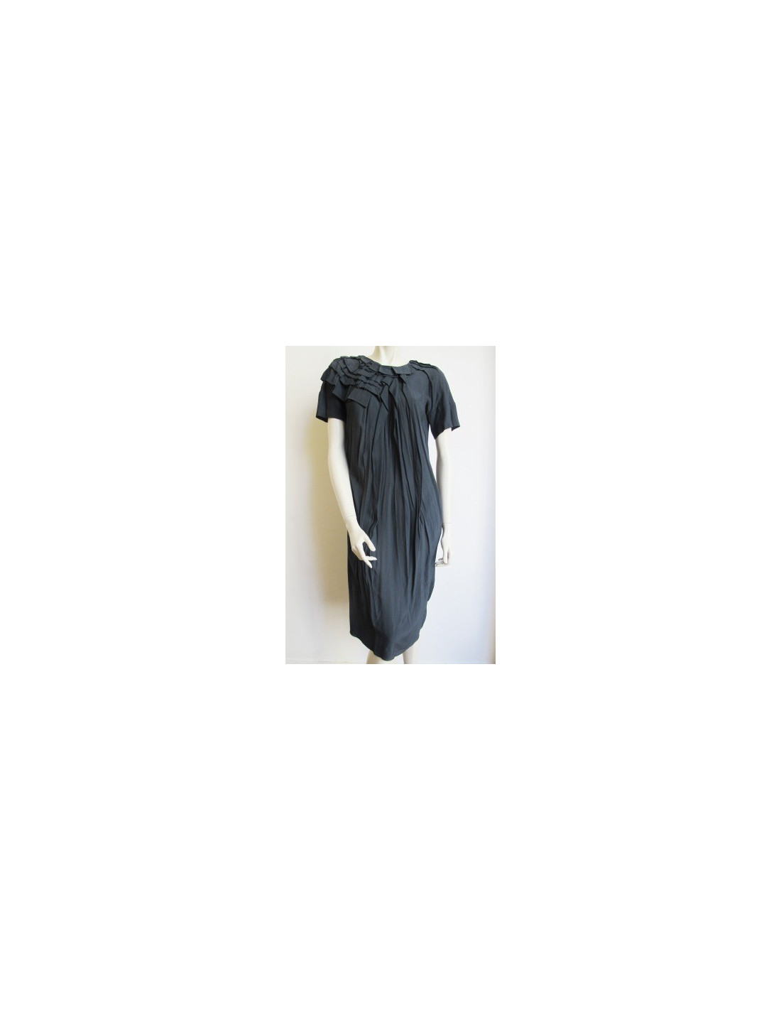 We Love! Dress English green Marni, short sleeves, round neckline gathered as well as on the top of the right side of the back. Dress folds flat, knee. Wide closure apparent on the back portion. Size 40it is 36fr. 100% viscose. Collection: Autumn/winter, color: English Green Measures flat: Length: 106 cmCarrure: 36 cm sleeve length: 20 cm height: 46 cm hips: 48 cm hem of the dress: 52 cm