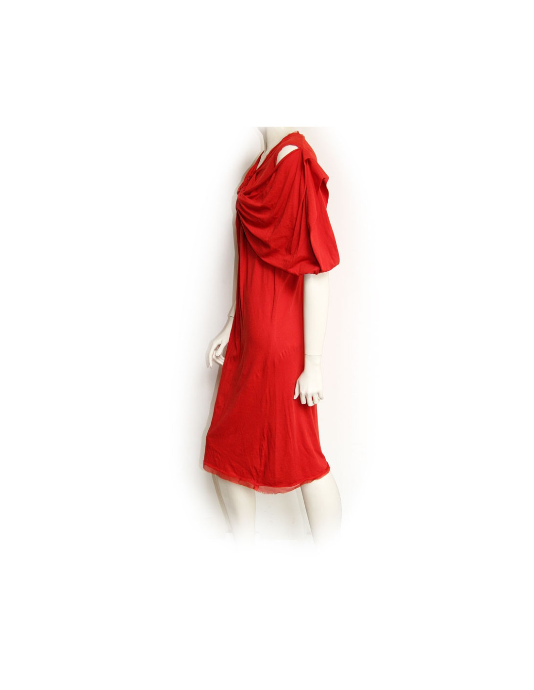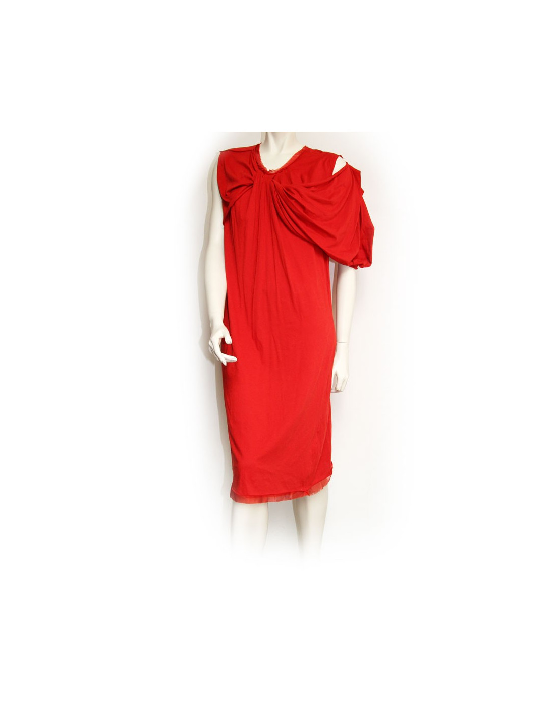 Pretty! Dress Lanvin coral, knee, neck, asymmetrical sleeves: sleeveless and short sleeve elastic left side right side. The front of the dress and the left sleeve are ruffles. The collar and the bottom of the dress have a silk lined "unfinished" effect. Size 40fr.