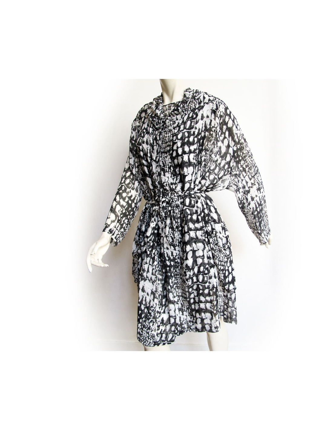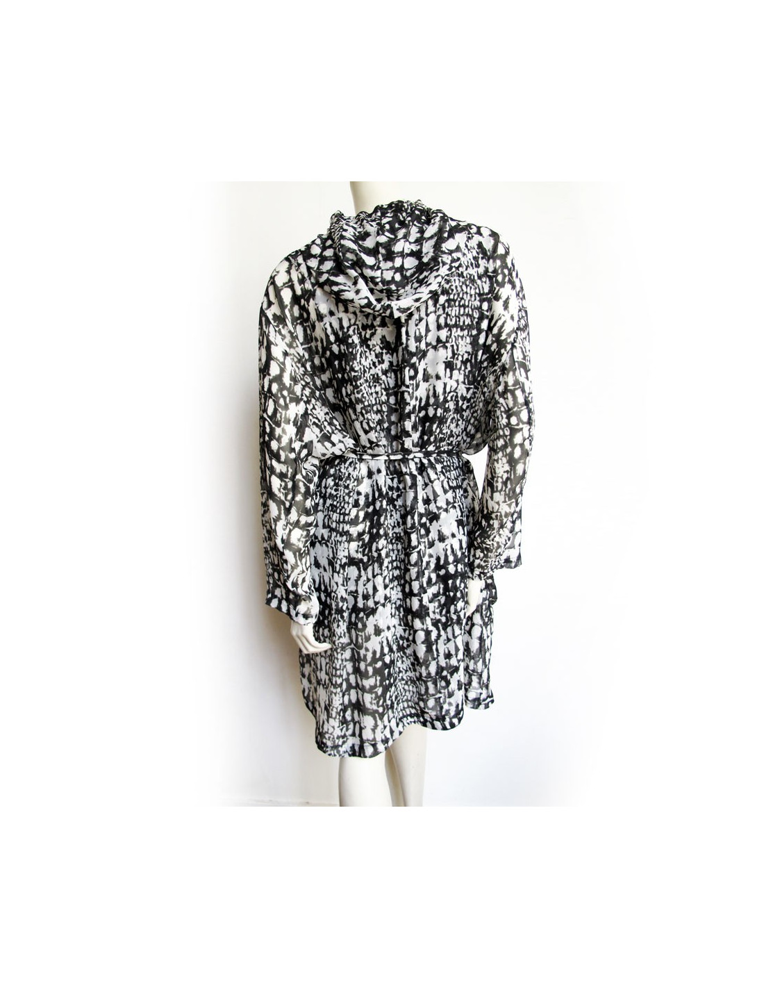 All dress and silk LUTZ HUELLE T36 top, printed black and white. Top/tank top in transparent silk with a very fluid and loose-fitting dress. It has a hood and a belt in the same material and size quits using pressure. It also has a large pocket of each side. In very good condition. TOP: Height: 67 cm, Width: at the level of the chest: 45 cm,At the bottom of the top width: 61 cm, Shoulder width: 3.5 cm dress: Height: 95 cm, Sleeve length: 54 cm,Shoulder width: 7 cm, Width at the level of the chest: 71 cm,Width at the waist: 74 cm, Knees width: 78 cm