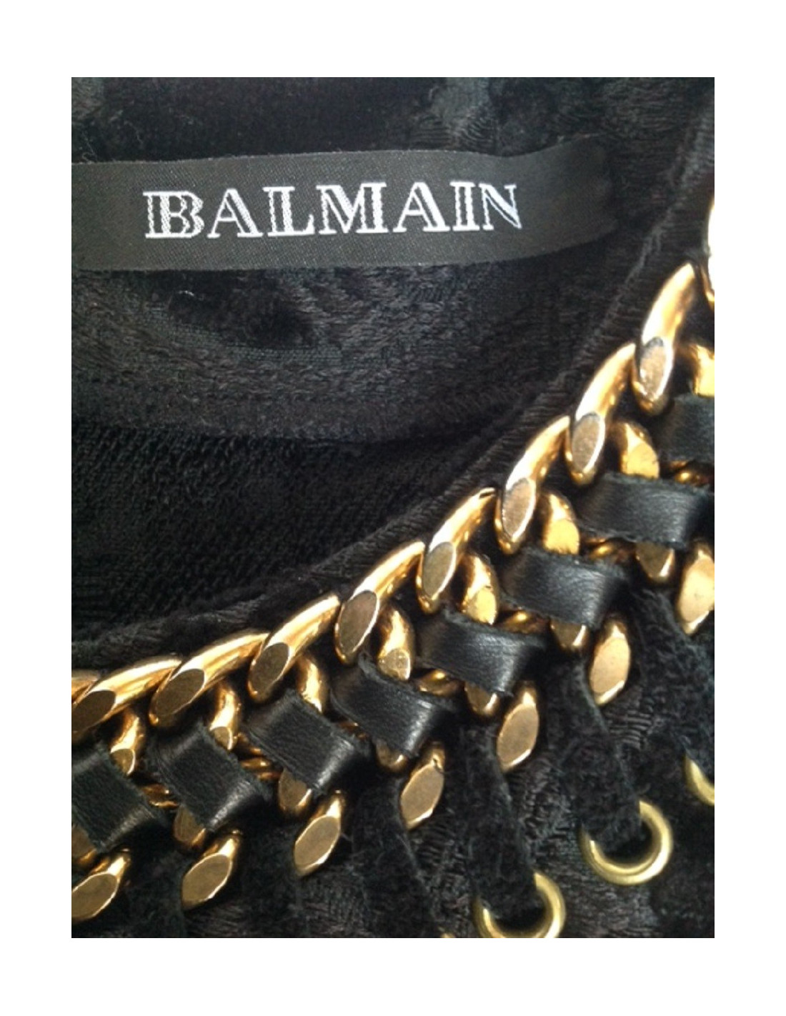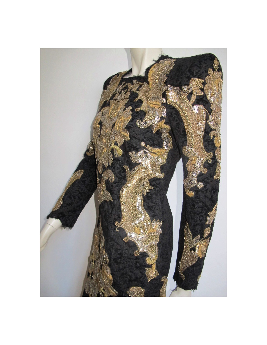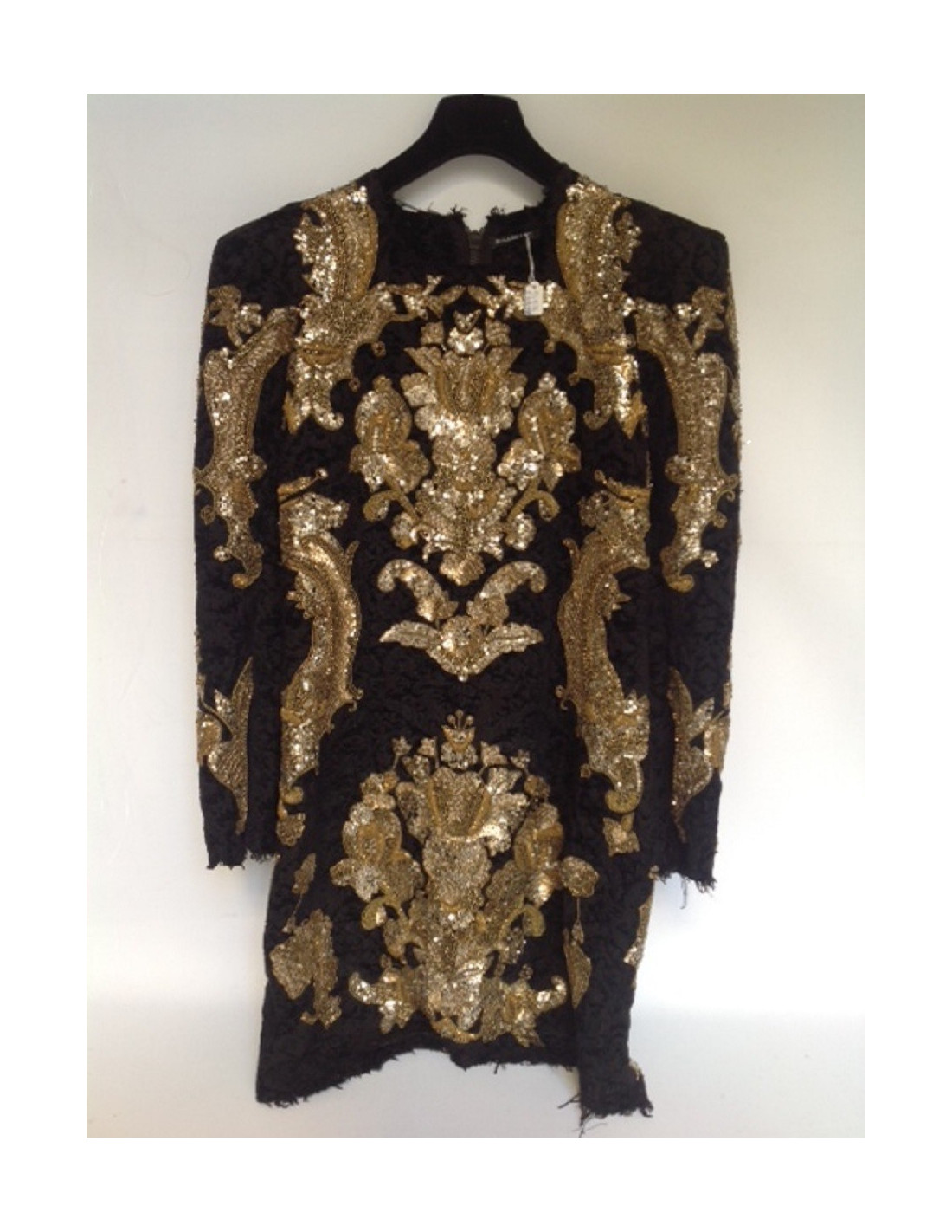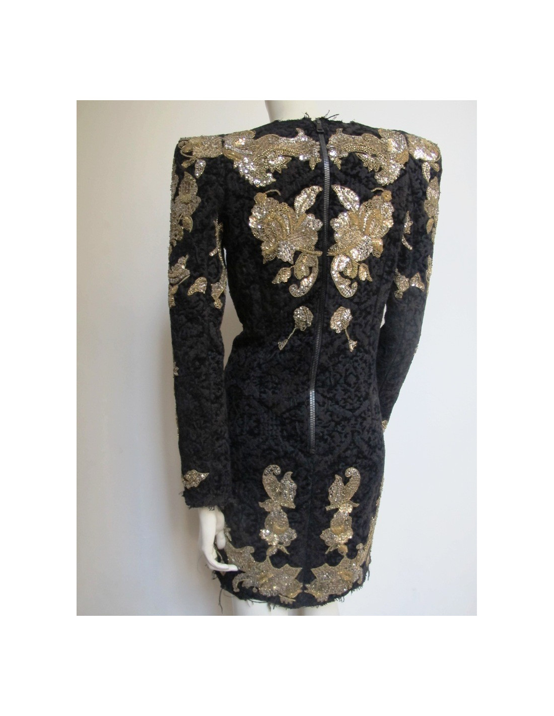 Dress T42 BALMAIN damask black velvet, embroidered with gold and metallic flakes Cut hem edges. Exceptional piece. F/W 2010-2011 collection. New condition. Size 42- Height: 89 cm- Width at the level of the chest: 44 cm-Hip width: 48 cm Width at the bottom of the dress: 54 cm- Sleeve length: 62 cm Shoulder width: 42 cm but increased by shoulder pads (for info retail price: + 10000th)
