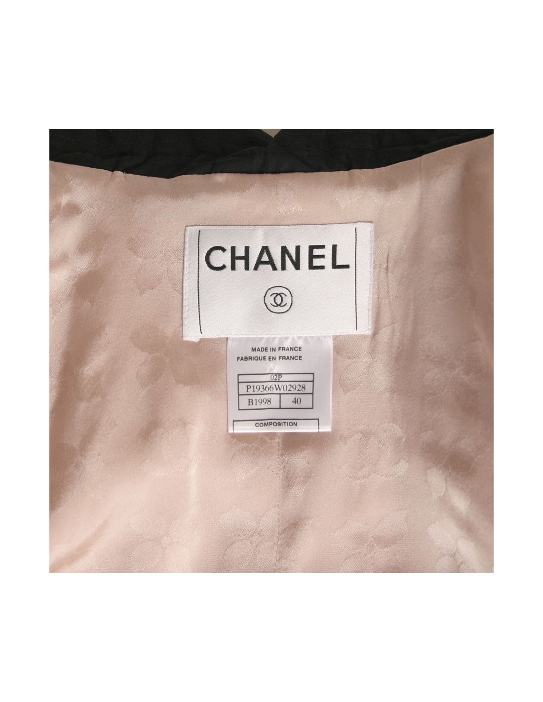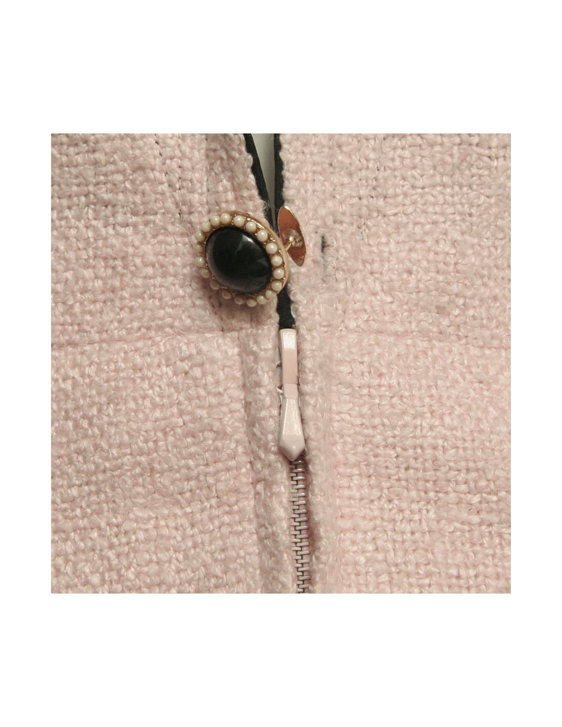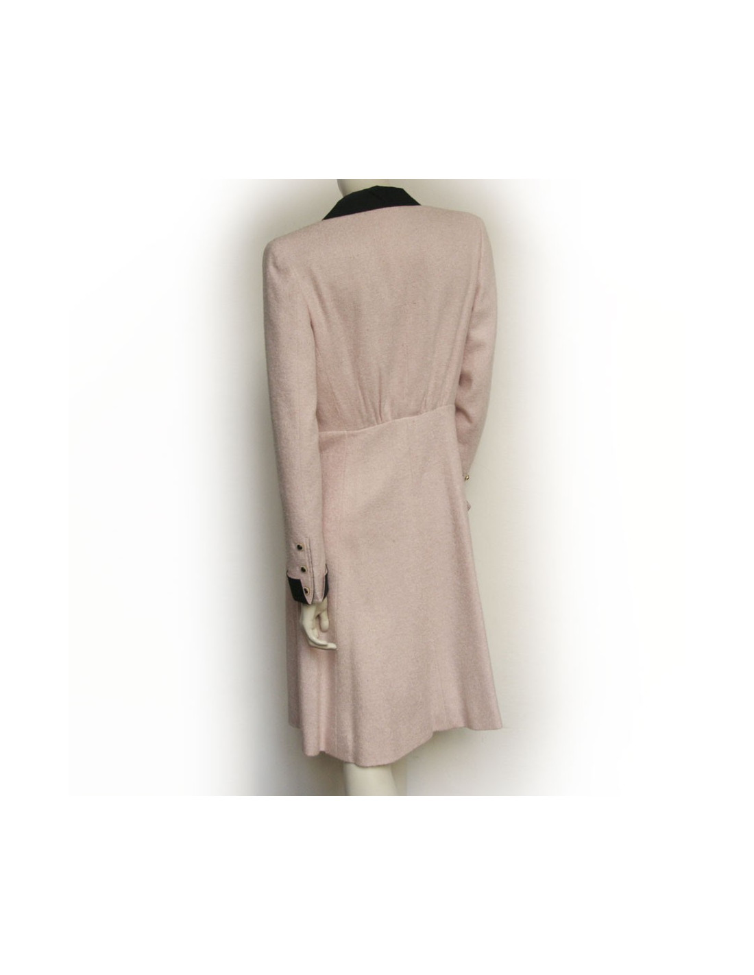 Dress coat Chanel silk rose pale, T 40. Collection 02 P (spring 2002). The collar and pockets are stitched cloth of black silk, lining also. Closing with a black sewing button and des perles blanches ainsi qu'un zip qui ferme jusqu'en bas. 4 poches plaquées. En très bon état. Ce vêtement a été nettoyé chez un teinturier de renom, mais il reste néanmoins quelques traces sous les aisselles très légères