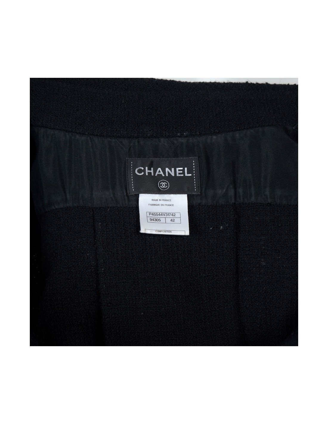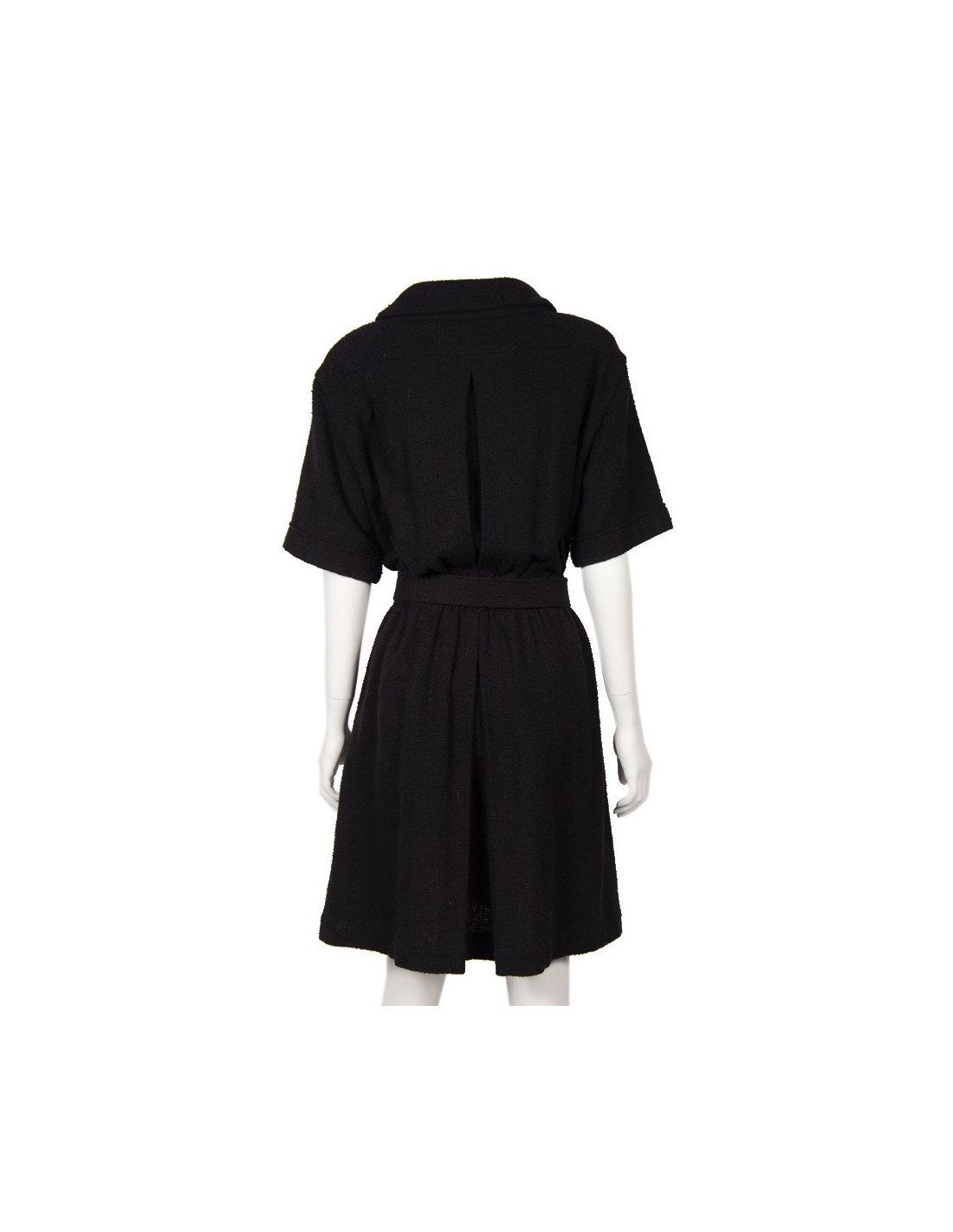 Stunning dress "Paris-Singapore" of a great classicism, size 42 Chanel in black tweed. It has short sleeves, two pockets on the chest, a size compressed by a large rubber band and two other large pockets. It closes from top to bottom by Silver buttons gratings with a double 'C' at the centre. To mark more the size there is a belt lined with black leather with a black enameled rectangular loop. (for information, public price 4000 EUR) size flat: pending shoulder width: 53 cm - width under the chest: 53 cm - size 41 cm - height: 97 cm - width of the bottom 70 cm It will be delivered in a Chanel bag