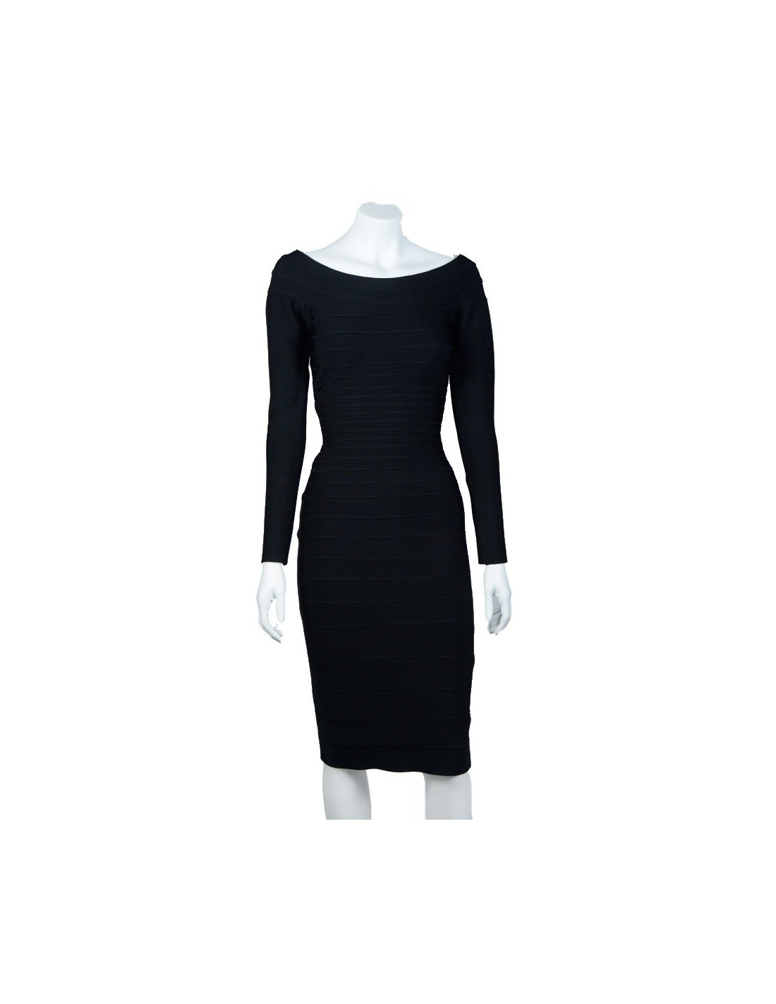 Dress Hervé Leger black strech in size S, cut to put women in value. This black dress is an essential piece of the Herve Leger Collections. It is composed of black horizontal bands that refine the silhouette and you will make even more alluring. Closing rear central zip.