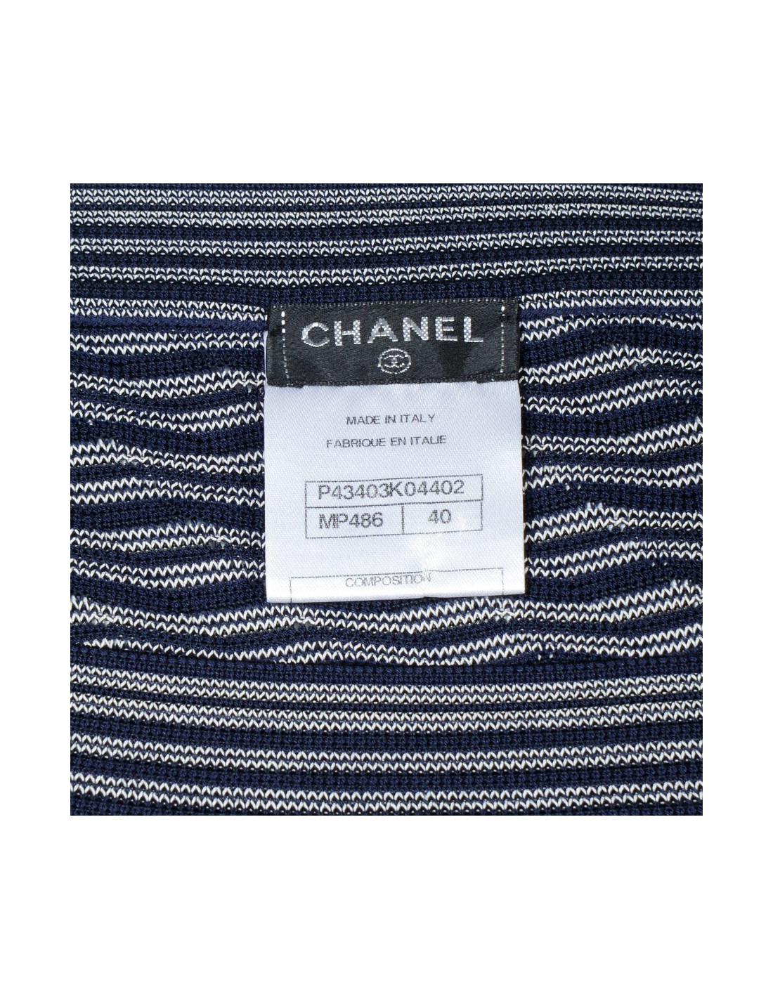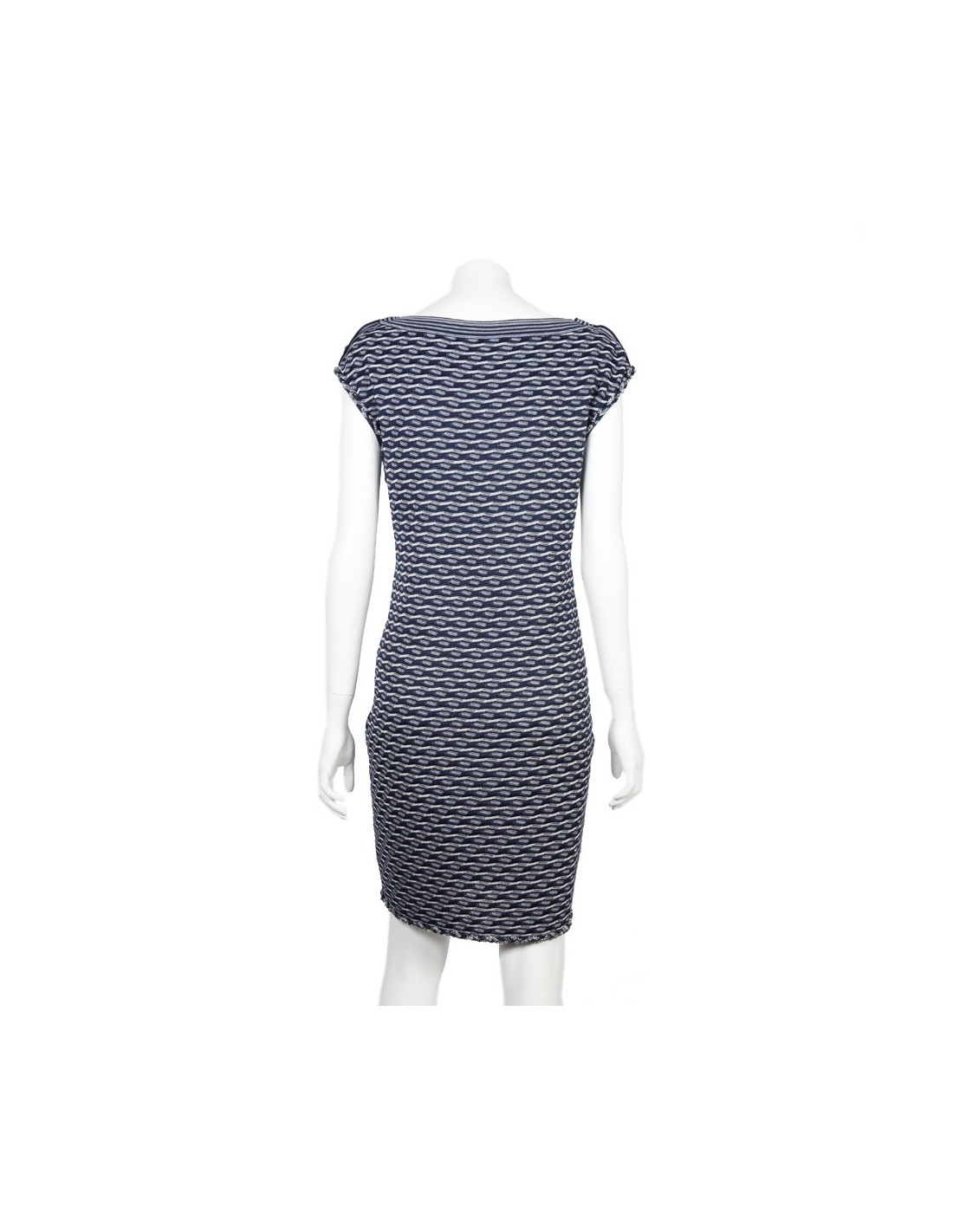 Dress Chanel T 40, color Navy Blue and white, in stretch viscose. Recent collection. Consisting of two false pockets at the bottom of the dress and three buttons on each shoulder. The dress is quite close to the body, it fits perfectly the forms. In very good condition.