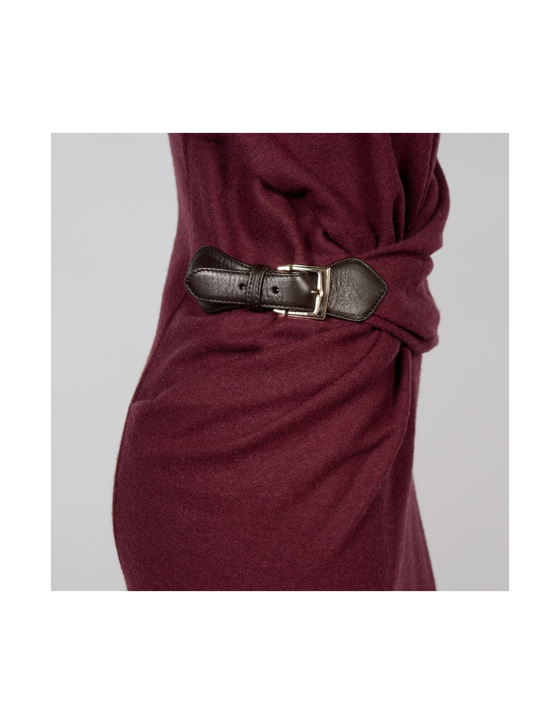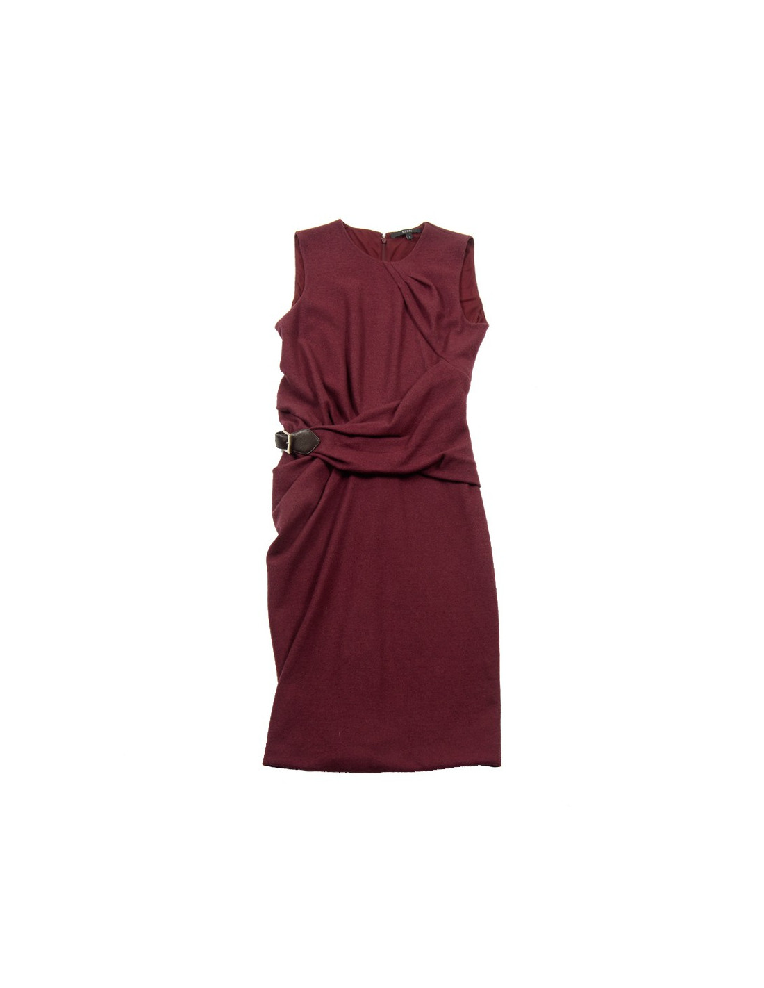 Gucci sleeveless plum dress in wool with a drape attached by a belt buckle at the waist. Mid-length dress with zip on the back.