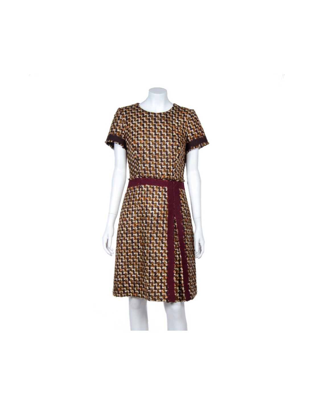 Dress Prada knee wool in shades of Brown. Size 42 Italian, is equivalent to a 38 french. Wool Brown tweed with a plum pattern dress. Short sleeves. Zip at the back of the dress. Silk lining. The dress form flared as well as a slot on the front fold.