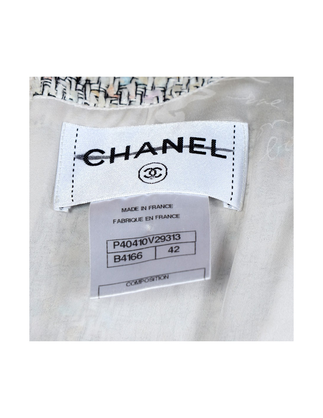 Dress Chanel strong cotton in pastel shades. Size 42. The lining is silk. Zipper in the back. A brooch in the shape of Camellia is attached to the level of the heart which dresses and distinguishes the dress. The top of the dress is slightly lighter than the bottom. In very good condition.