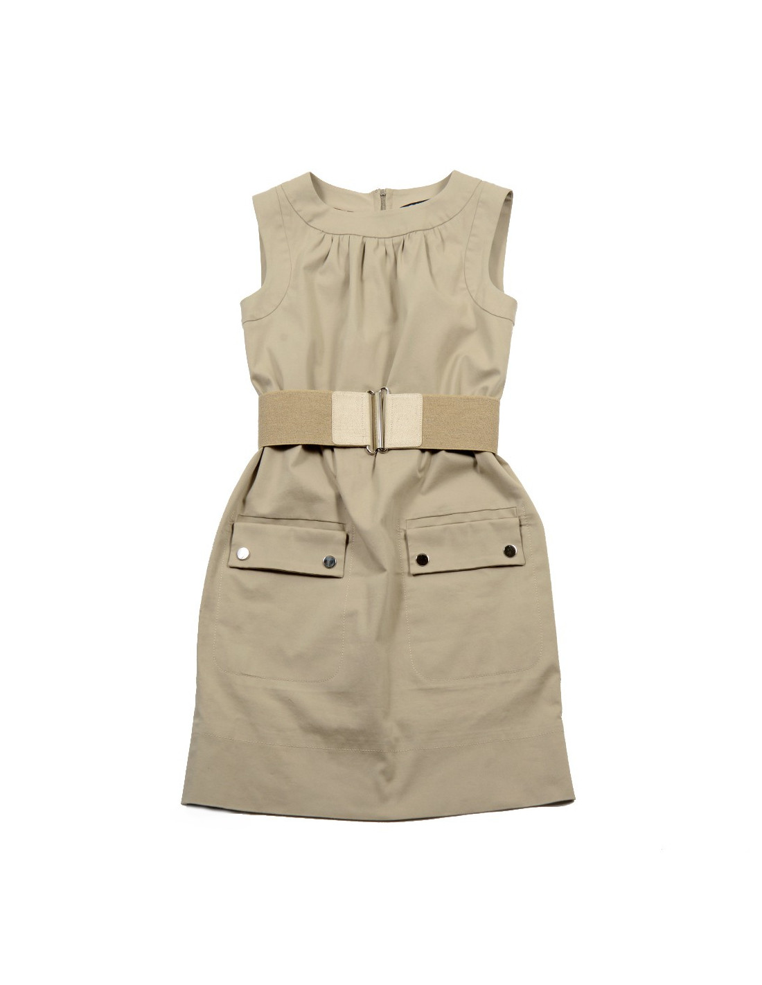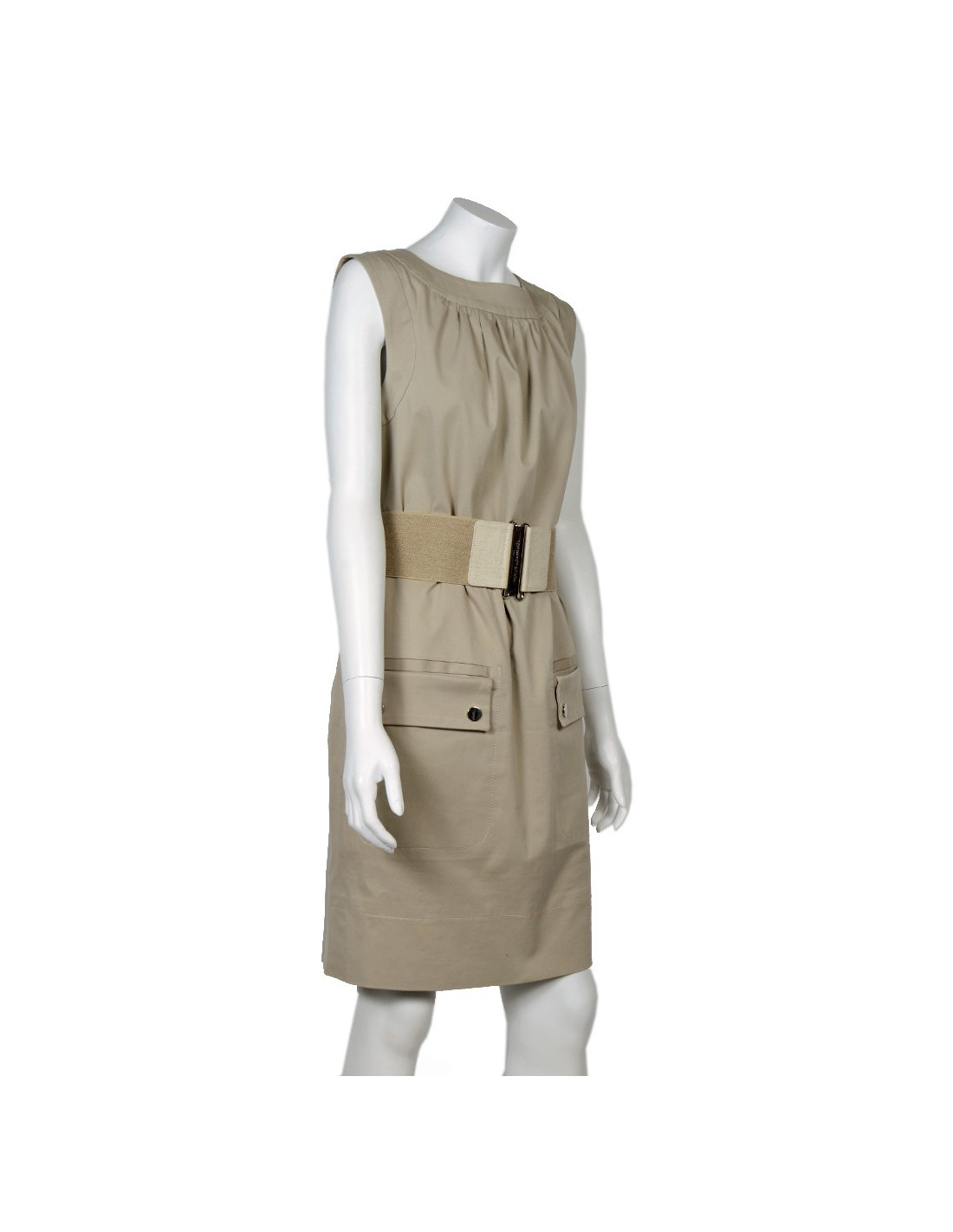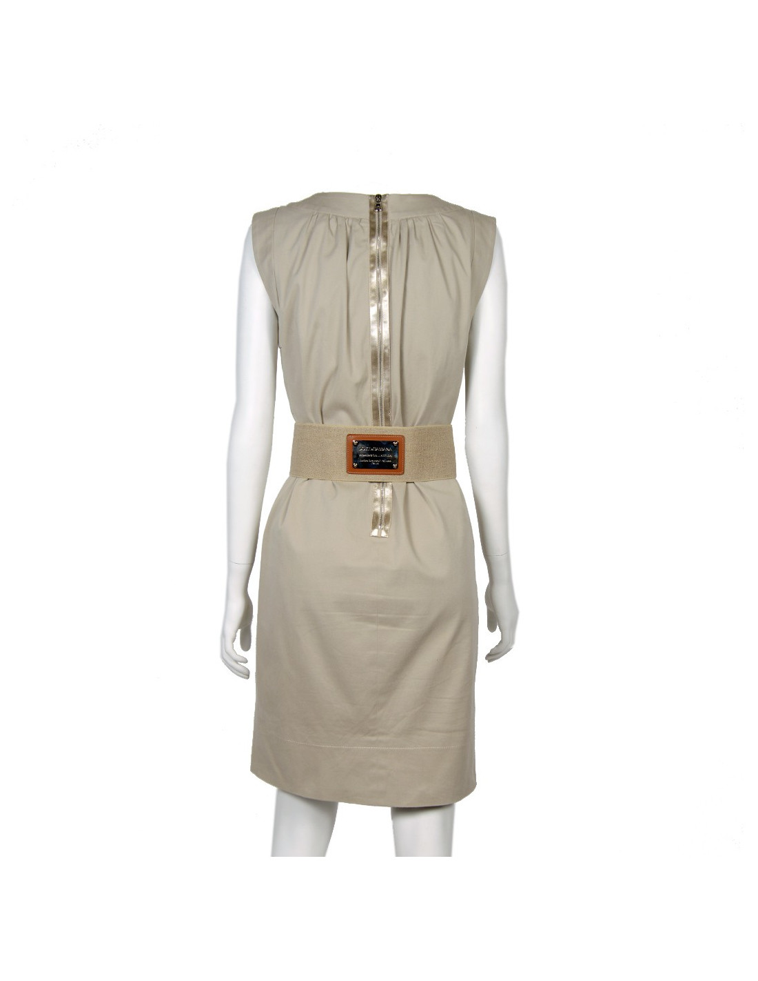 Dolce Gabbana & dress in beige color cotton. Size 44 Italian is a French size 40. The lining is leopard print. Zipper in the back. A flat on each side pocket. A wide belt stretch just tighten the size. At the Center, a patent leather and metal plate silver with the inscriptions "Dolce & Gabbana..." In very good condition.