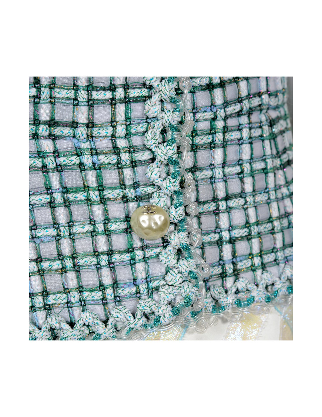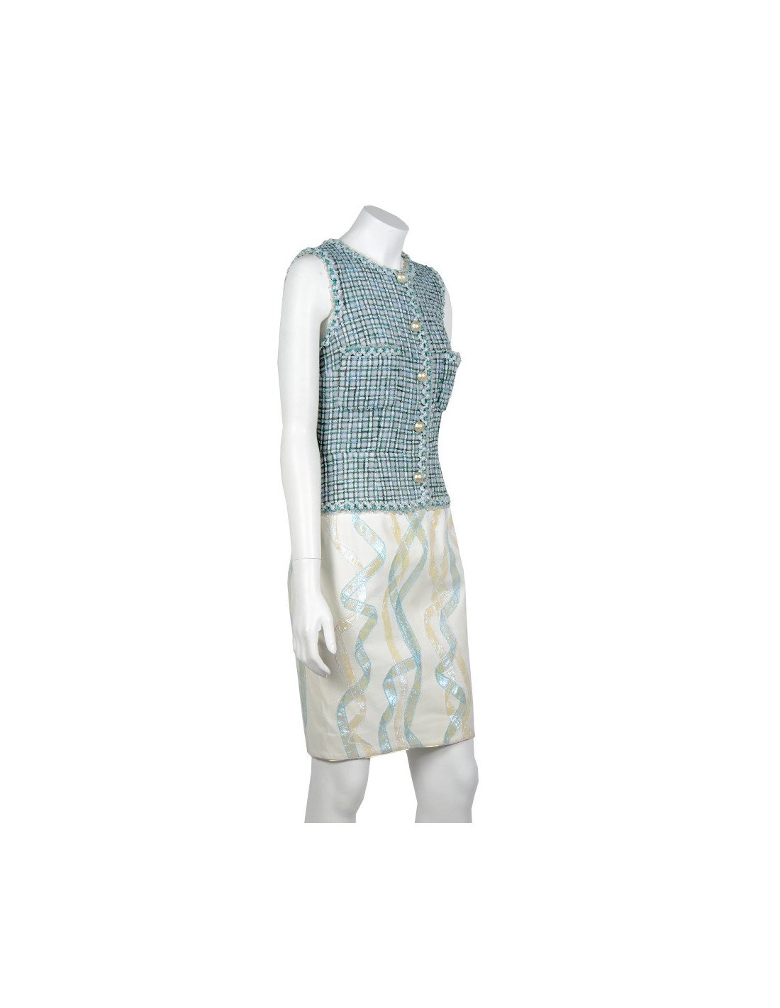 Precious dress Chanel T36, ready-to-wear summer 2012 issue. The top is interlaced with son and sailing turquoise and bright, surrounded by transparent plastic son. The bottom is leather lamb ecru, topstitched of twist in turquoise and white veil. The dress is fitted with six buttons large pearls. There are two zippered closures one on top one on the bottom. The lining is silk. A few indelible traces on the lining. This piece is the result of painstaking work and requires the naming of couture.
