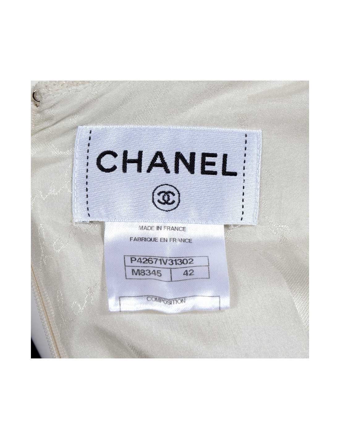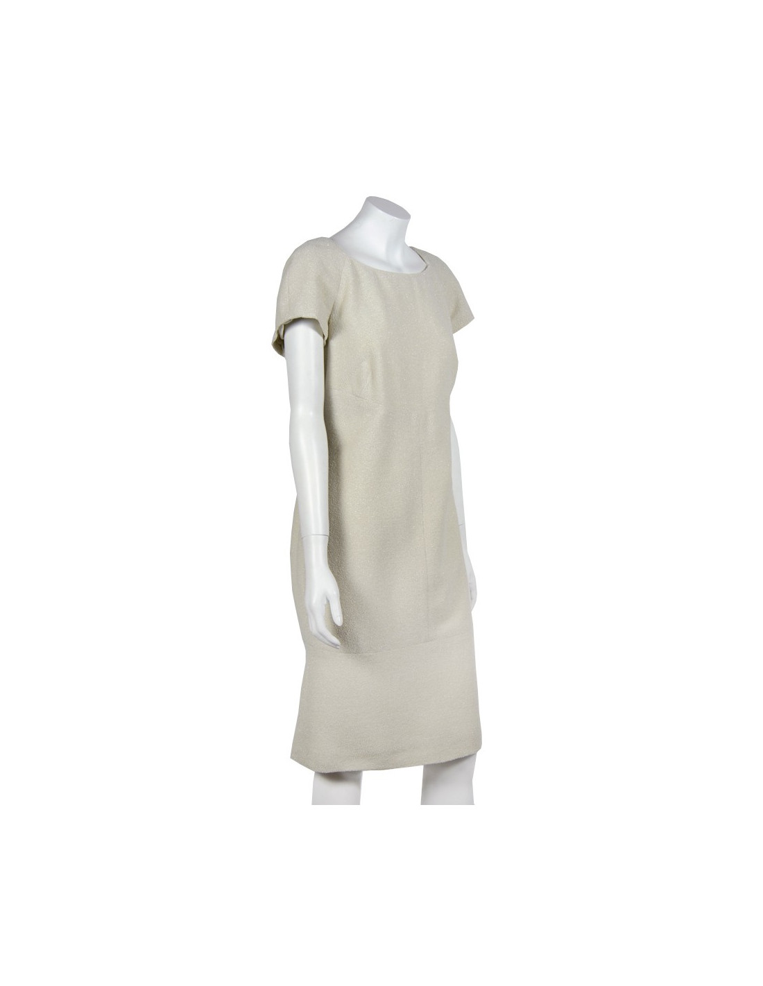 Timeless dress from the House of Chanel size 42 in wool and silk, Ecru color and son silver inlays, straight cut, puffed short sleeves. The lining is silk with impressions Chanel. The dress closes in the back by a long, thin zip.