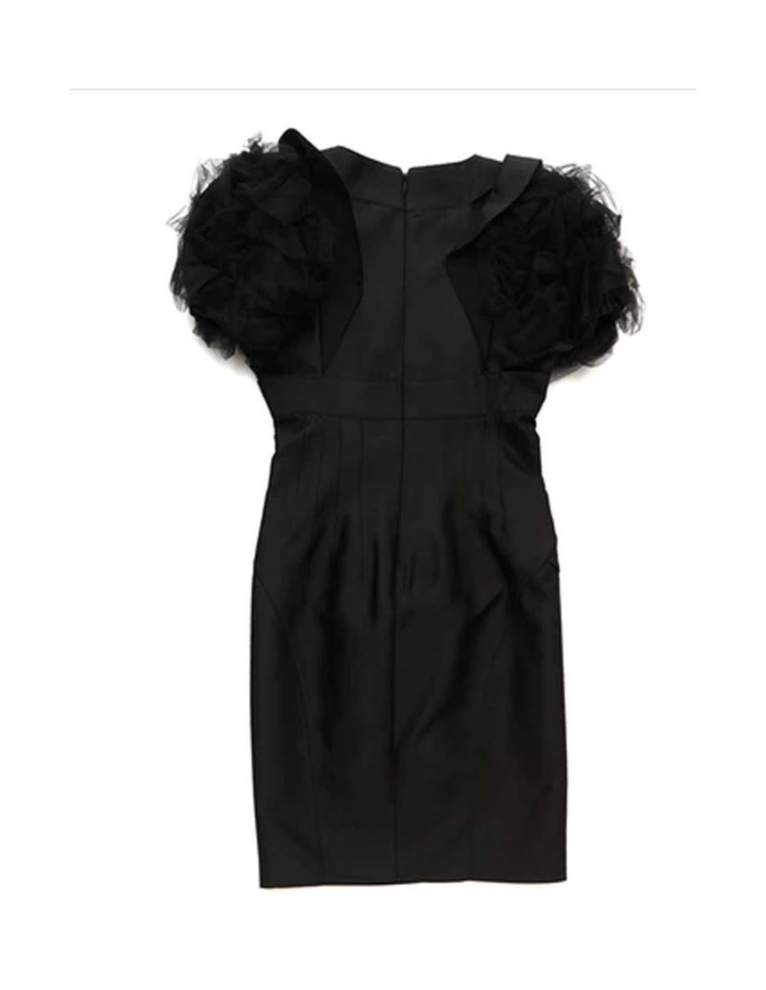 Details: Fendi black dress Italian size 42 (corresponds to a 36FR), in black wool and silk with a slightly satin effect. Openwork details at the bust and balloon sleeves in black tulle energize the line of this dress. It fastens with an invisible back zipper.