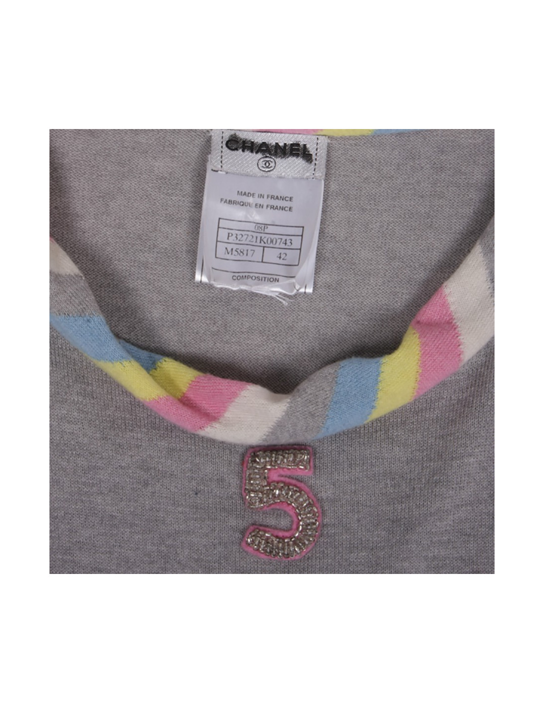 The figure "5" (symbol of the House of Chanel) embroidered in pearls silver below the collar. < /p >