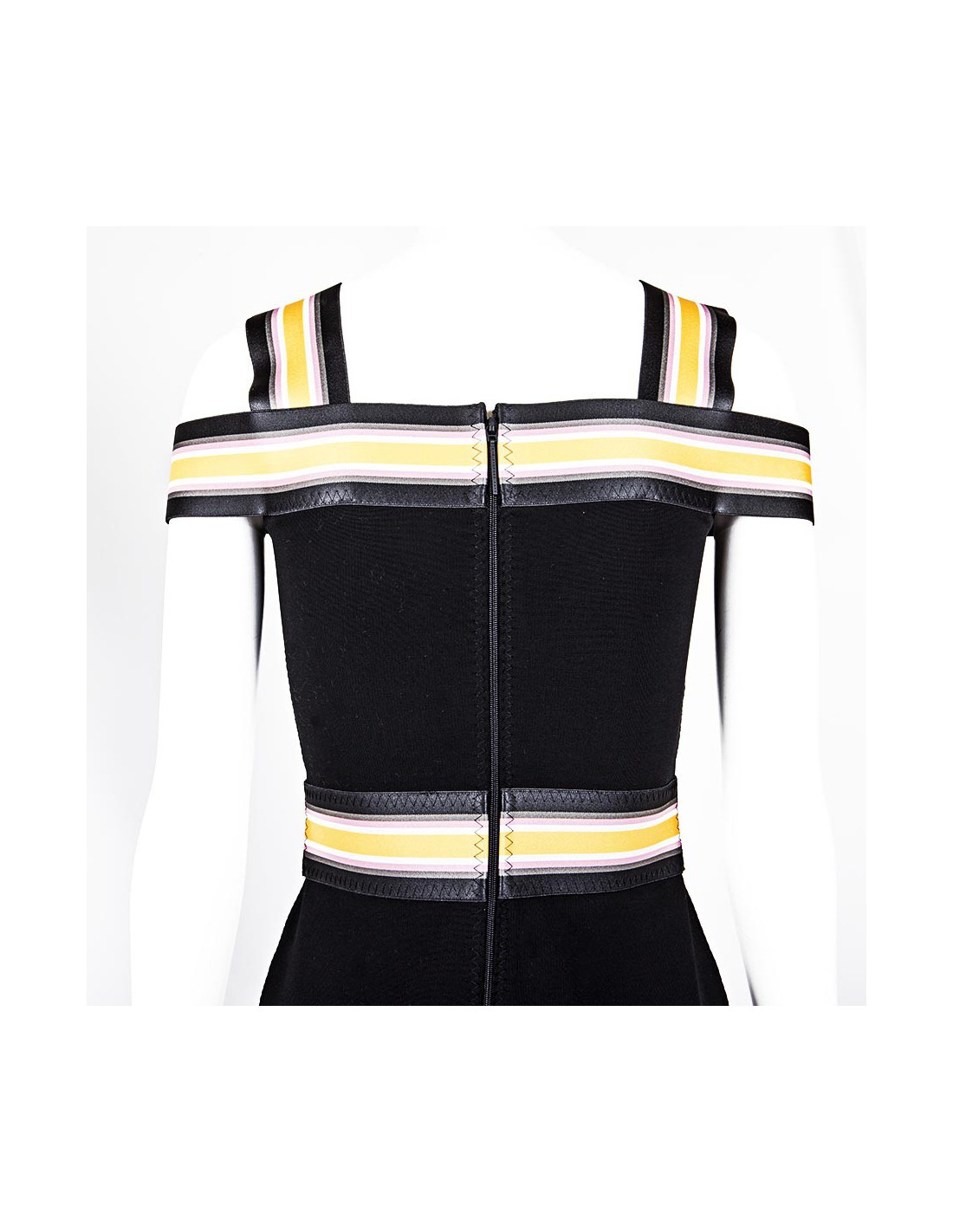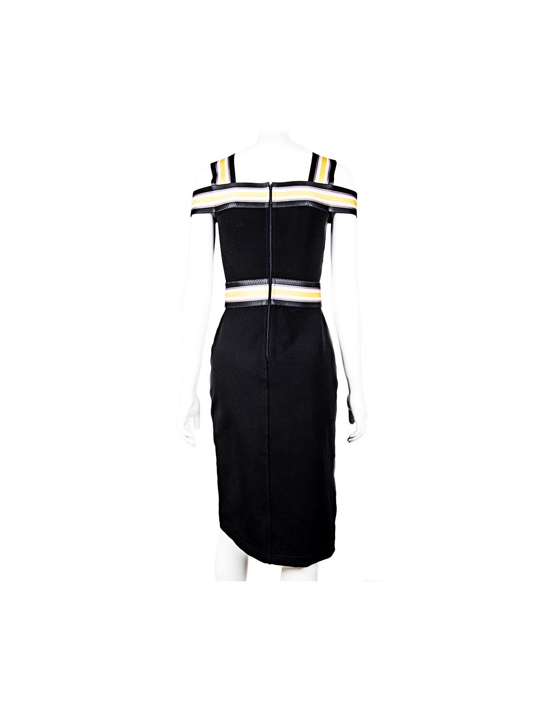 Sheath dress fitted at the waist, decorated with ribbons in spandex colored marking the turn of shoulder, the size and the straps. On the back, a zip with a clip as a seam similar to the center that runs to the bottom of the dress. Very good condition.