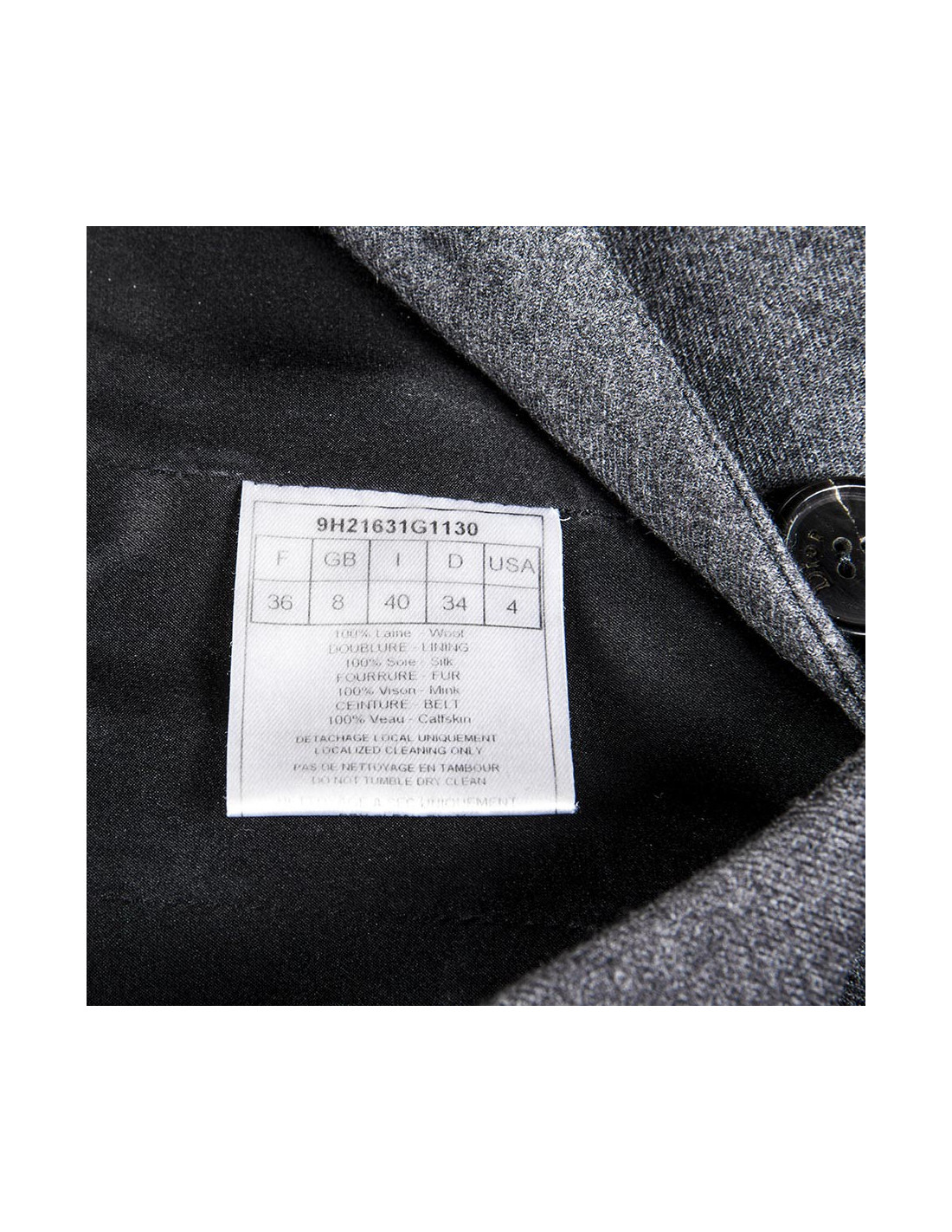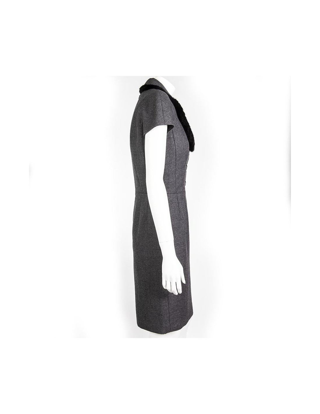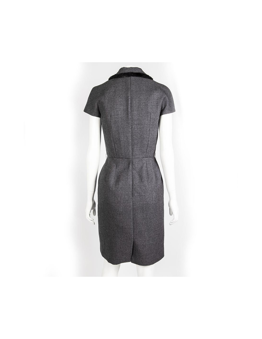 Sheath dress in wool grey sleeves raglans Christian Dior size 36 fr. closed by three buttons Brown acronyms Dior, the pass is true black mink. The dress is lined with silk and zipped at the back.