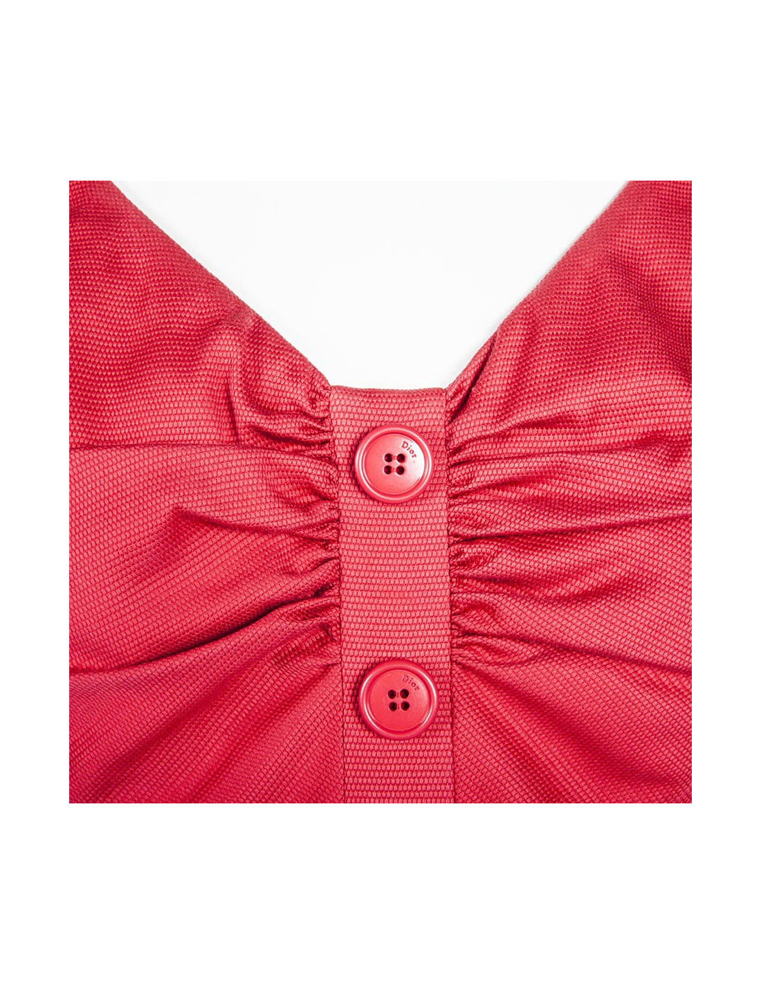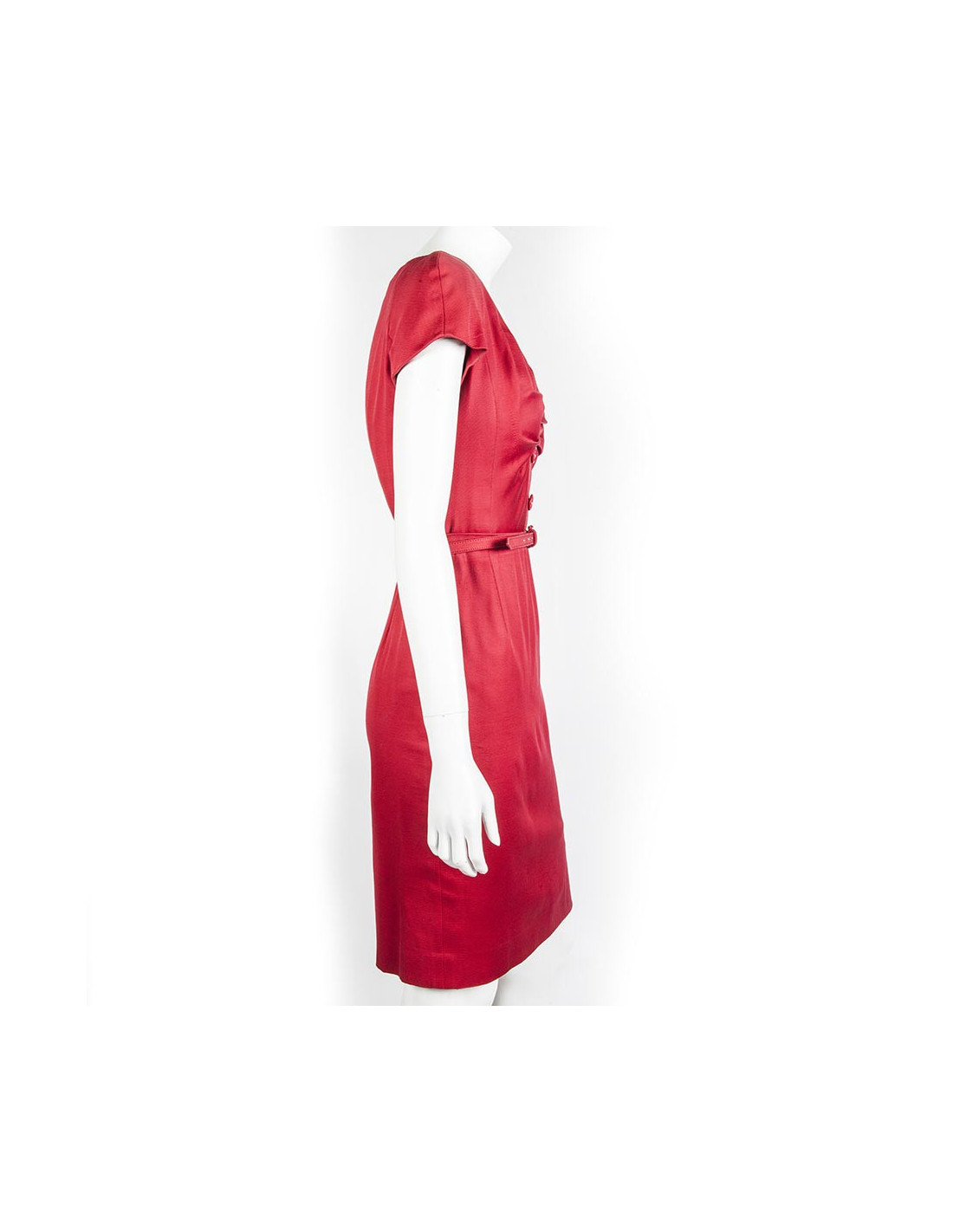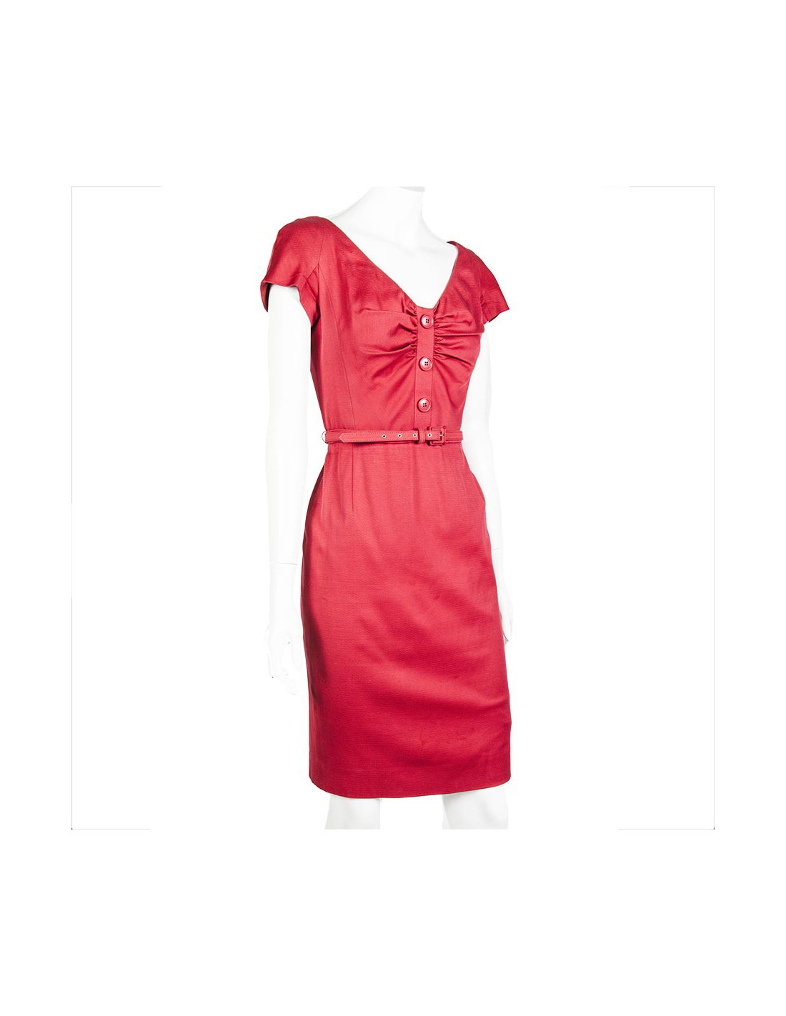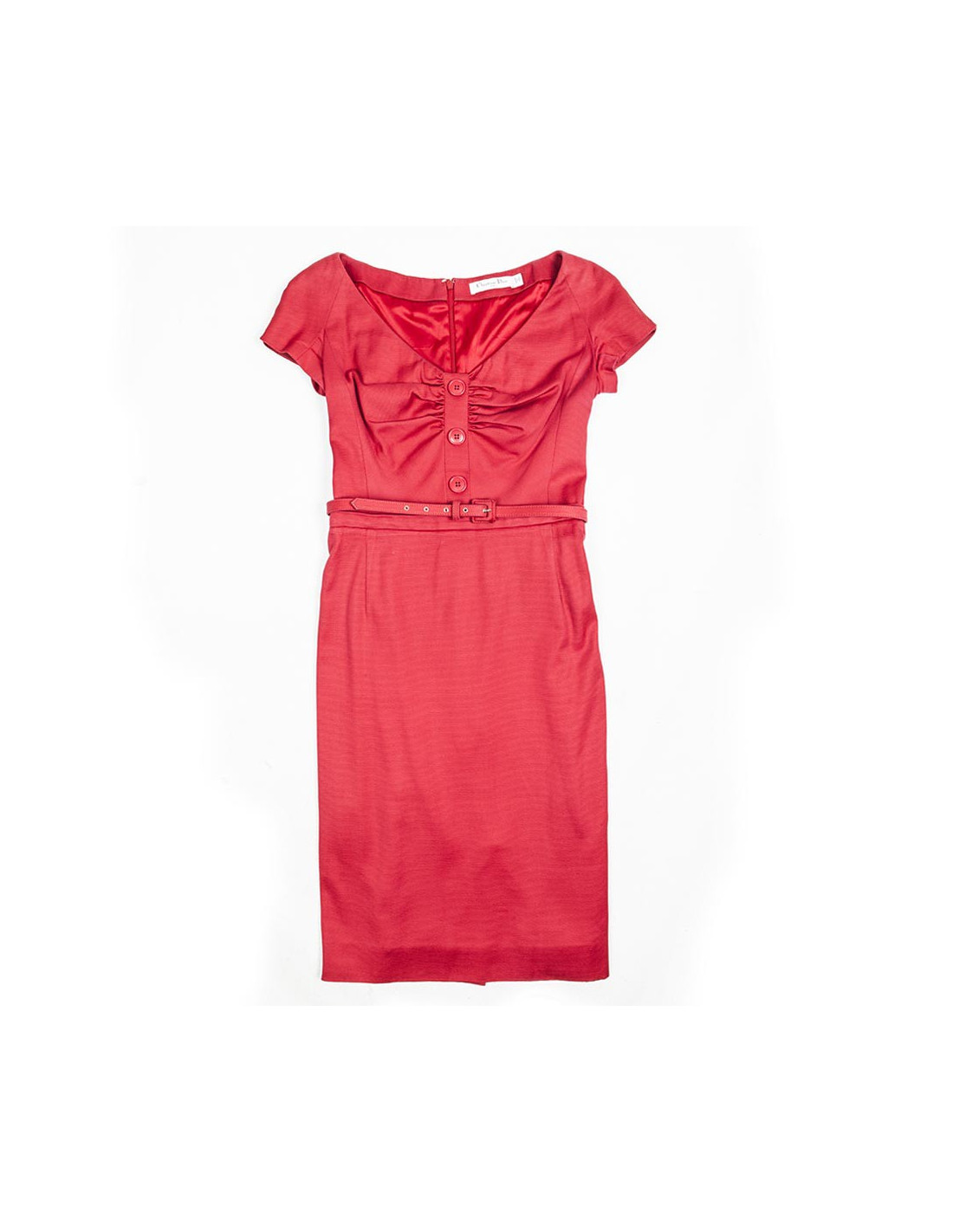 Christian Dior-red cotton short sleeved sheath dress size 38. Discreetly zipped at the back, the bust is adorned with a row of three buttons acronyms "Dior" surrounded by an elegant drape. Lined with silk, the dress comes with a matching dress leather belt.