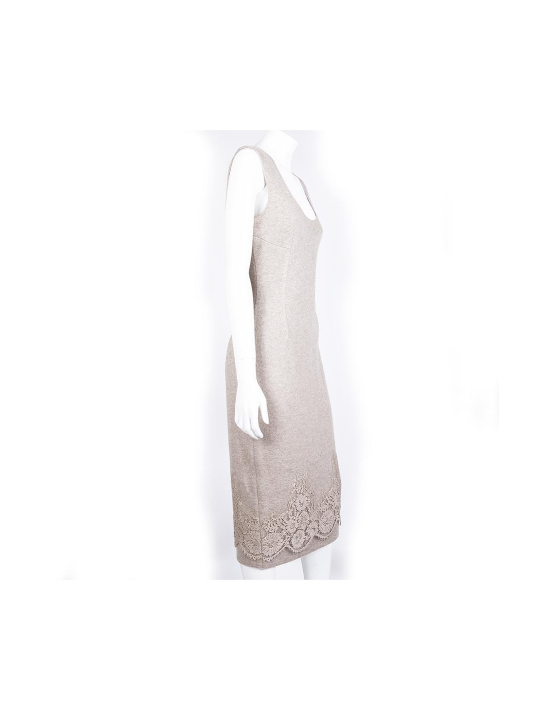 Dress long sleeve, sleeveless cashmere Ermanno Scervino size 44 Italian, corresponding to a French size 40. The dress is decorated with pieces of beige lace on the bottom. Simple and elegant, it is zipped on the left side.