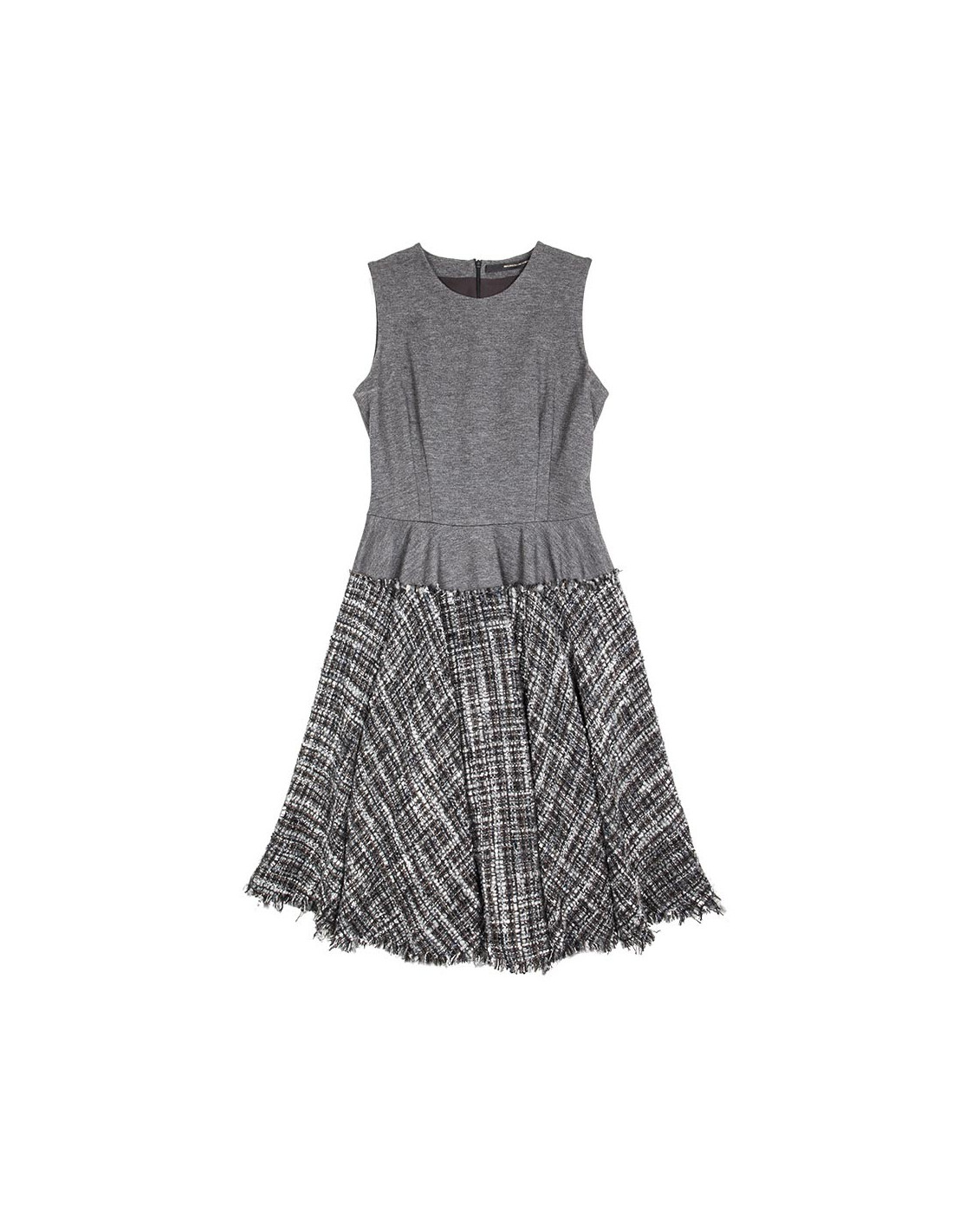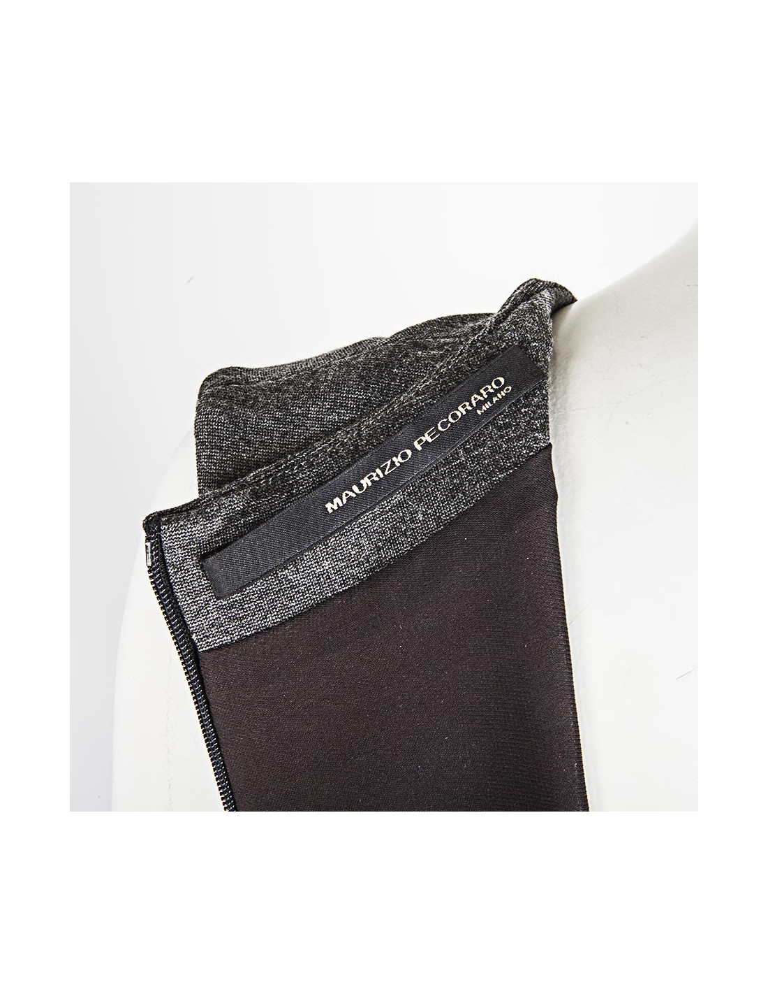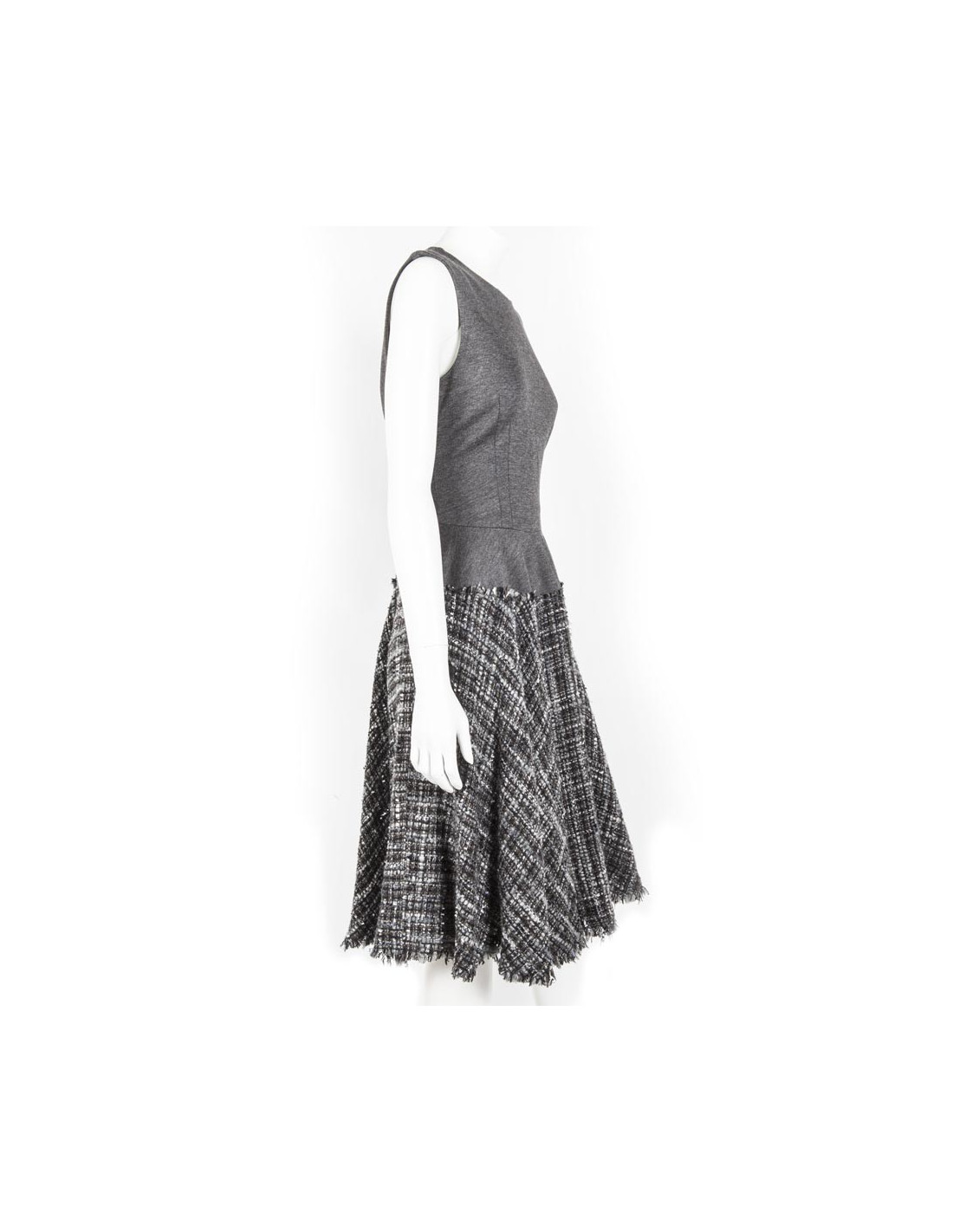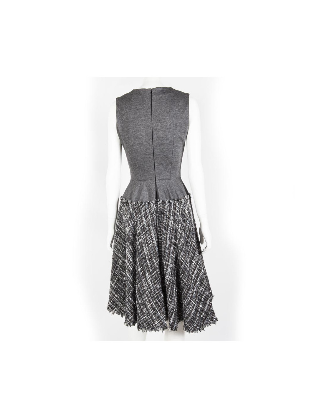 Dress without sleeves in silk and Lurex (see label) gray Maurizio Pecoraro size FR 38 The dress is fitted, the lower part is in Tweed grey, very fluid and large-scale. The upper part is discreetly zipped at the back, the dress is lined with polyester, fluid and pleasant.