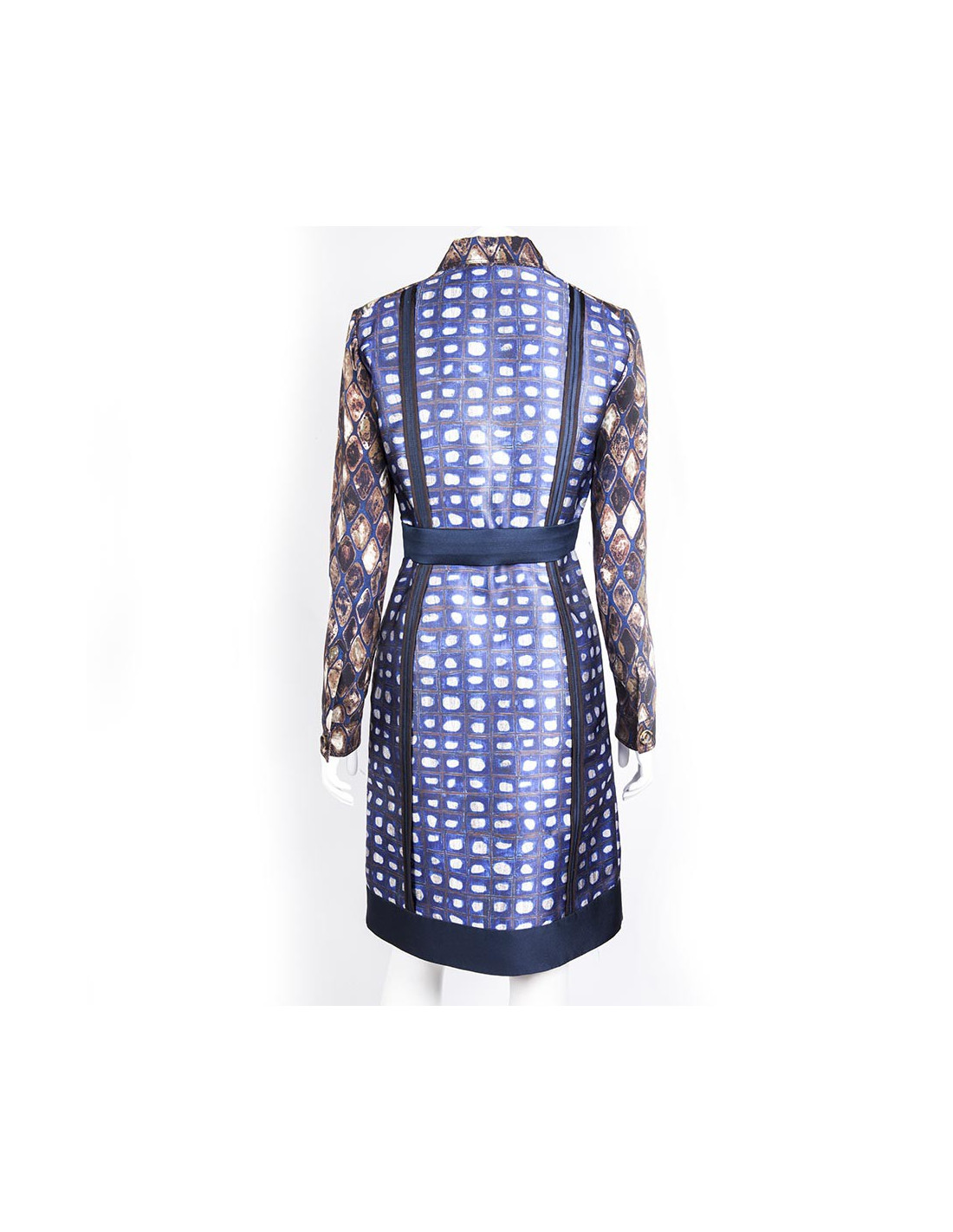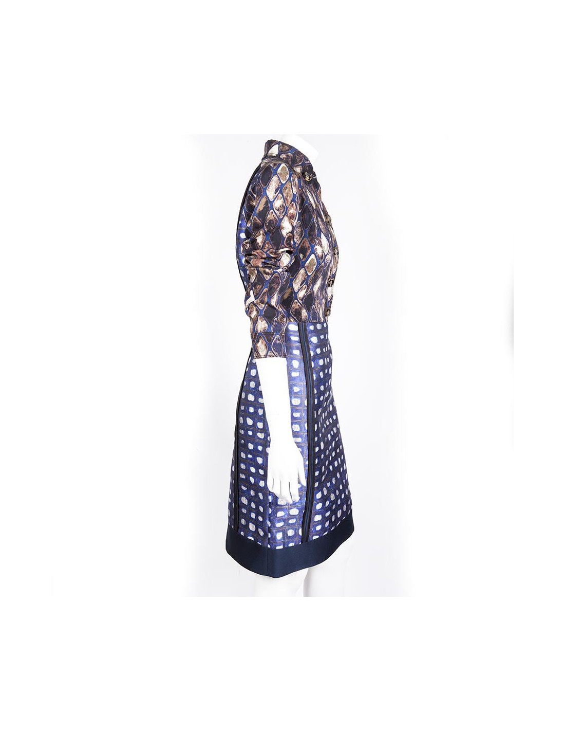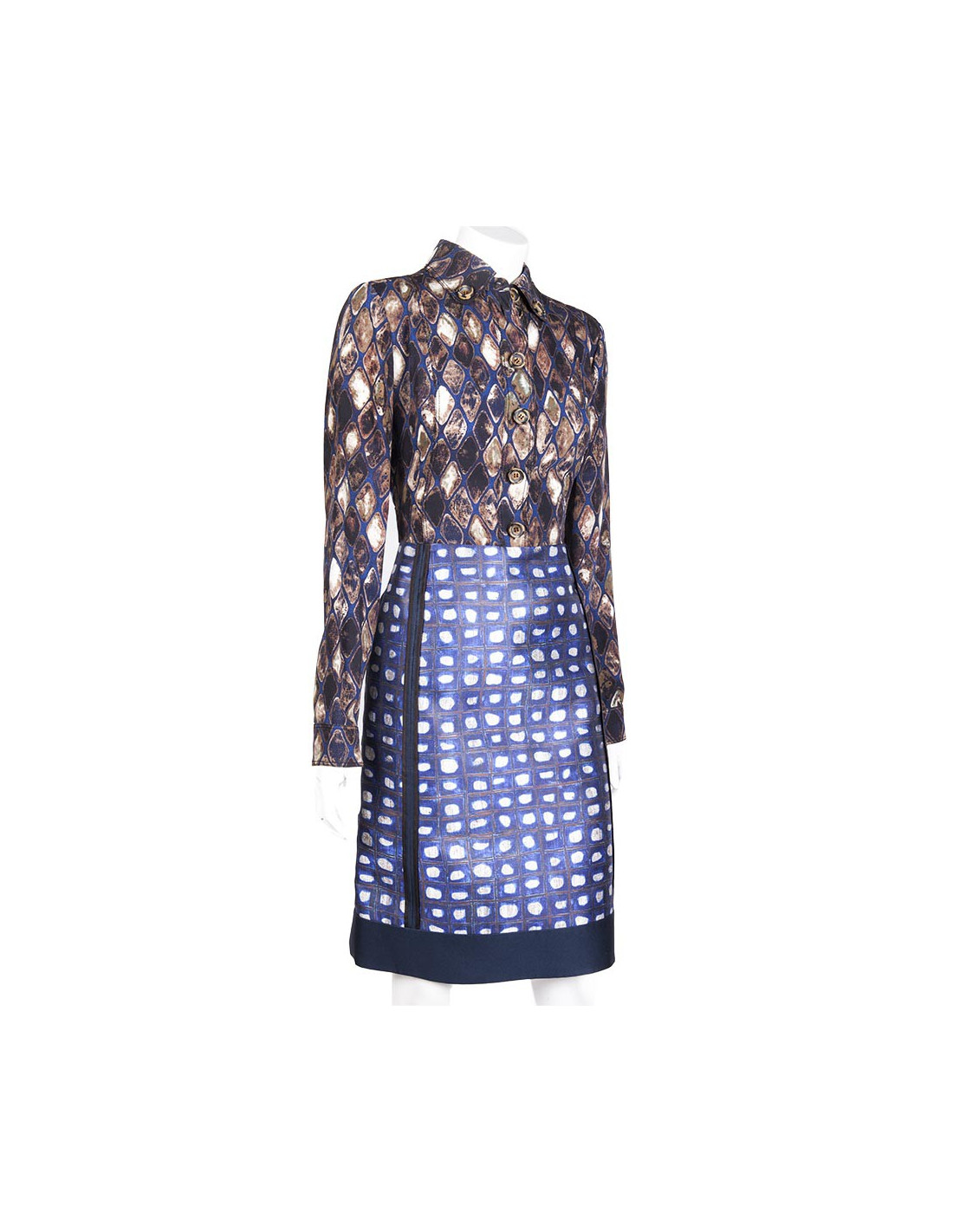 The top of the dress is in a different fabric in silk, giving the illusion of a blouse. Horn buttons. Colors: blue, Brown, beige, gray.