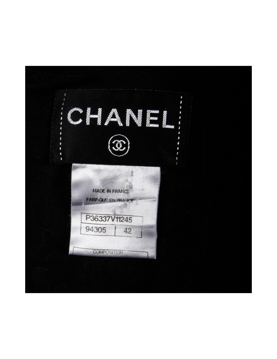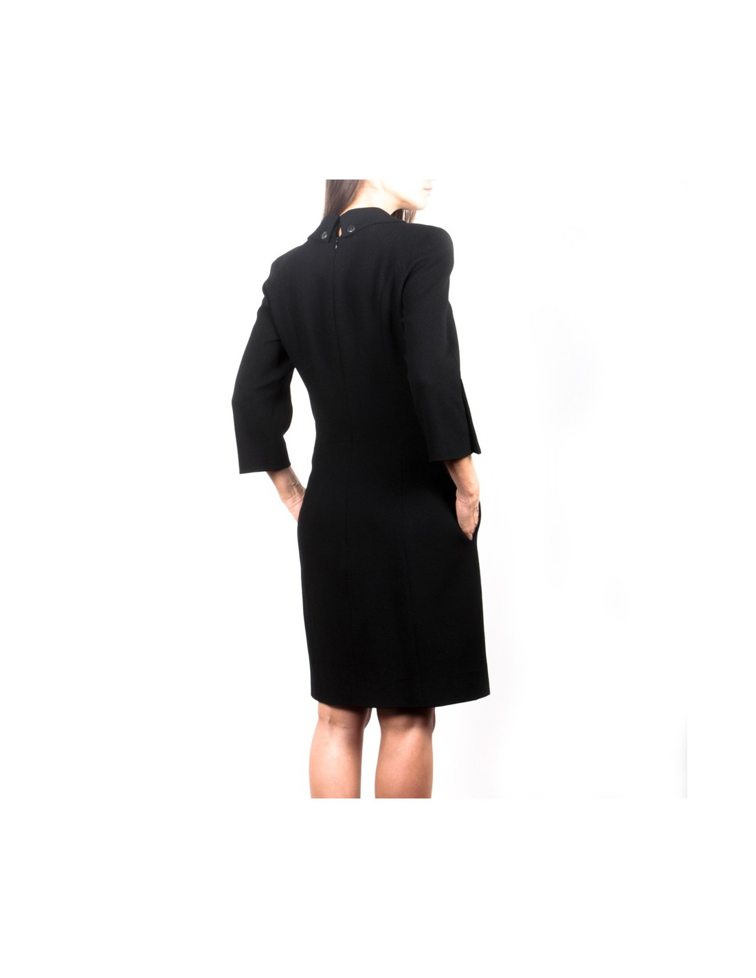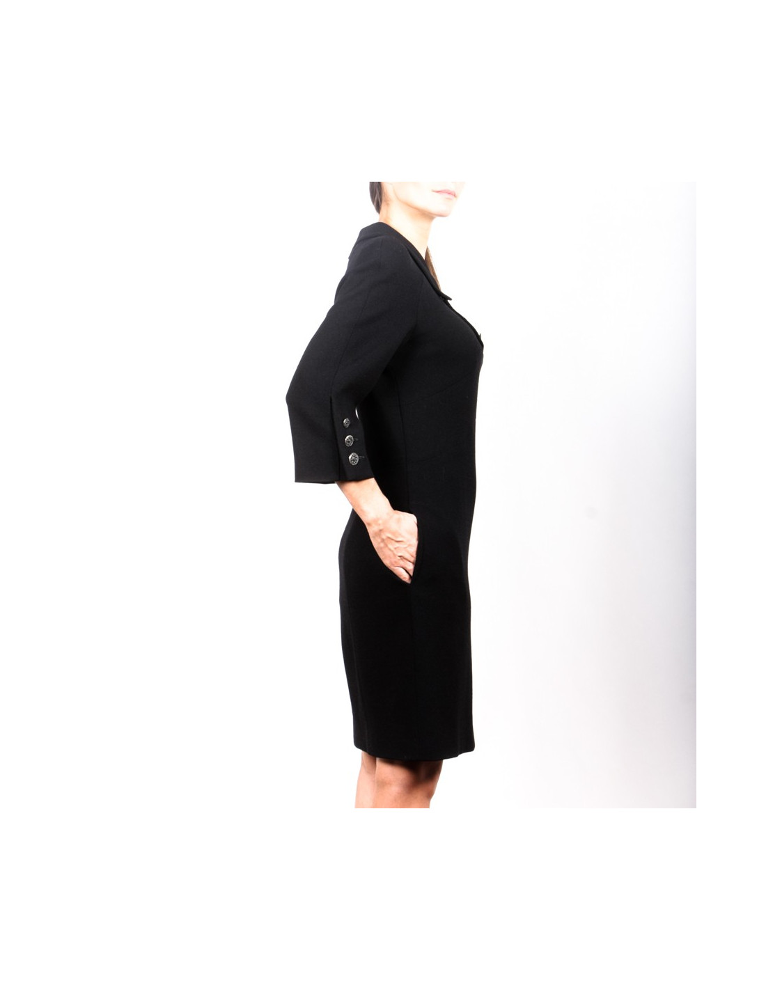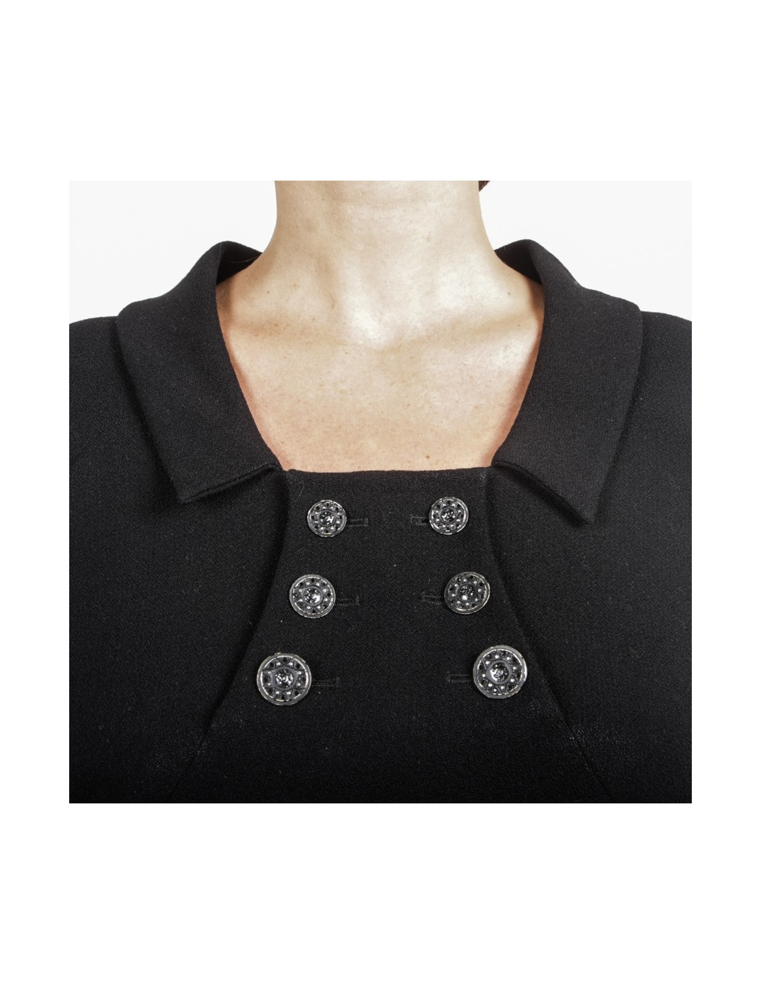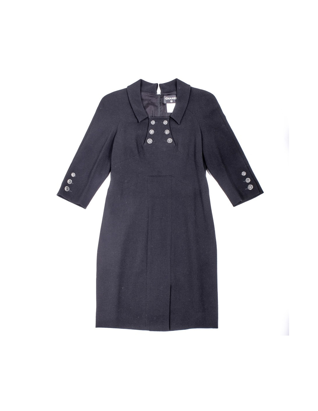 Dress Chanel Black wool with cuts and 2 vertical pockets on the sides. < br / >It is decorated with 6 buttons at the neck in front of black metal < br />It closes with a zipper in the back. The sleeves are 3/4. < br / >The lining is black silk with Camelia, CC and Chanel signature patterns. In very good condition. < br />Flat dimensions: width shoulders 44 cm. chest 47 cm. Size 42 cm. hips 52 cm. < /p >