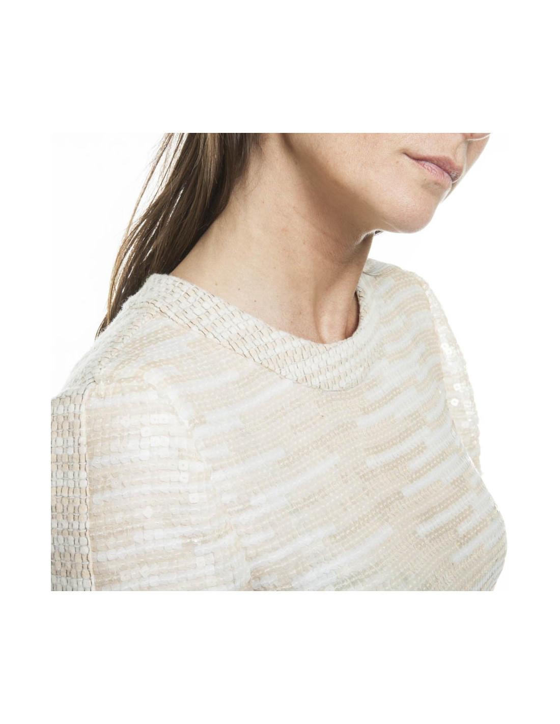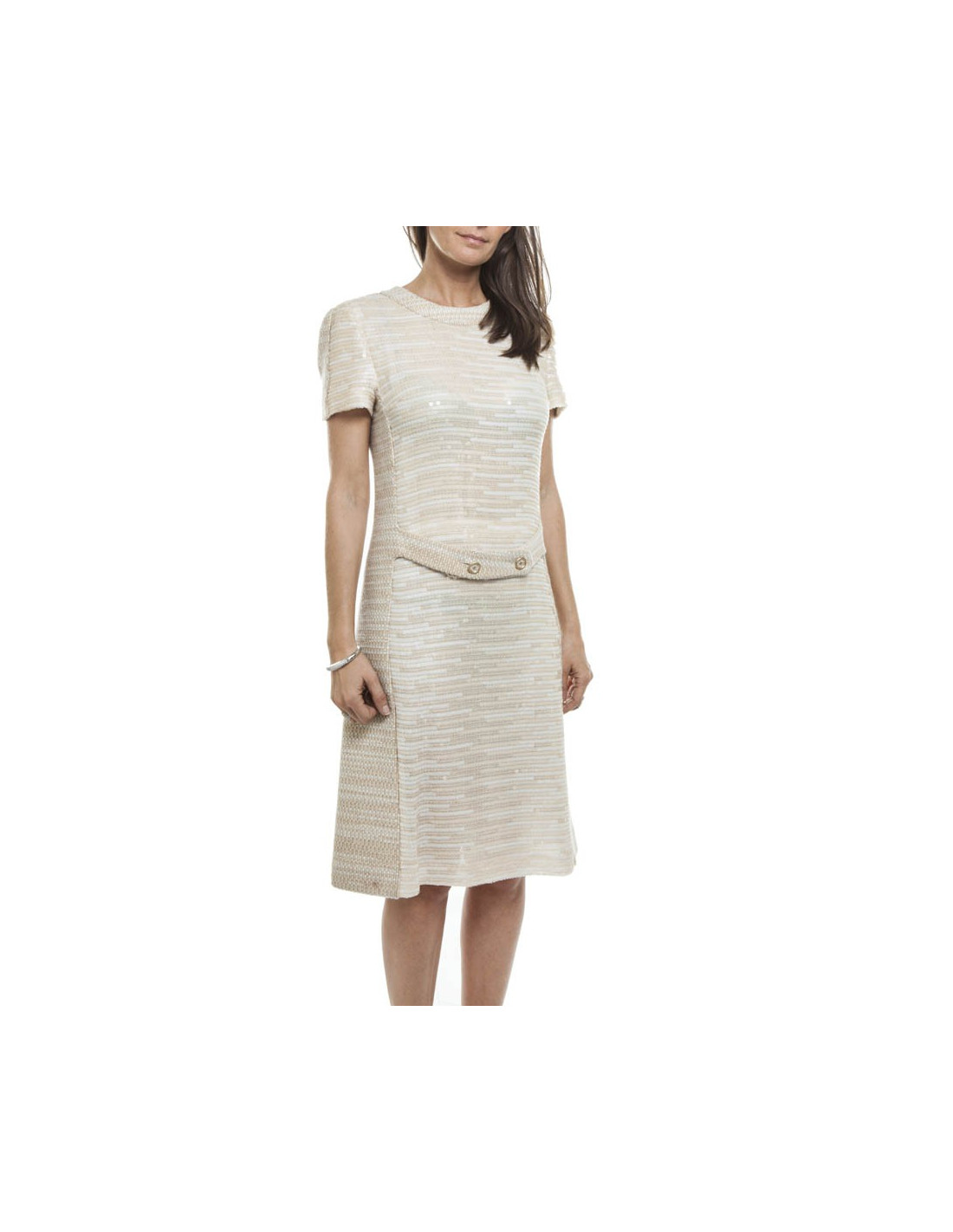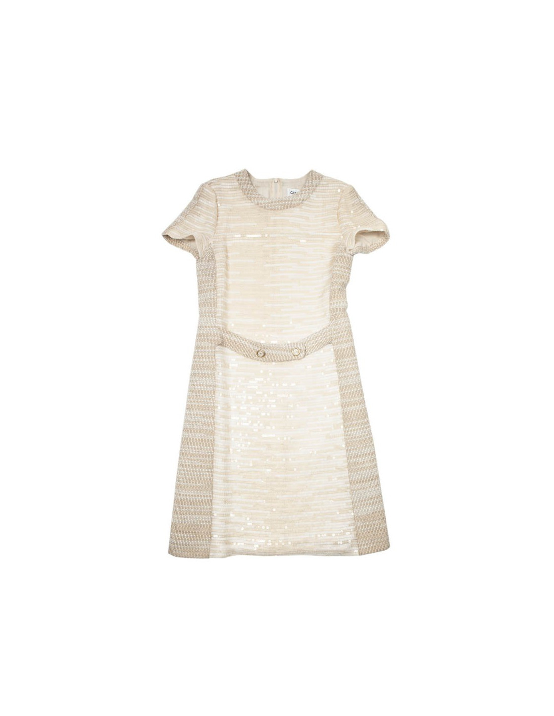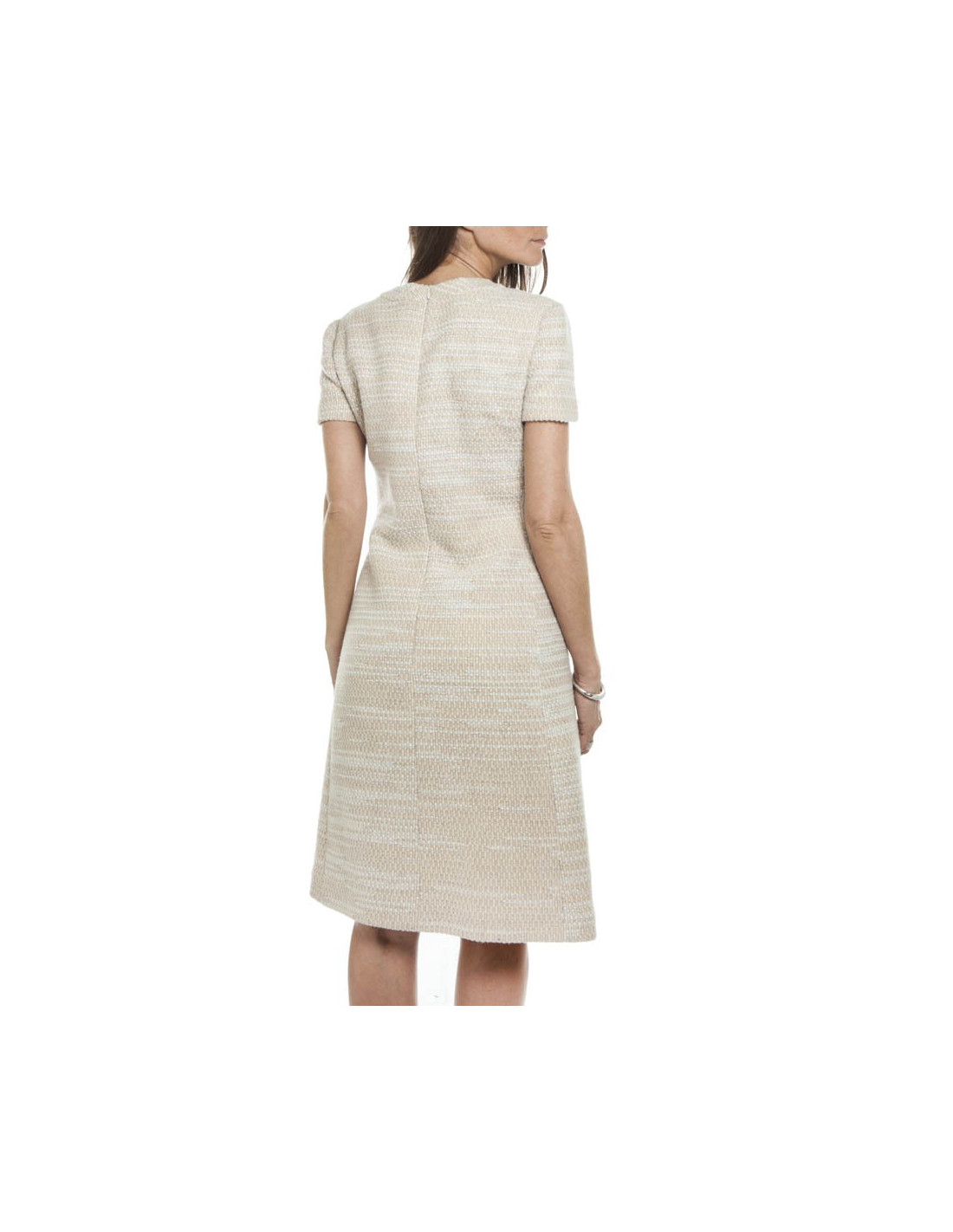 Dress in tweed wool and mohair in shades of beige, embellished on the front part of the same tone sequins. Zipper in the back.
