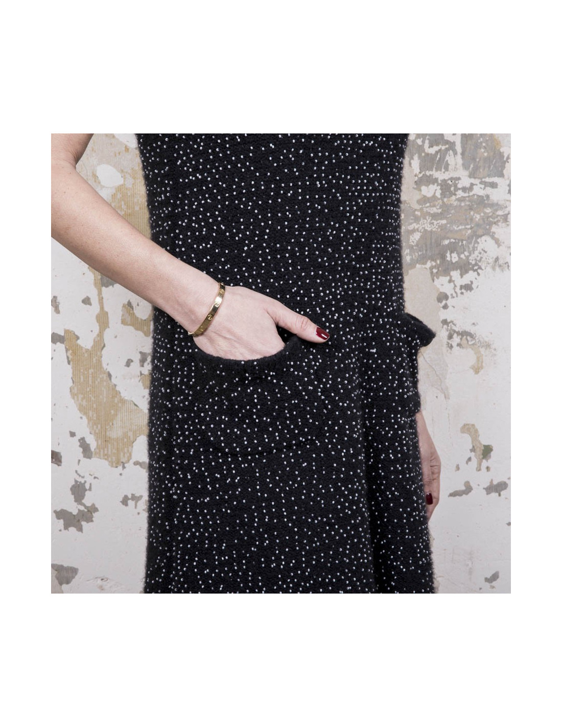 -250.00 € Sold DRESSES CHANEL T 38 tweed dress black and white CHANEL 16659 685.00 € 935.00 € Dress black and white Chanel T 38, with neck and edges of the black sleeves. Tweed wire and perforated cotton fabric. Round neck. Two front pockets. The dress fitted with zipper on the back. ' balances s. Very good condition. Shoulder width: 38 cm, chest: 42 cm, size large hips: 47 cm, height: 95 cm, sleeve length: 12 cm. View