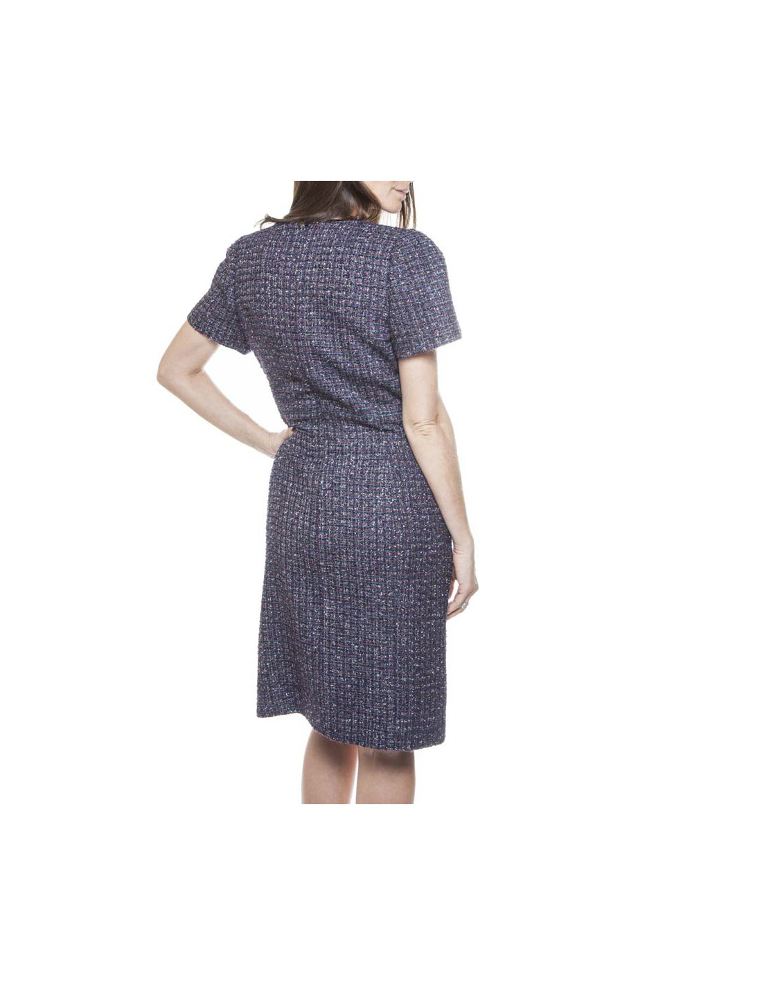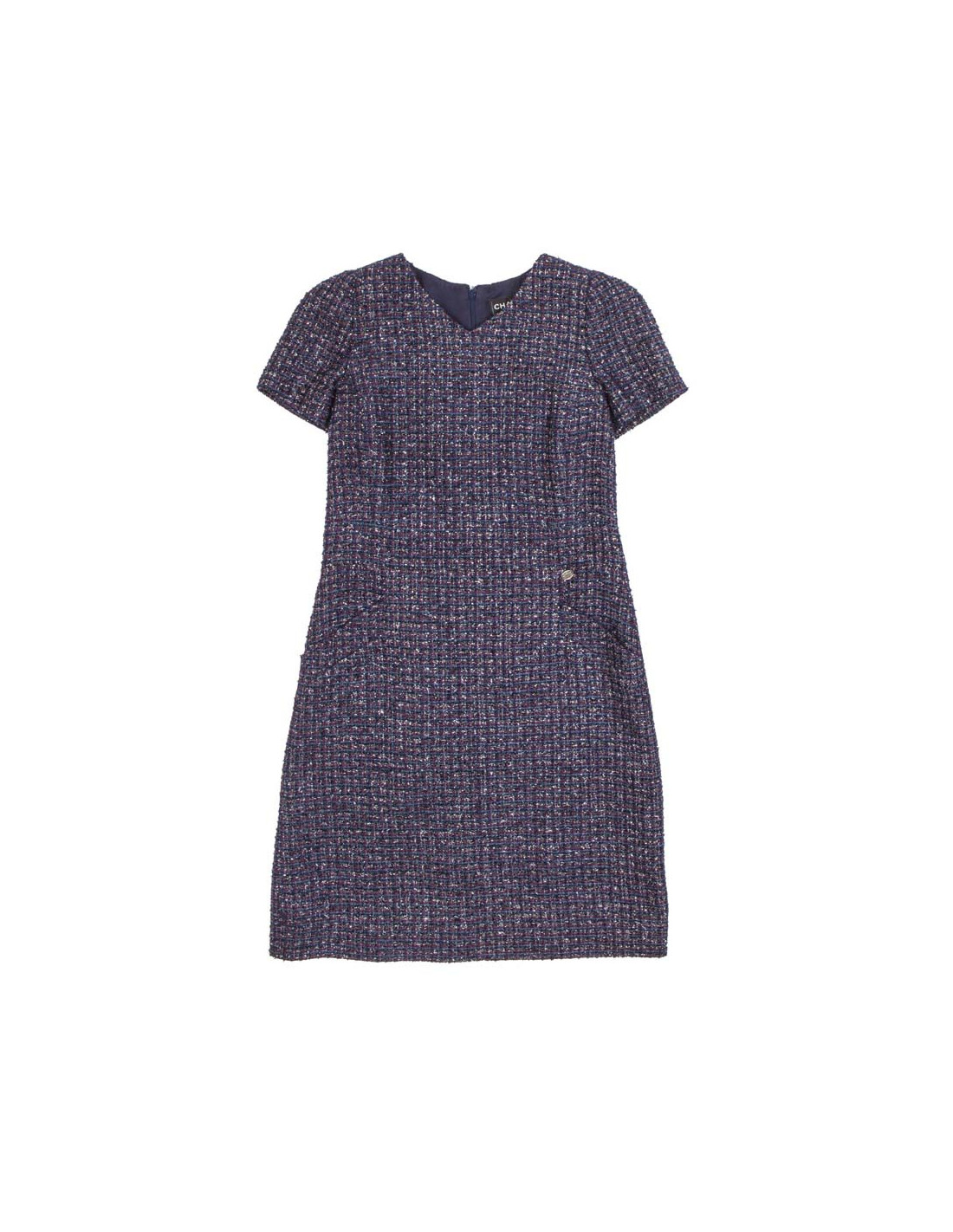Dress Chanel Tweed purple, green, Navy Blue and silver T 42 short sleeve polyester lined silk monogram with two pockets on the front in very good condition. the size is marked by a band of tissue.