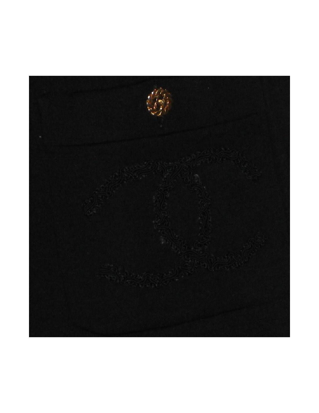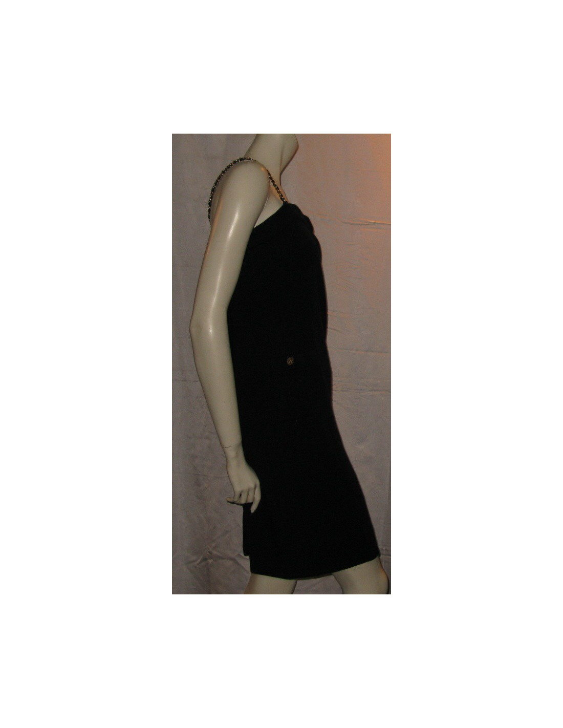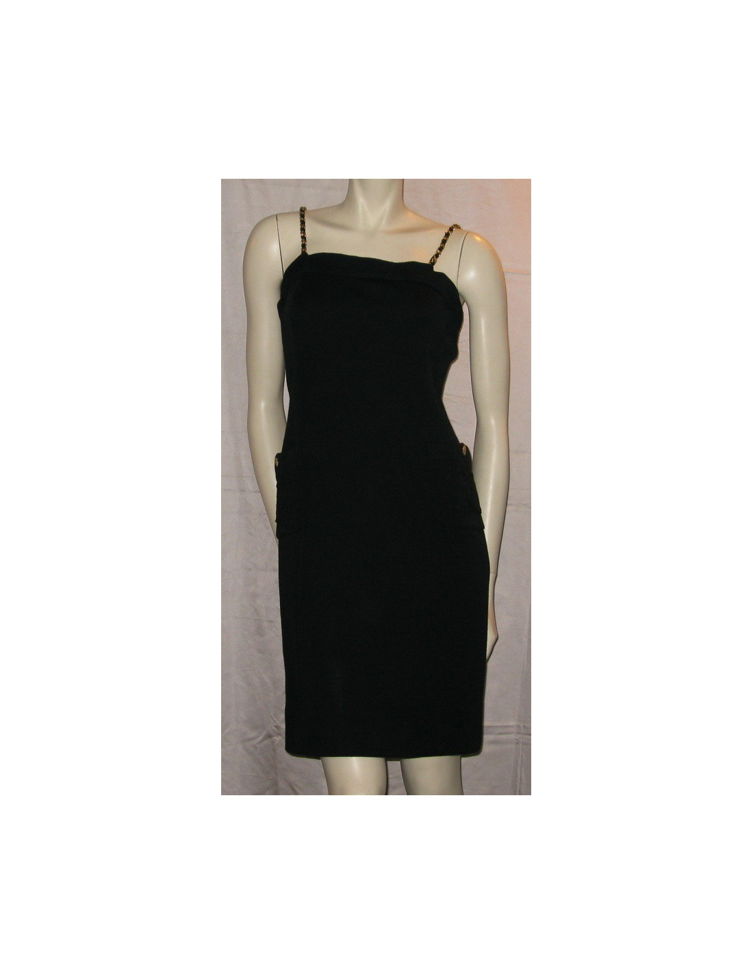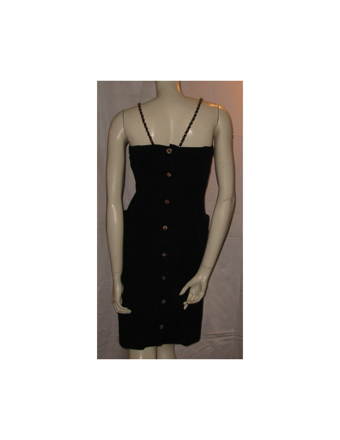 2 pockets, closed by buttons Golden acronyms CC, and embroidered CC, golden metal chains and black leather (42 cm) straps, black silk lining.This dress opens completely at the back and closes by 8 Gold acronyms CC buttons